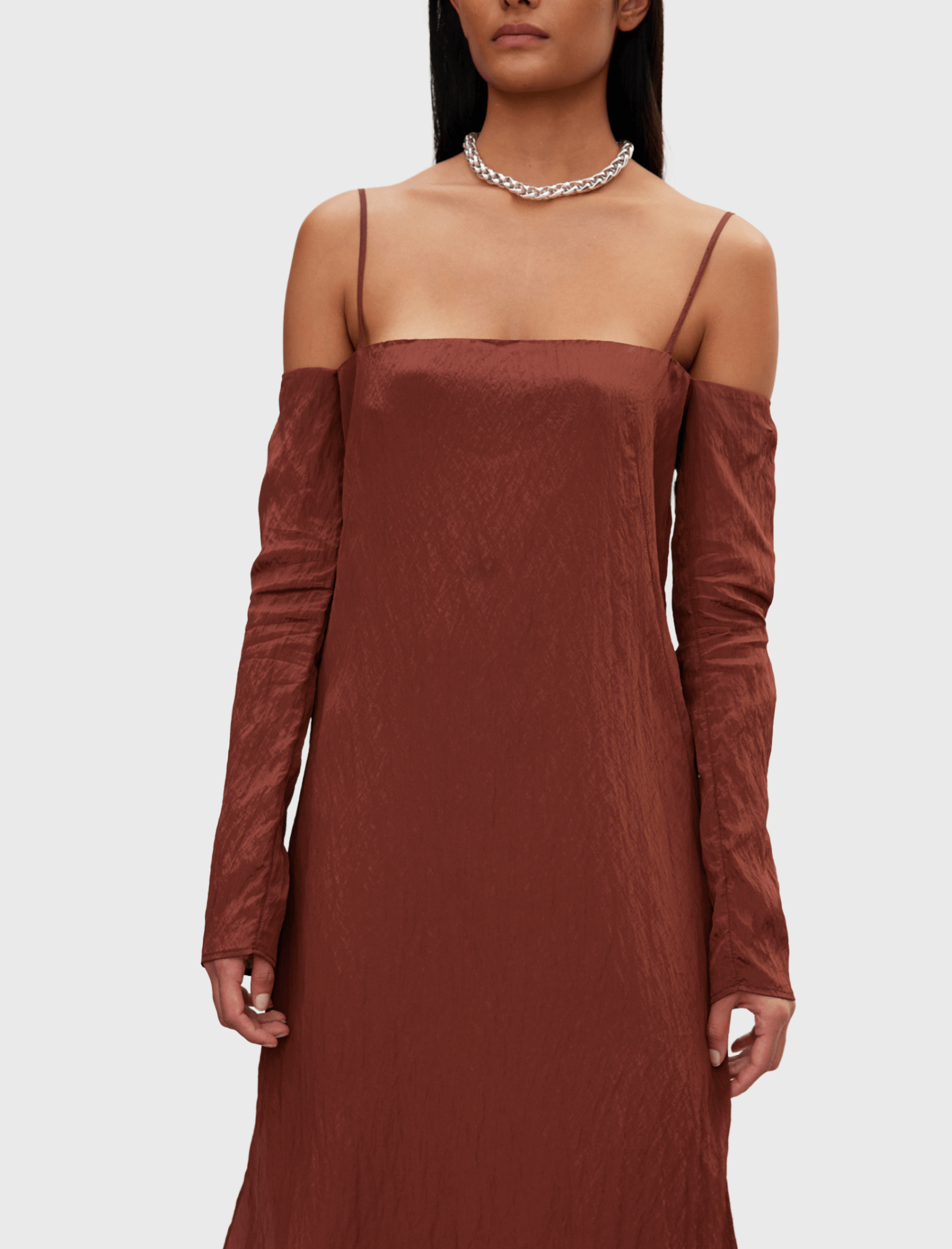 The Róhe Linnie Dress in Rust is made from 83% Viscose, 17% Polyamide