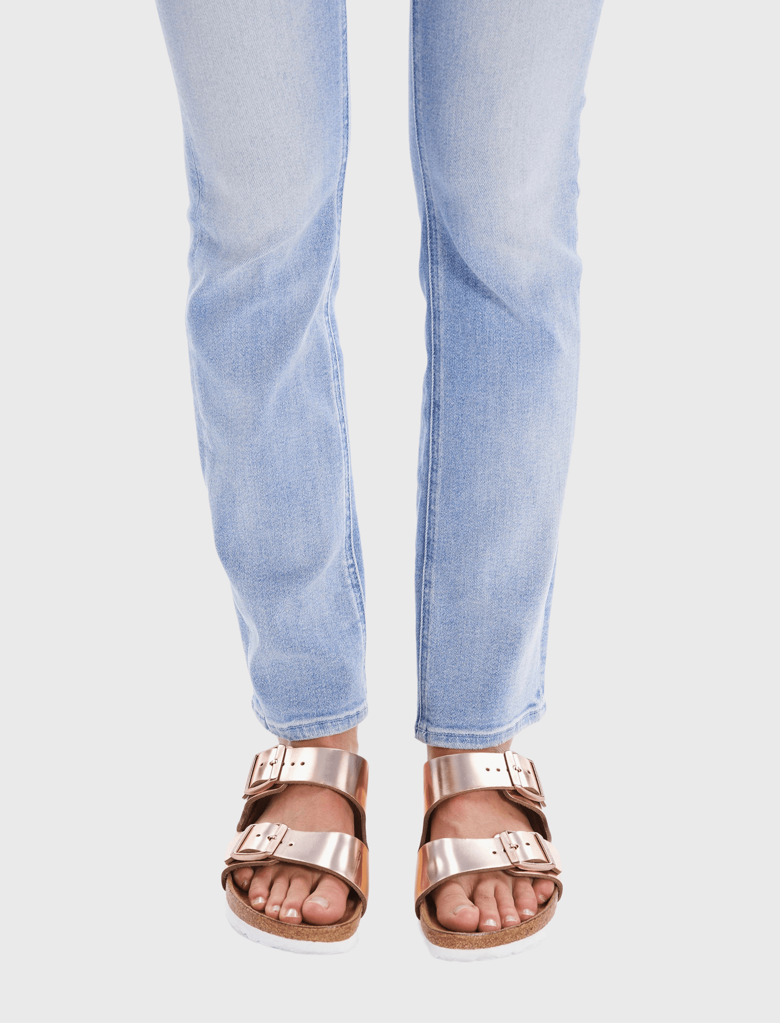 A fresh straight leg jean in a buttery soft pale blue wash. The Mother Denim Mid Rise Dazzler coming here in the wash Sweet Petals is the ultimate everyday denim style. The slightly shorter flood ankle is perfect for showing off your sneaker or boot style, while the stretch denim fabric will hold it's shape while being totally comfortable to wear. Slight whiskering across the thighs and hips, clean hem finish.
