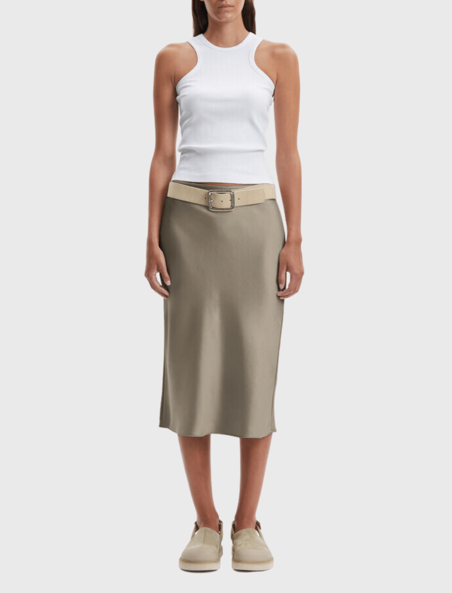 Slinky and sensational, the Samsoe Samsoe Agneta Midi Skirt is back in Silver Sage. This timeless satin skirt features a flattering midi length and is crafted from bias-cut fabric that drapes effortlessly and is finished with a loop edged elastic waistband detail.