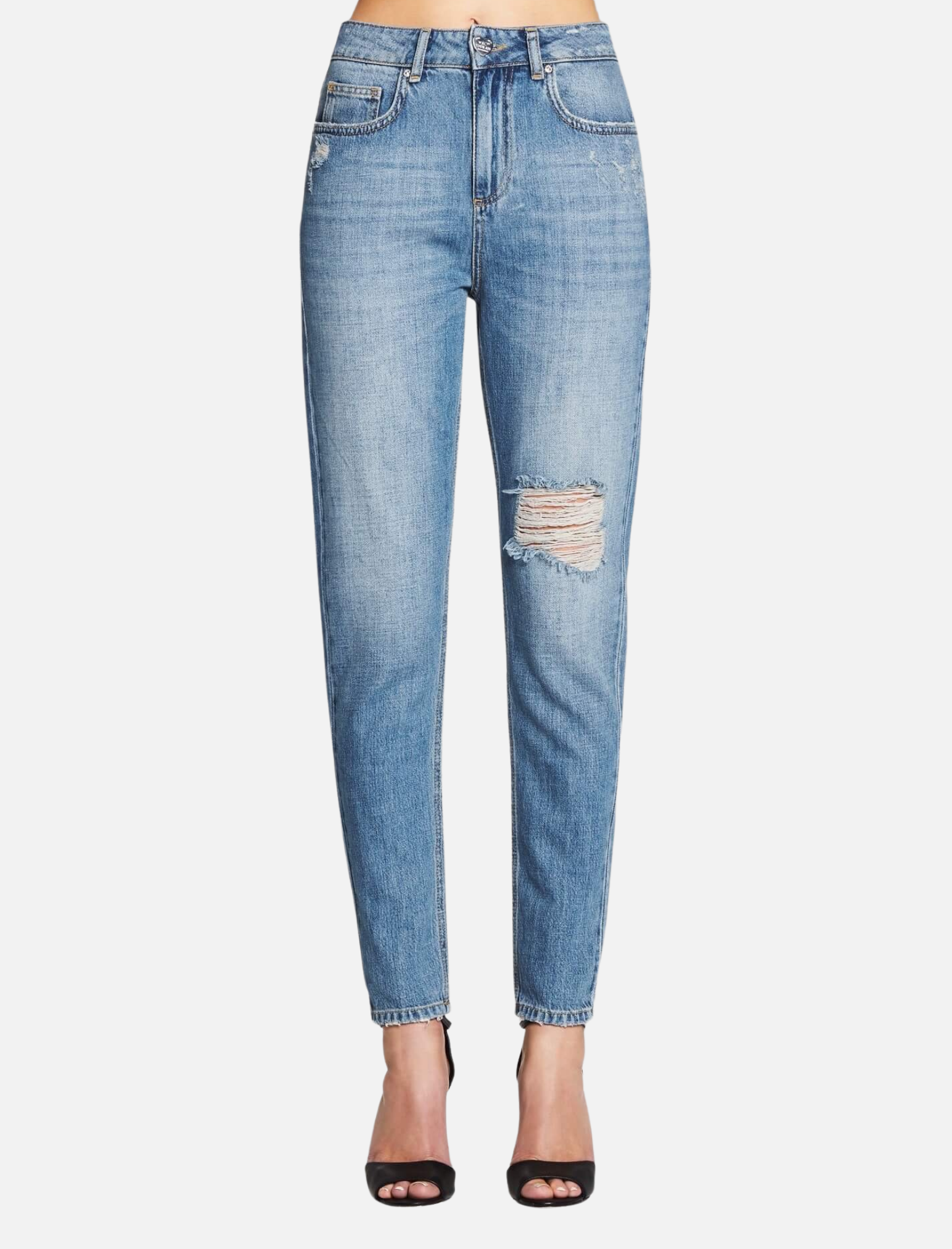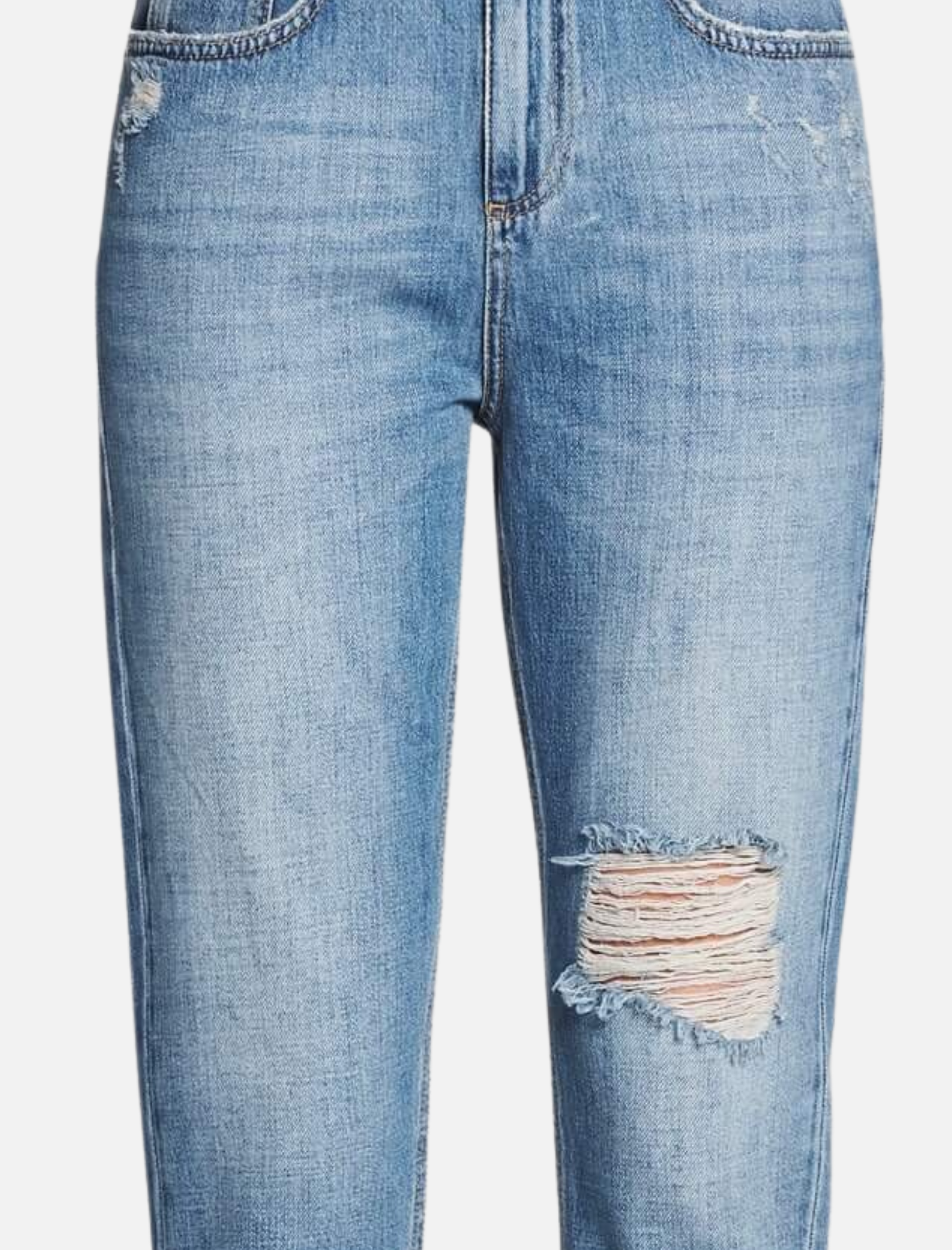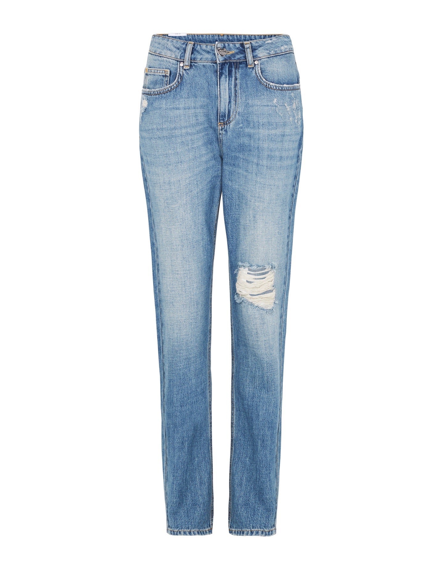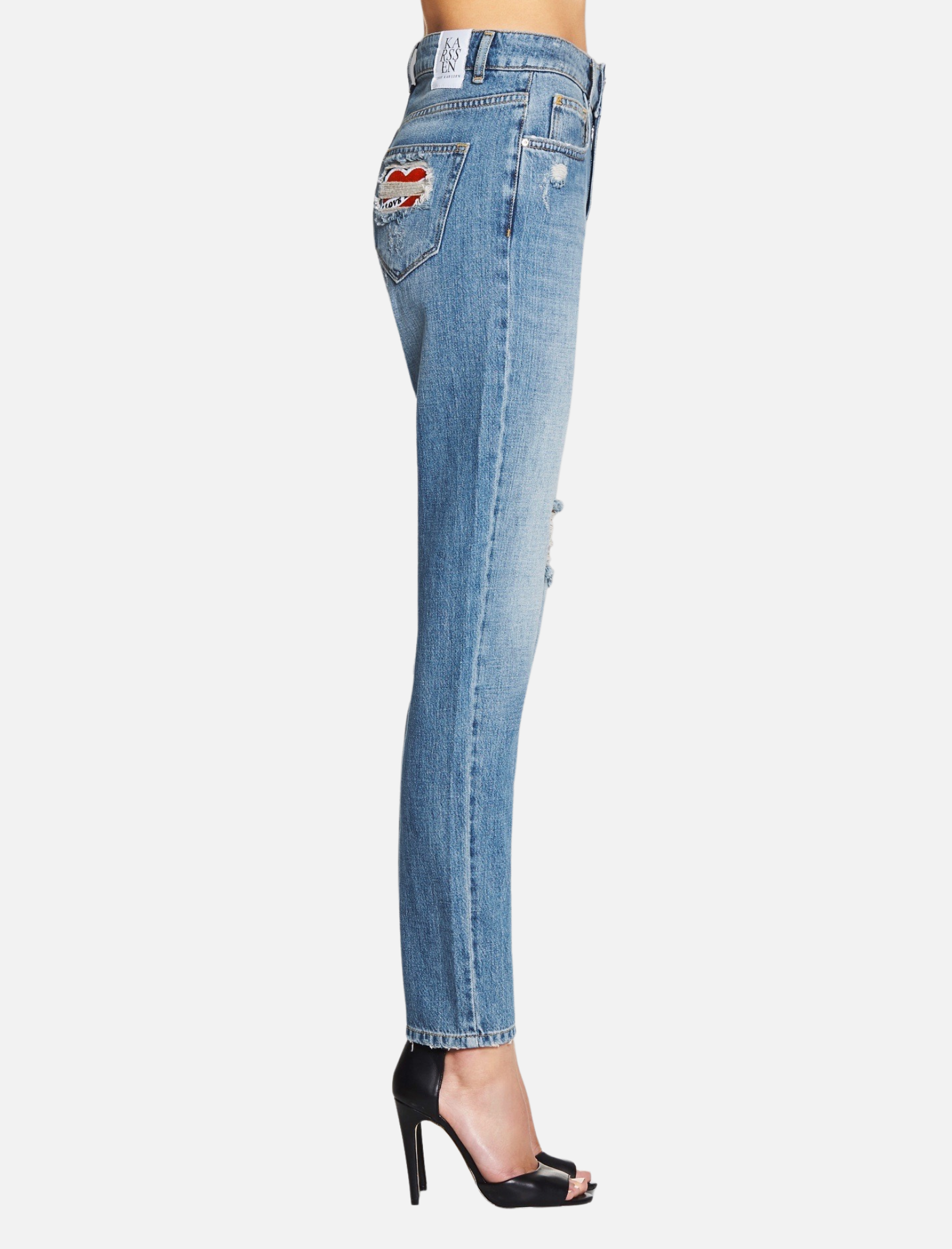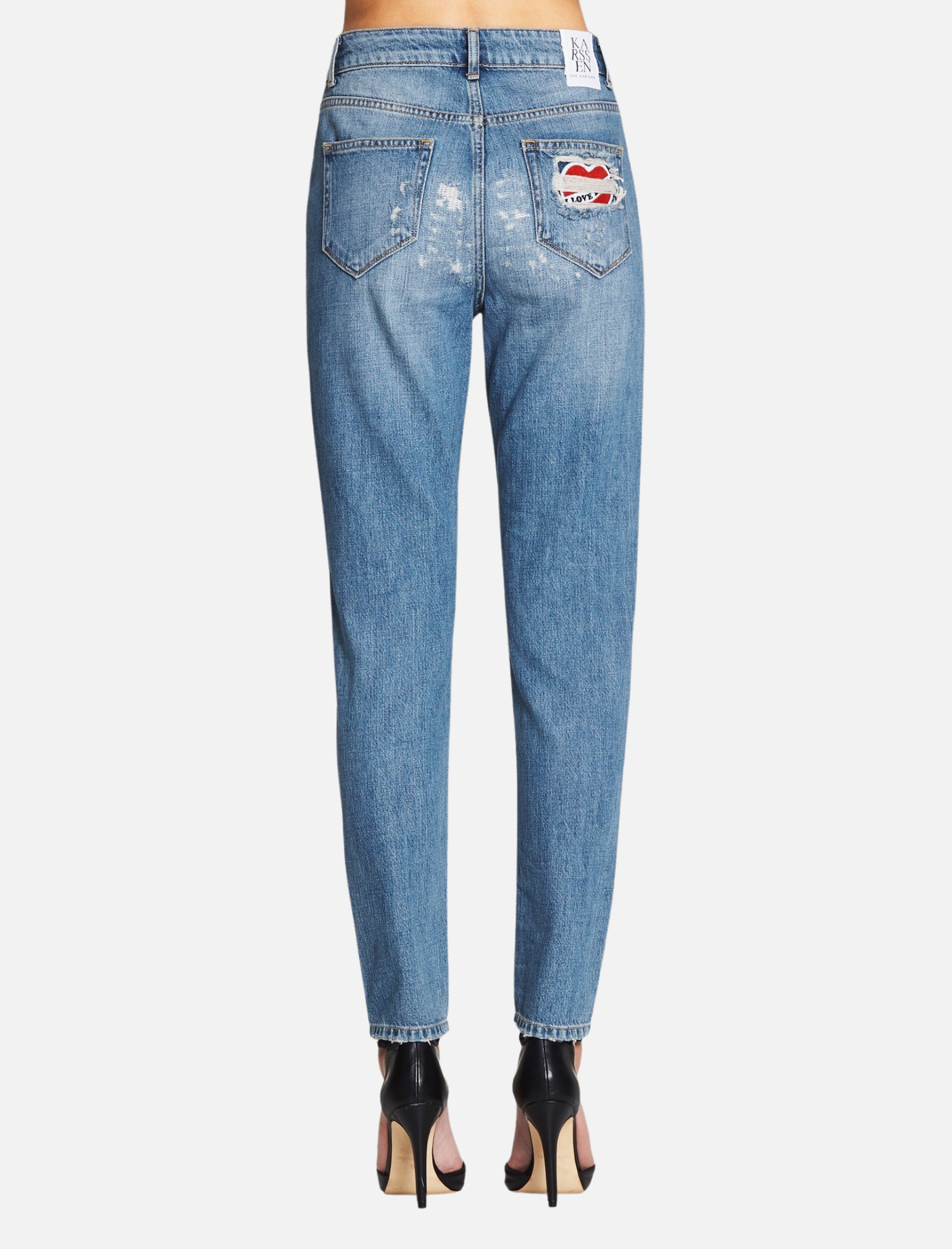 A Zoe Karssen favourite, the Janis Boyfriend Jeans are a loose fitting style with a slightly tapered leg. Here they have been constructed in a light blue denim wash with a ripped knee detail. This particular style features an embroidered design that playfully says “I Love Bikers” under a ripped back pocket.