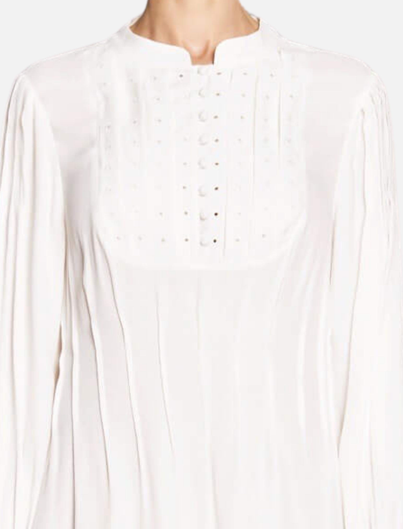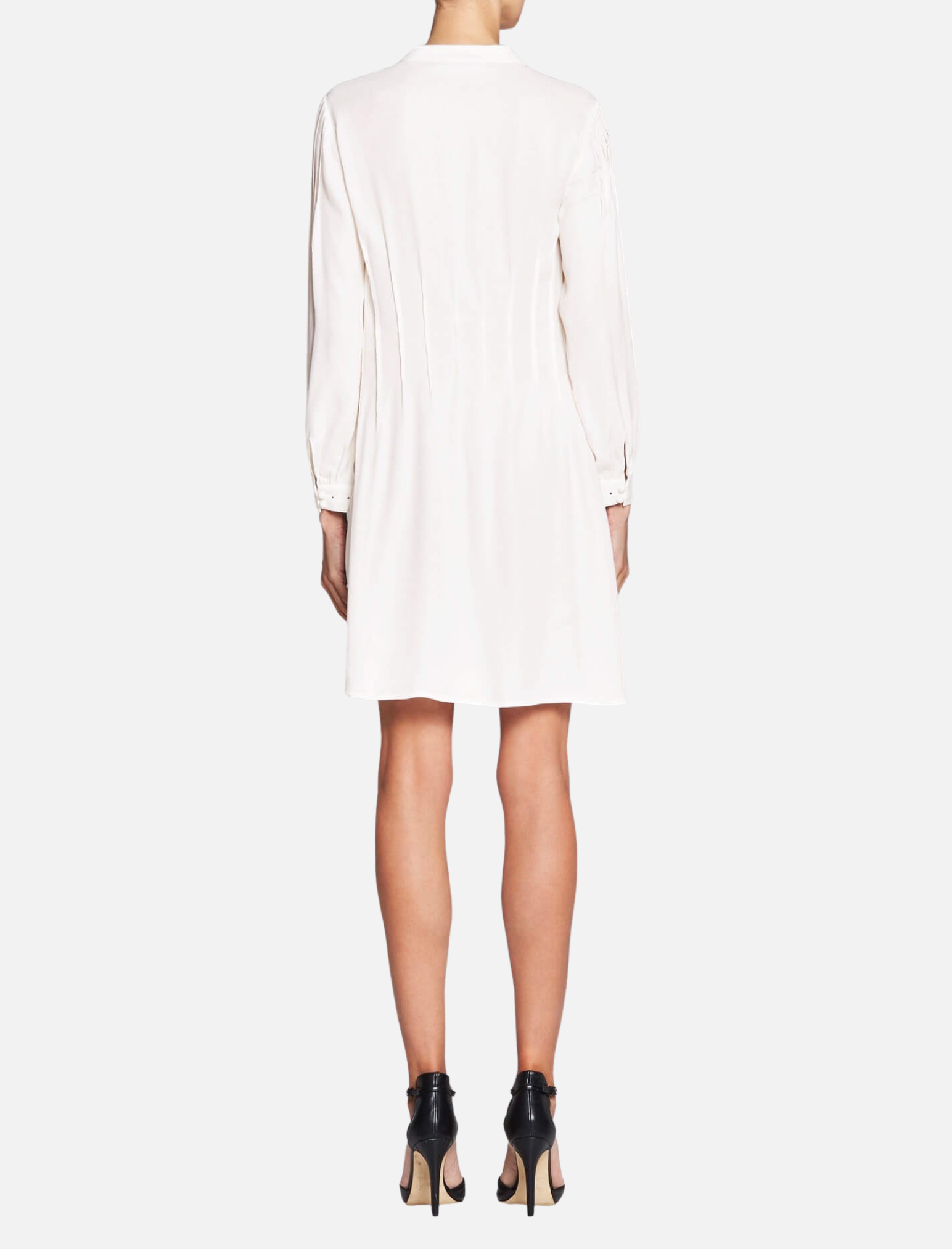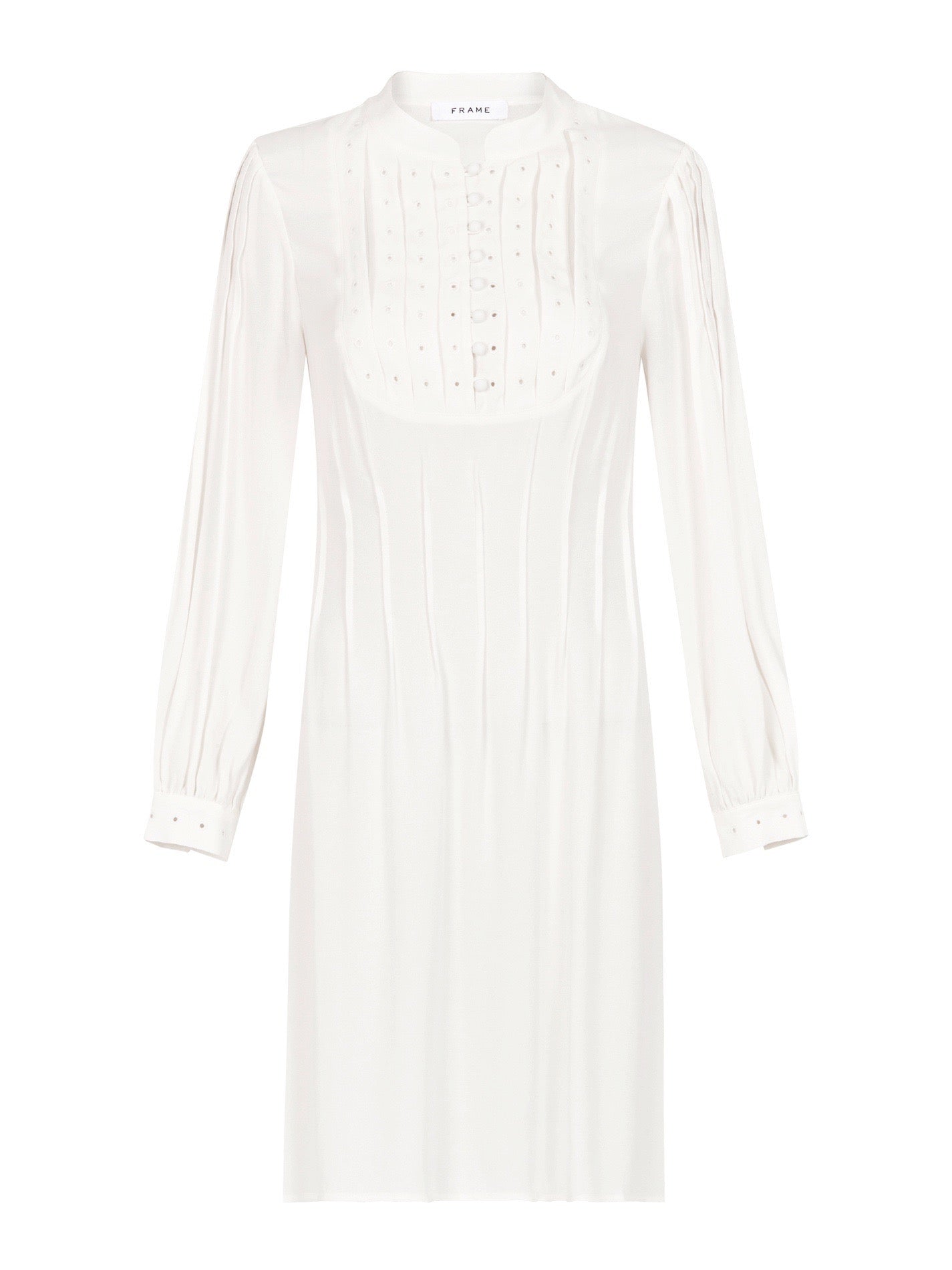 The Eyelet Pleated Dress by Frame Denim is the perfect elegant little white dress with a subtle touch of romance. Constructed from a lightweight off-white viscose, this piece features pin-tucked pleats, eyelet details, banded collar and covered button details on the front and at the cuffs. Team this long sleeved piece with some nude heels for a dreamy and classic look.