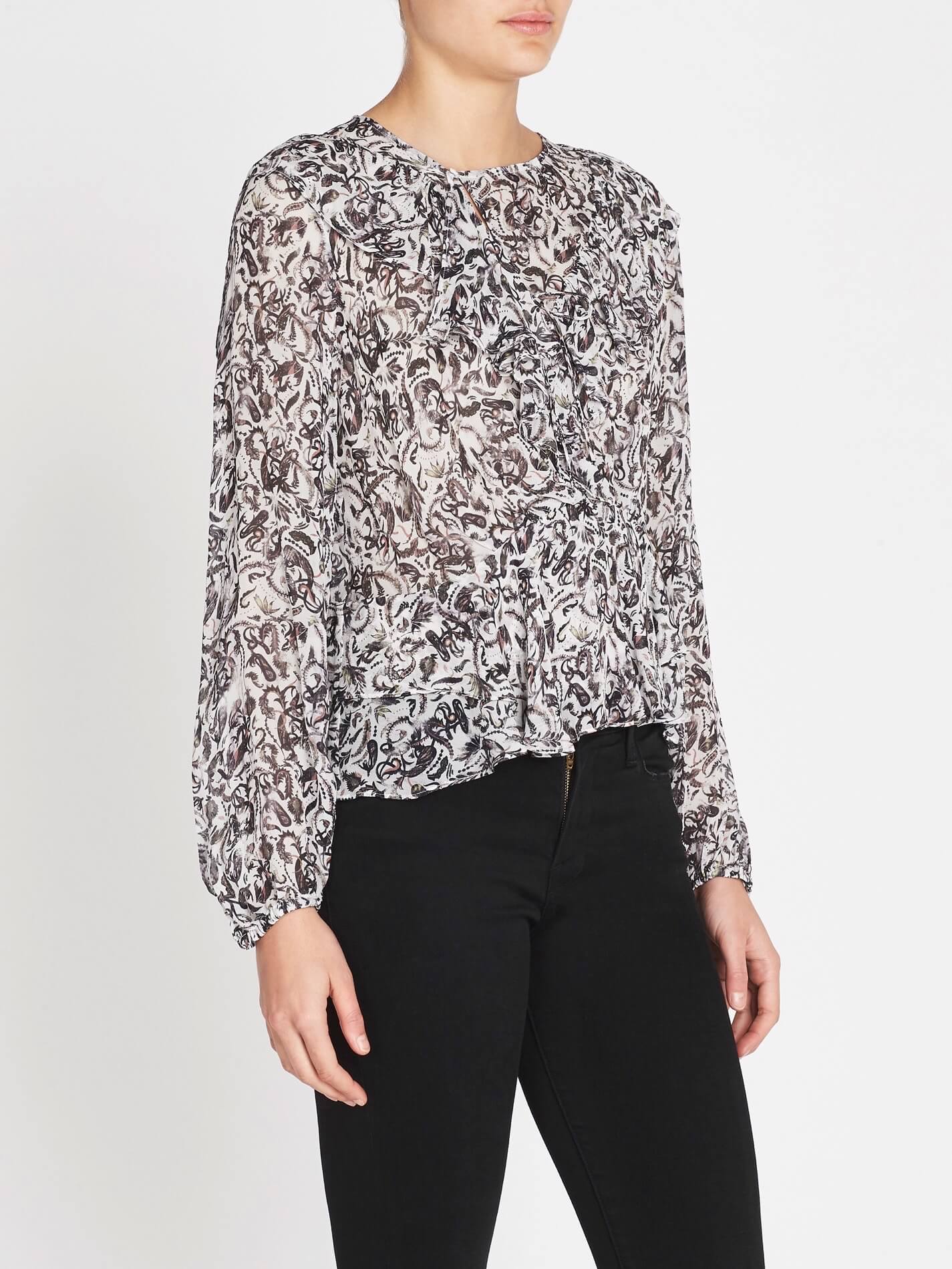 The IRO Voodoo Top in White is a stylish and chic blouse that is perfect for any fashion-forward wardrobe. The top features a mysterious dainty floral print that is inspired by 1970s paisley, creating an eye-catching and unique look. The long sleeves of the blouse add a touch of elegance to the design, making it suitable for both casual and formal occasions.