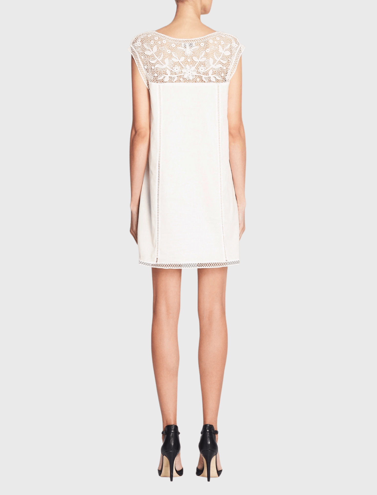 The Joie Joseba Dress in Porcelain is a pure design with a playful straight cut and mini dress length. Detailed with a delicate crochet collar.
