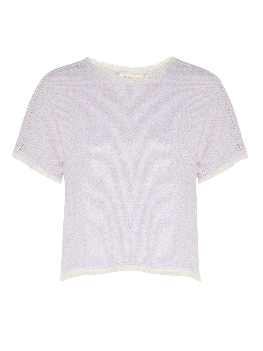 The Rebecca Taylor Short Sleeved Tweed Top is a cropped Tee Shirt style top with a back peplum frill detail, fringed raw edges at the neckline, sleeve edges and hem. The soft lilac colour makes this light weight top an easy casual option.