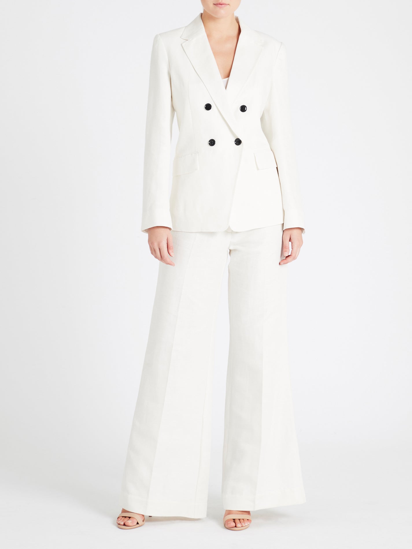 The Frame Double Boyfriend Blazer in Suiting White is made from Main: 58% Linen, 42% Cotton, Body Lining: 100% Cotton, Sleeve Lining: 100% Polyester