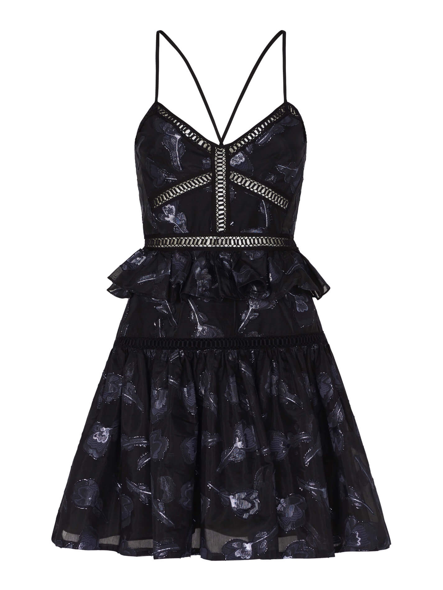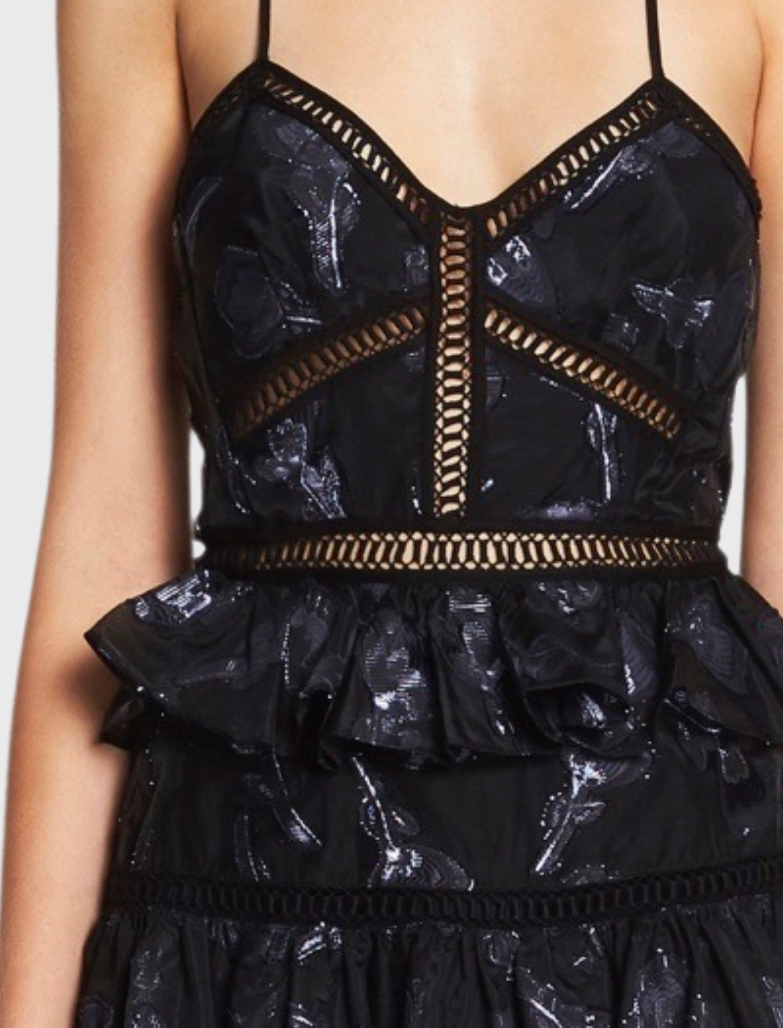 The perfect little black dress with a twist! The Rebecca Taylor Floral Jacquard Dress is the ultimate party piece for a summery occasion. Featuring layered ruffles and adjustable spaghetti straps, this playful number with glistening navy jacquard embroidery is sure to make heads turn.
