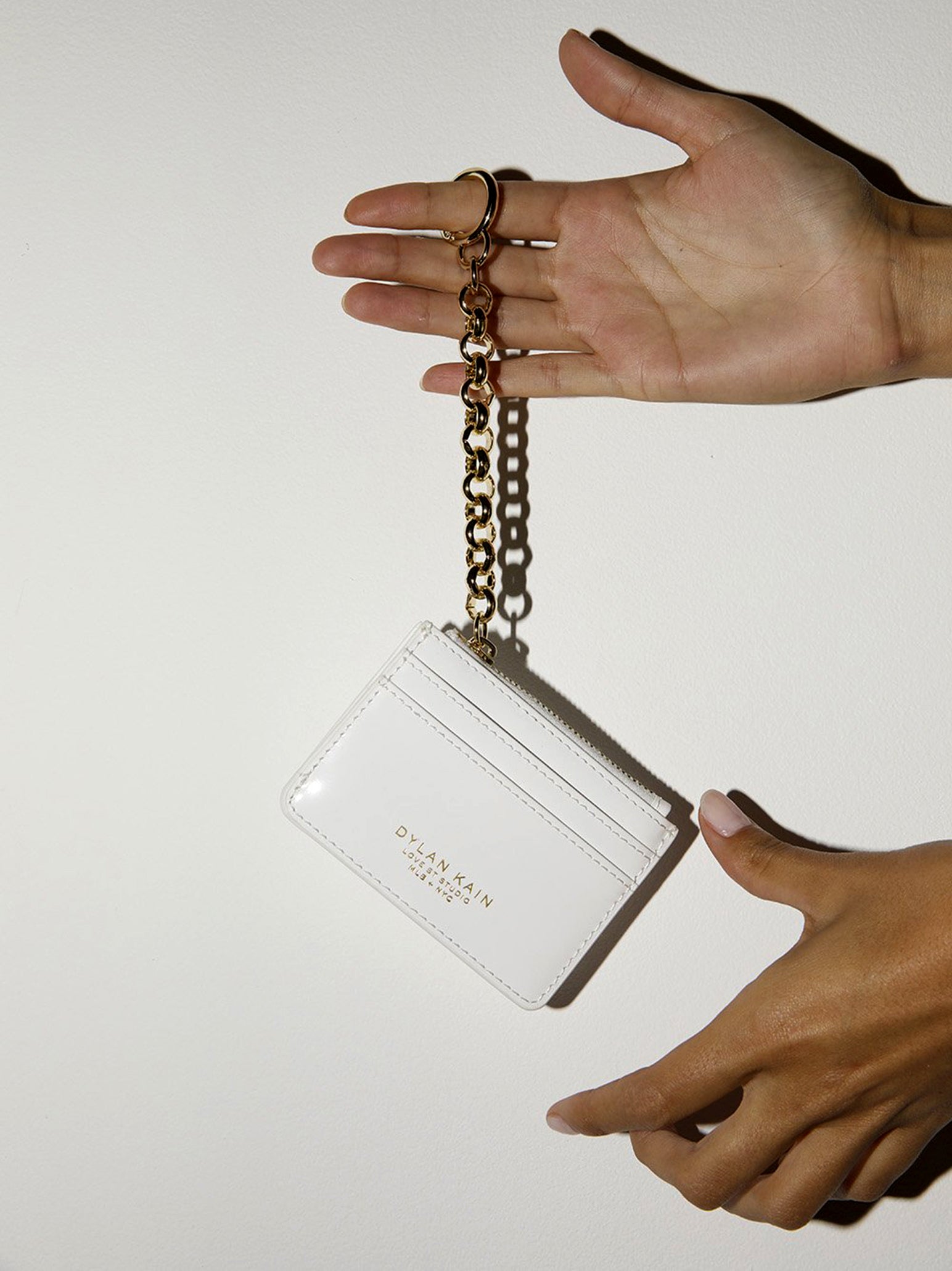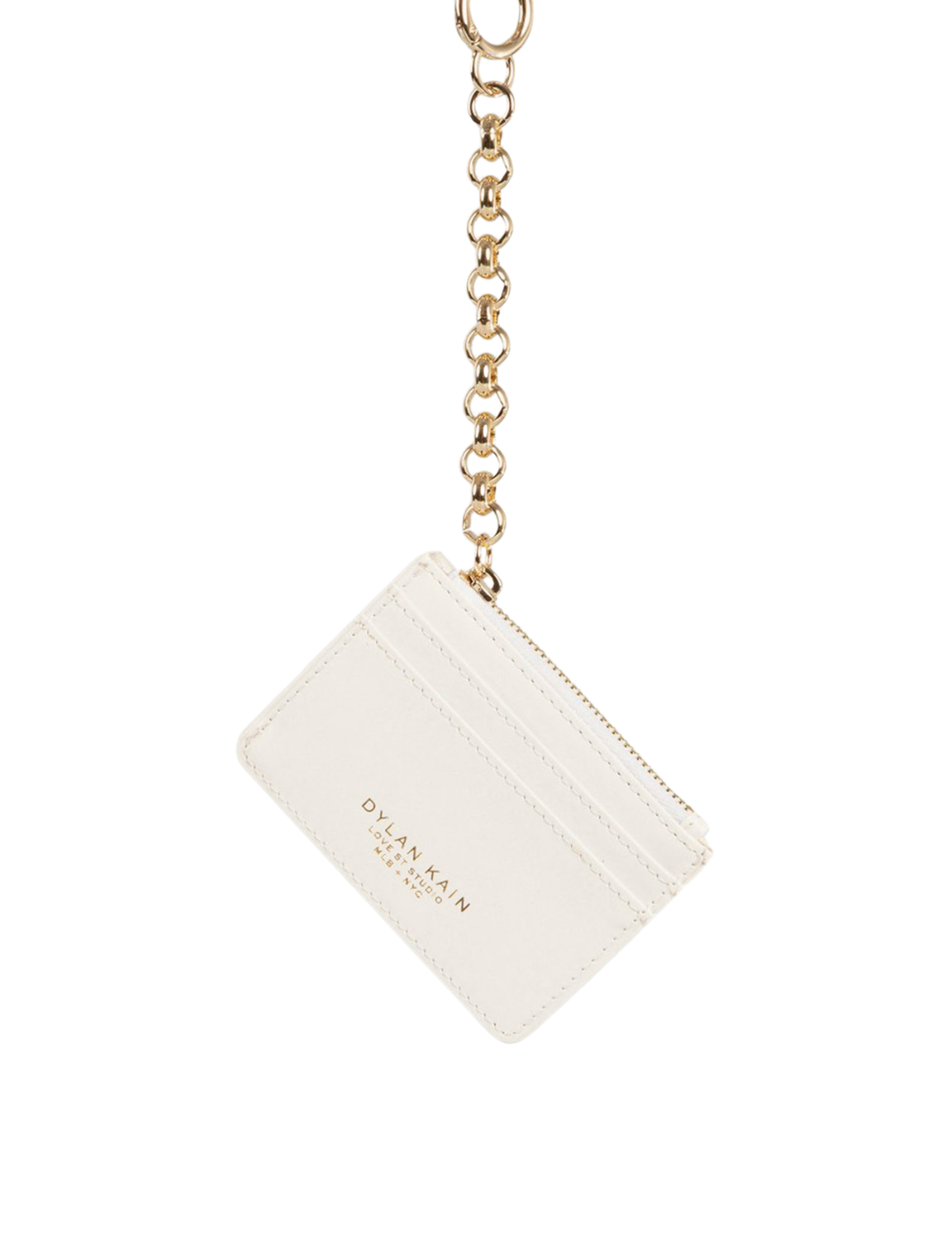 Constructed from Italian leather, the Dylan Kain Palvin Card Holder in White Leather with gold hard wear is the perfect petite sized accessory to keep your cards organised. Small enough to fit into your coat pocket or clip to your favourite handbag this card holder is a year round winner. This piece features four card spaces, a top note pocket, gold chain with spring clip and is finished with contrast white stitching and a print of the iconic Dylan Kain logo