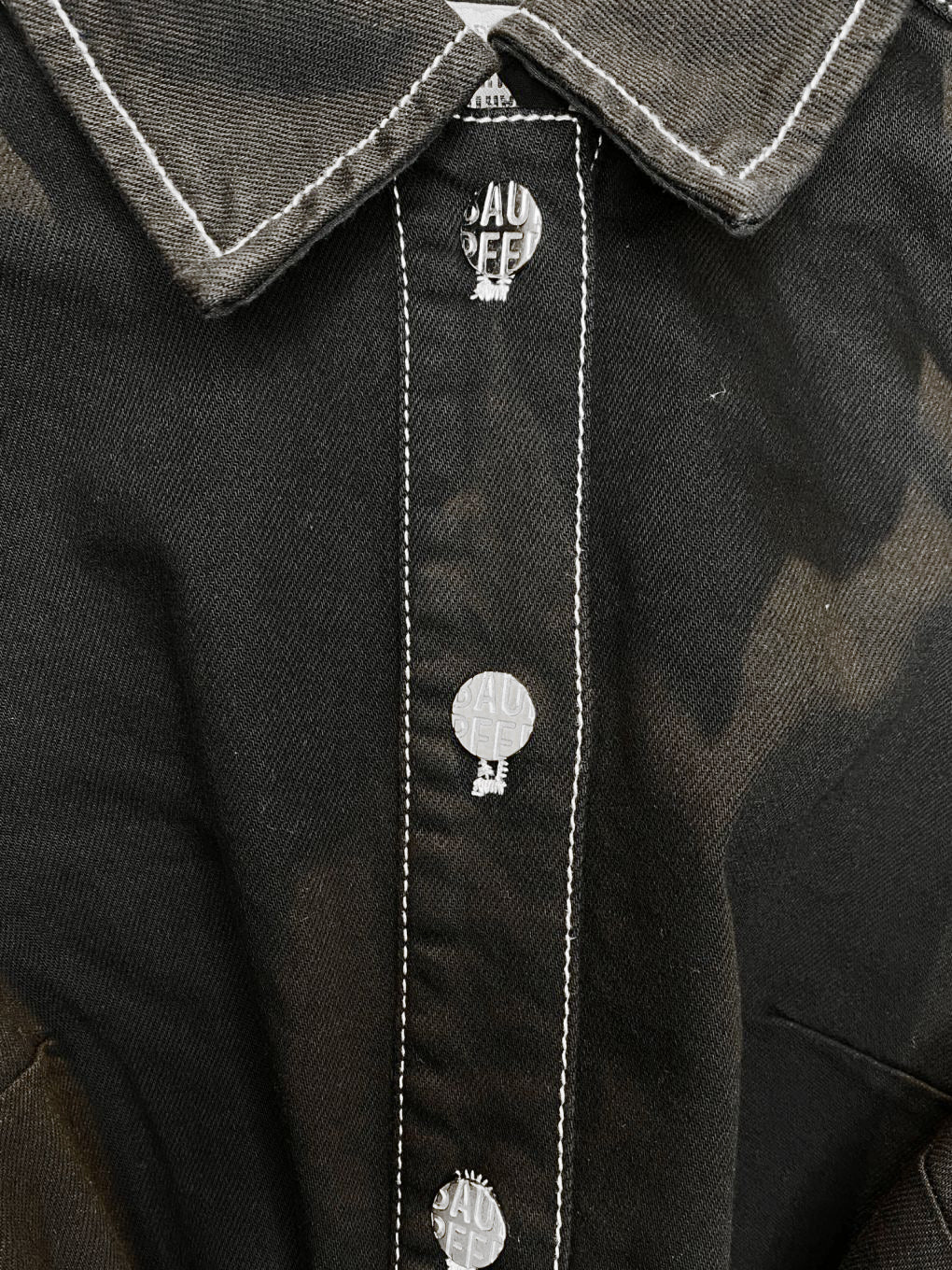 The Ananda Dress from Baum Und Pferdgarten is a classic feminine shape but with a street style edge. This midi length shirt dress with a short puff sleeve and a waistband tie is completed with shining silver branded buttons and white stitch detail. Made from a heavyweight denim like fabric this dress is the perfect piece for tran-seasonal weather.