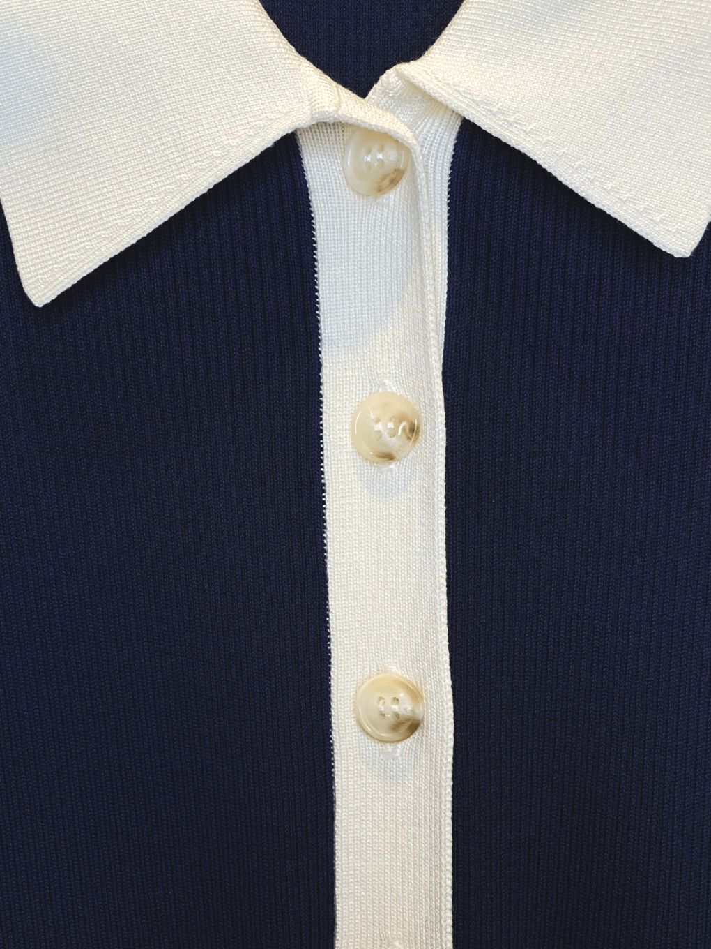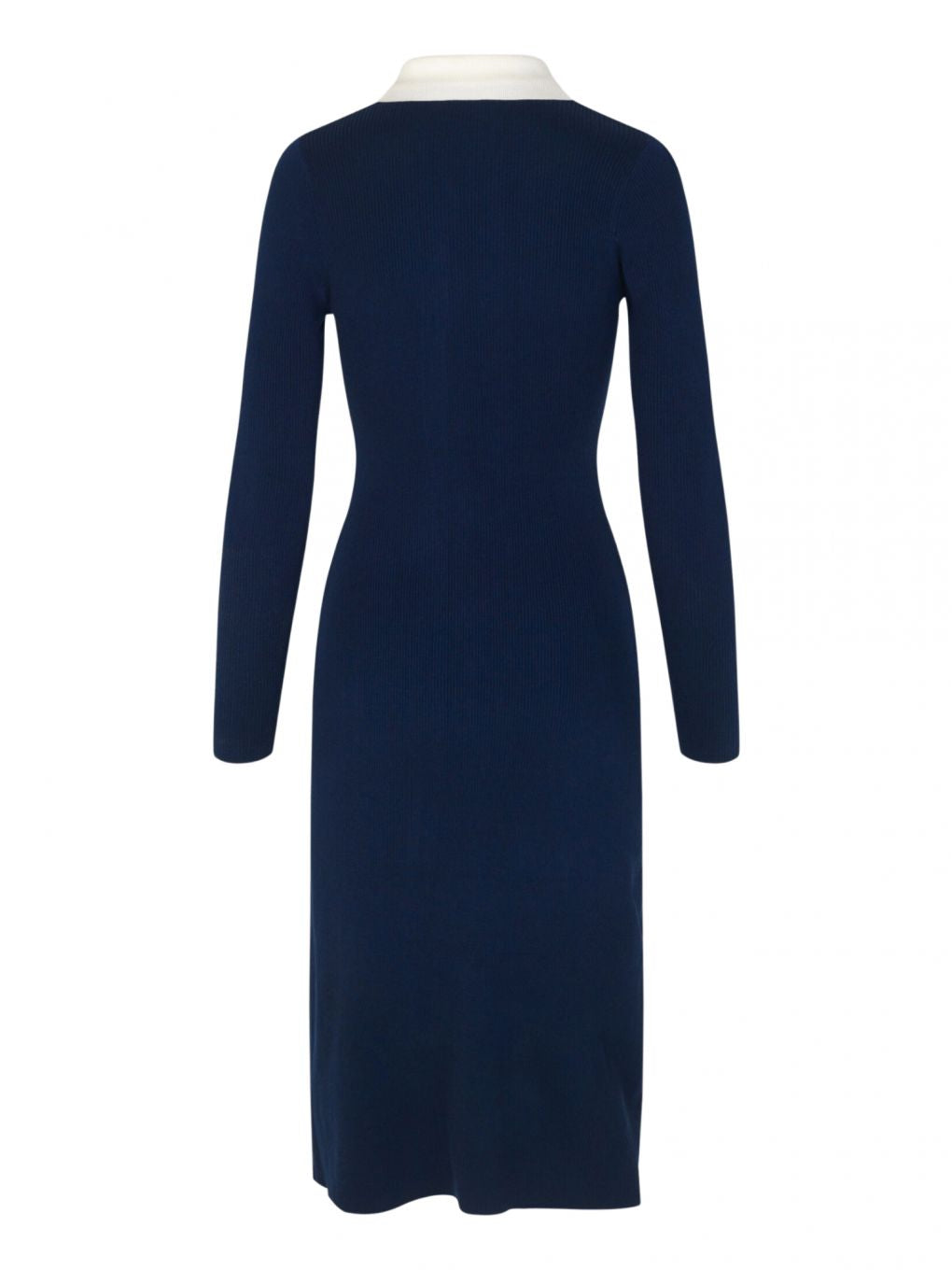 The ultimate between season piece the Casja Dress in Navy Blazer from Baum Und Pferdgarten is a ribbed knit cardigan style dress. Featuring long sleeves, contract collar and button placket. This midi length knit dress is form fitting and has a side hip embroidery details reading UND. Do double duty and wear this open like a long line cardigan over jeans and a tank top.