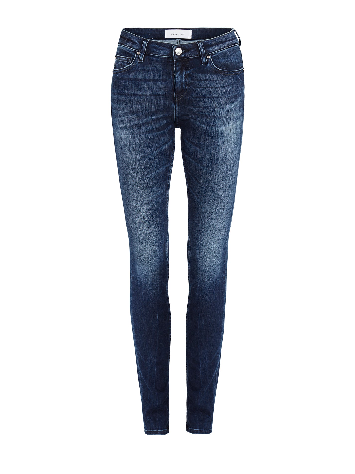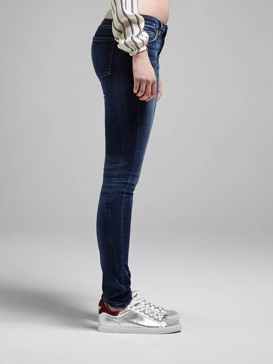 The Flesk Jean from IRO Jeans are a super soft faded wash denim, with a skinny leg cut and a low rise of 8.5 inches. With their whiskering along the hips, inner thighs and on the left calf, and with their silver hardware, these jeans are full of detail.
