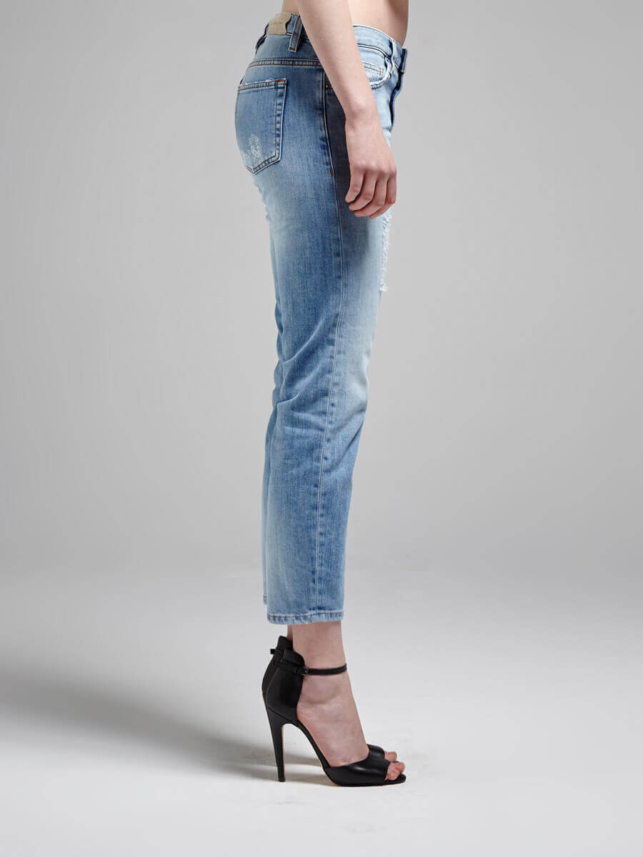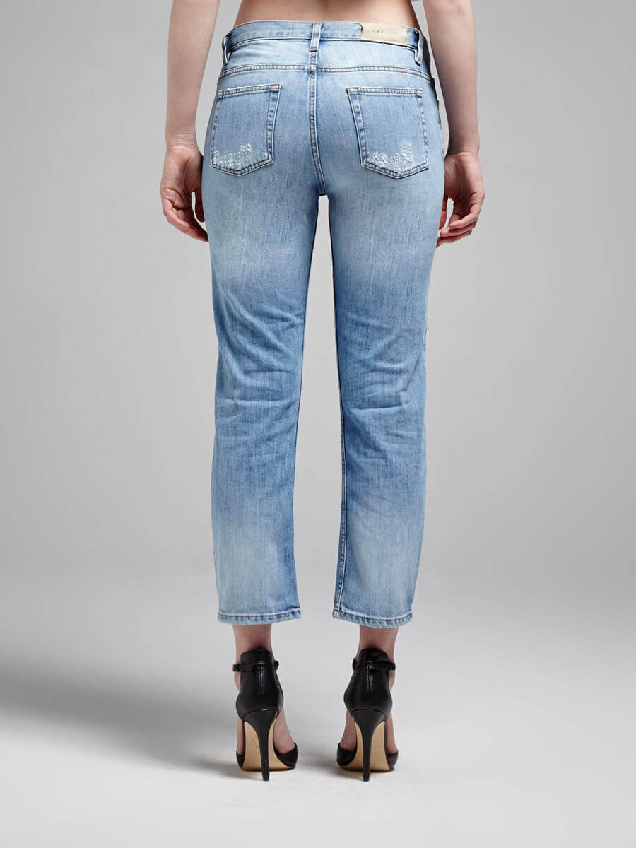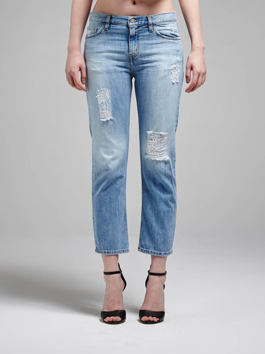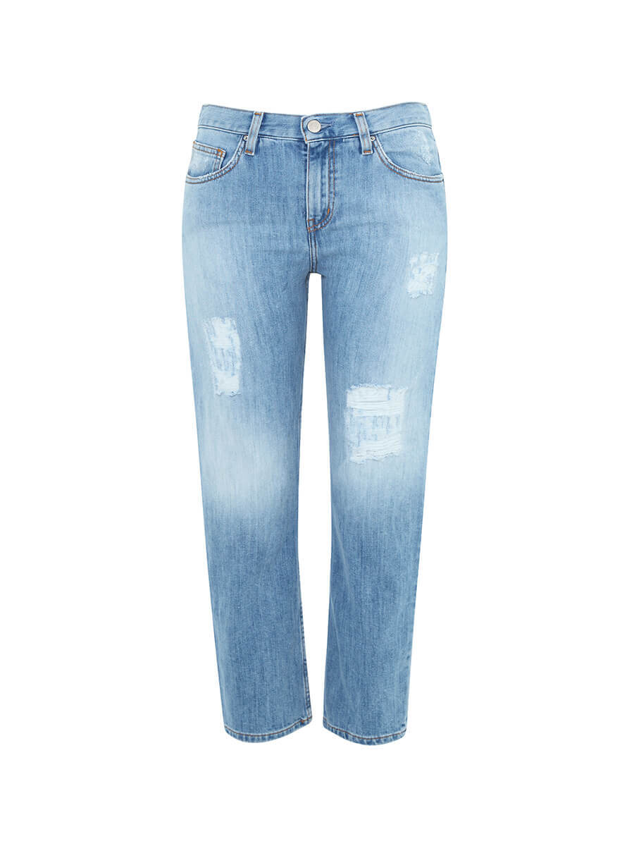 A killer crop boyfriend jean from IRO Jeans. The Nalyn Jean in the colour Blue Denim have a low slung waist, 10 inch rise and twin pocket detailing at the back. These jeans feature whiskering along the thigh and faded detail on the knees. A cropped jean, they are accented by silver hardware