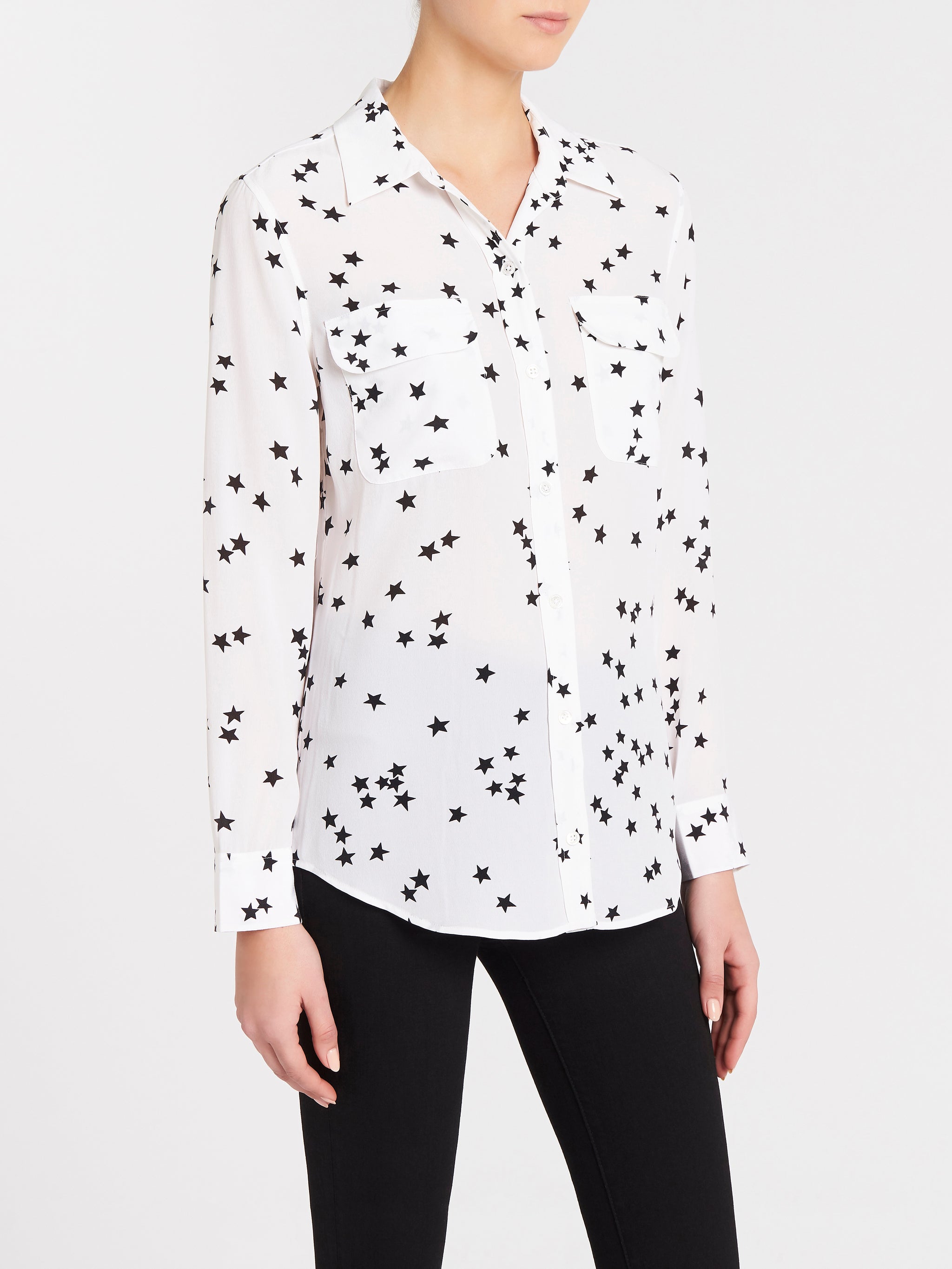 Refresh a wardrobe staple with the Slim Signature Shirt in Bright White by Equipment. Inspired by their archived original, this slimmer fitting shirt is crafted from ultra soft silk, featuring dual front breast pockets, a clean fold back button placket, classic collar and centre back inverted box pleat and is finished with an updated black scattered star print and curved hemline making it perfect to layer. Wear this versatile shirt tucked into a pencil skirt or untucked with your favourite denim for a more relaxed look.