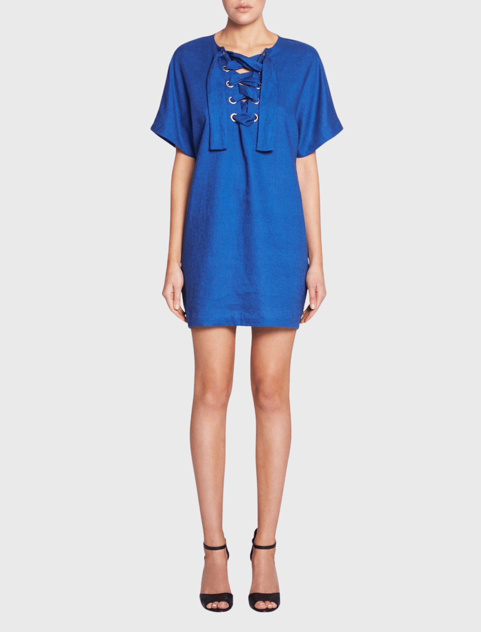 The Mara Hoffman Lace Up Mini Dress in Cobalt is made from 100% Linen