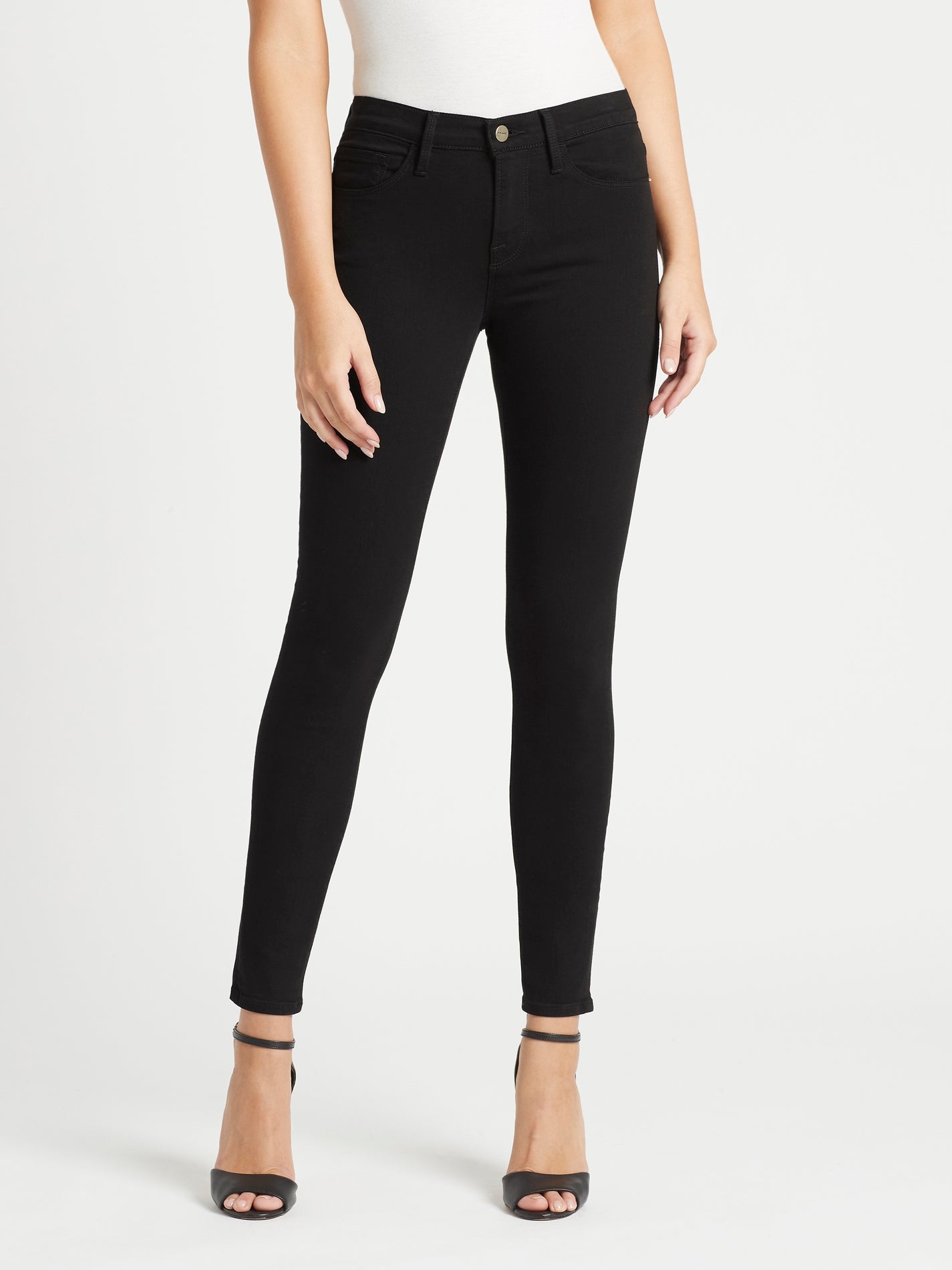 Forget the TikToker's and side part revolutionaries - skinny jeans live on! For the perfect go-to skinny leg jean, look no further than the Frame Denim Le Skinny Jean in Film Noir. This super stretch jeans features a single button zip fly closure with gold hardware, a mid rise and front and back pockets. Made from Frame's famously comfortable cotton you will feel like your wearing leggings.