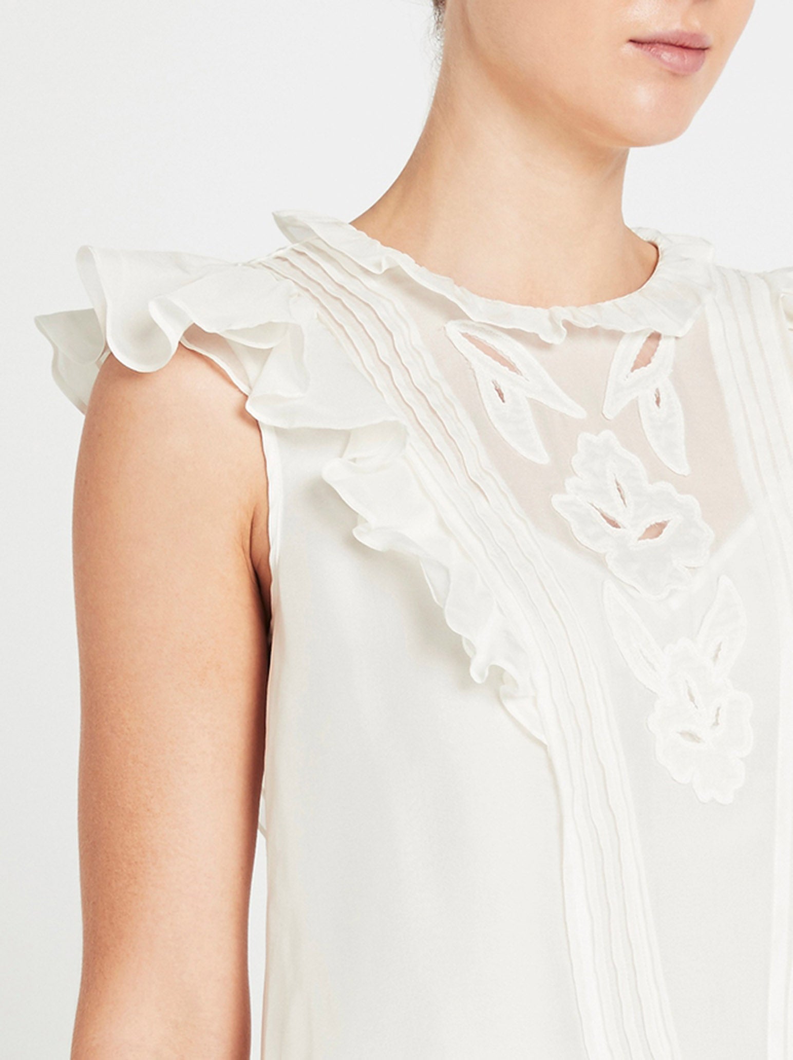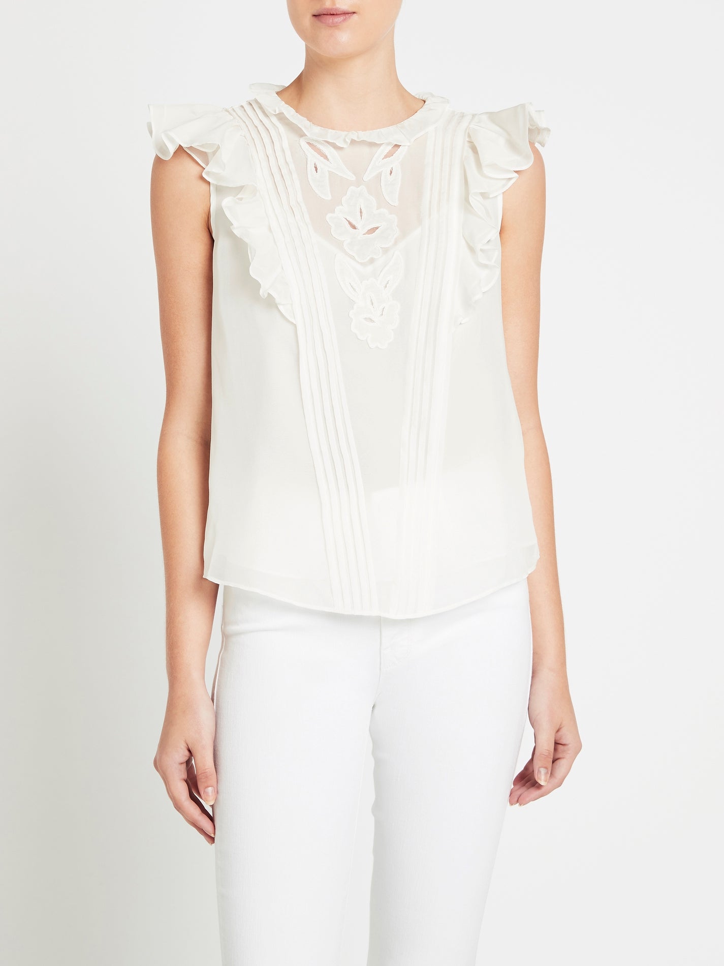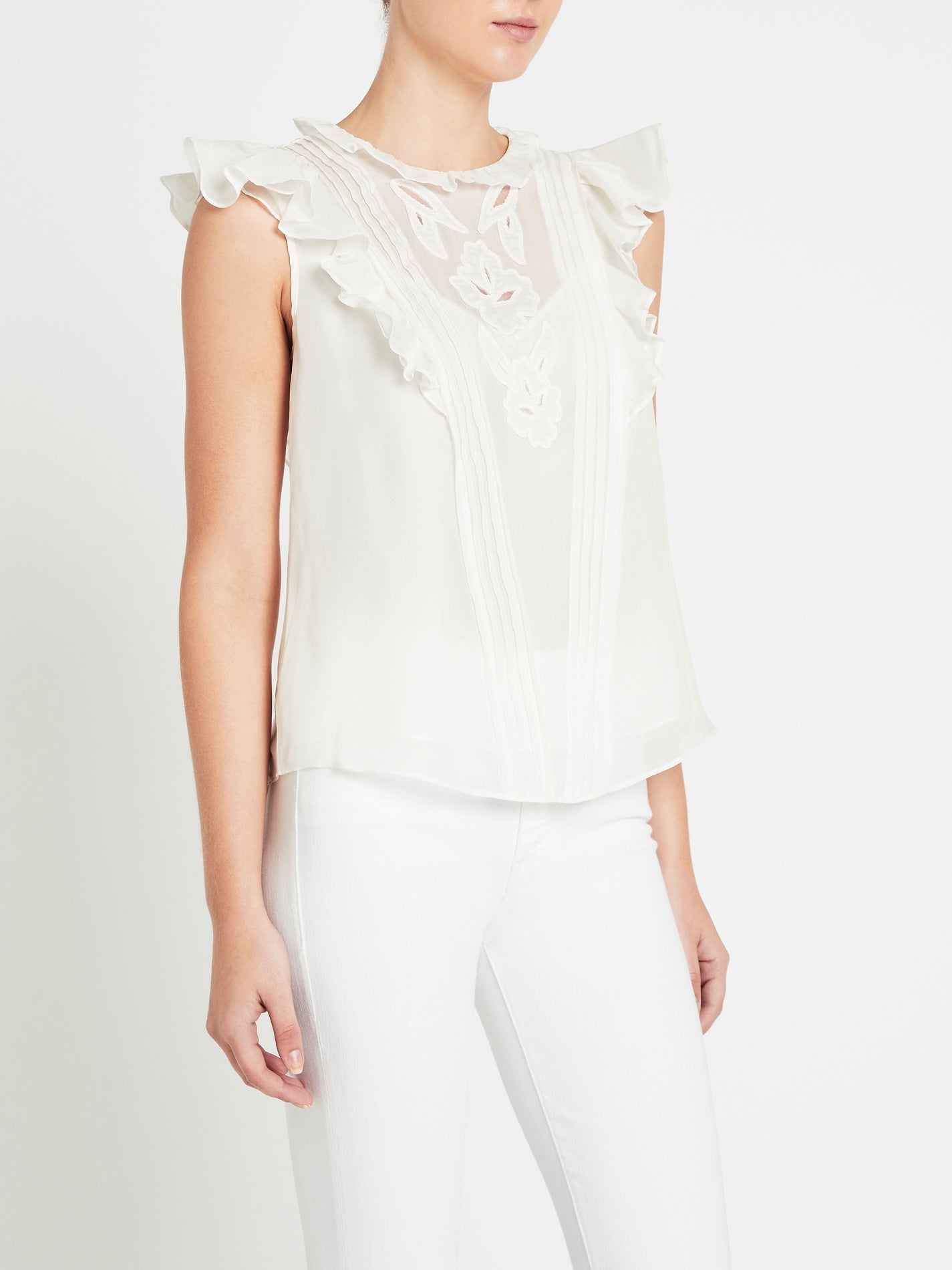 Rebecca Taylor delivers the perfect summer top with the Hana Applique Embroidered Top in Snow. Crafted from a lightweight chiffon this sleeveless blouse features a high neckline adorned by airy ruffles flowing down the front and back sleeves and is framed by delicate pintucks, embroidered floral appliques, finished with delicate corded edges. Pairs beautifully with a denim mini skirt.