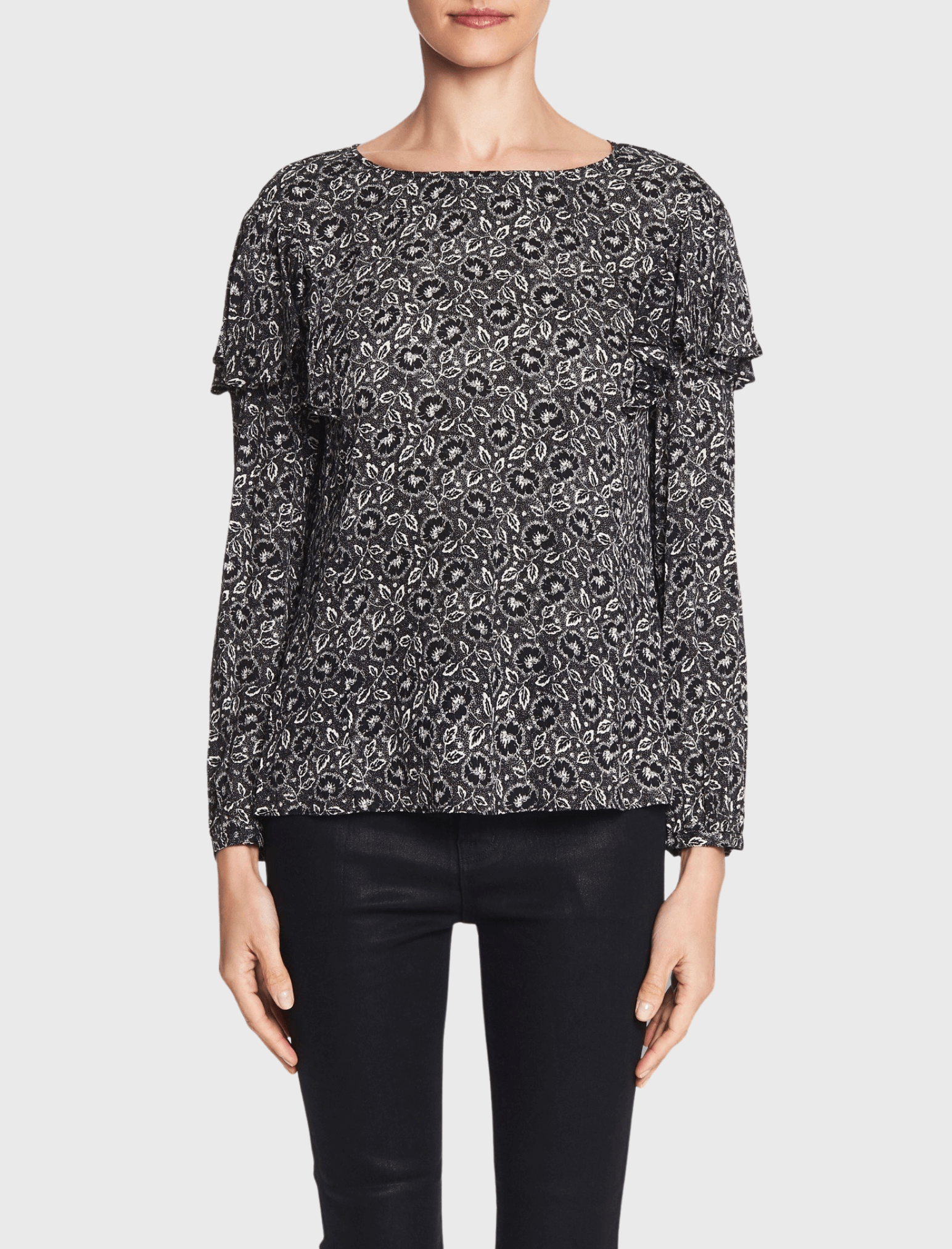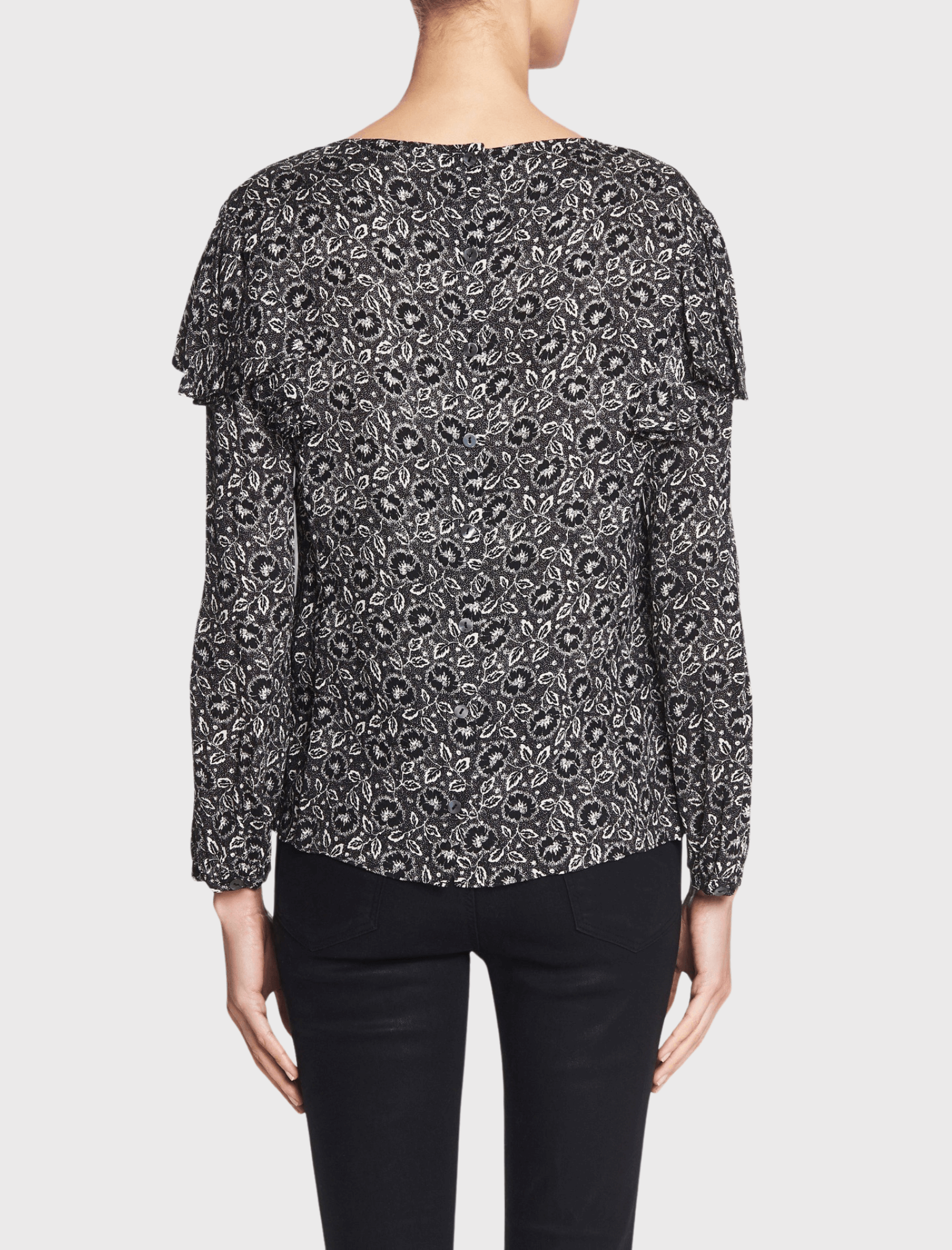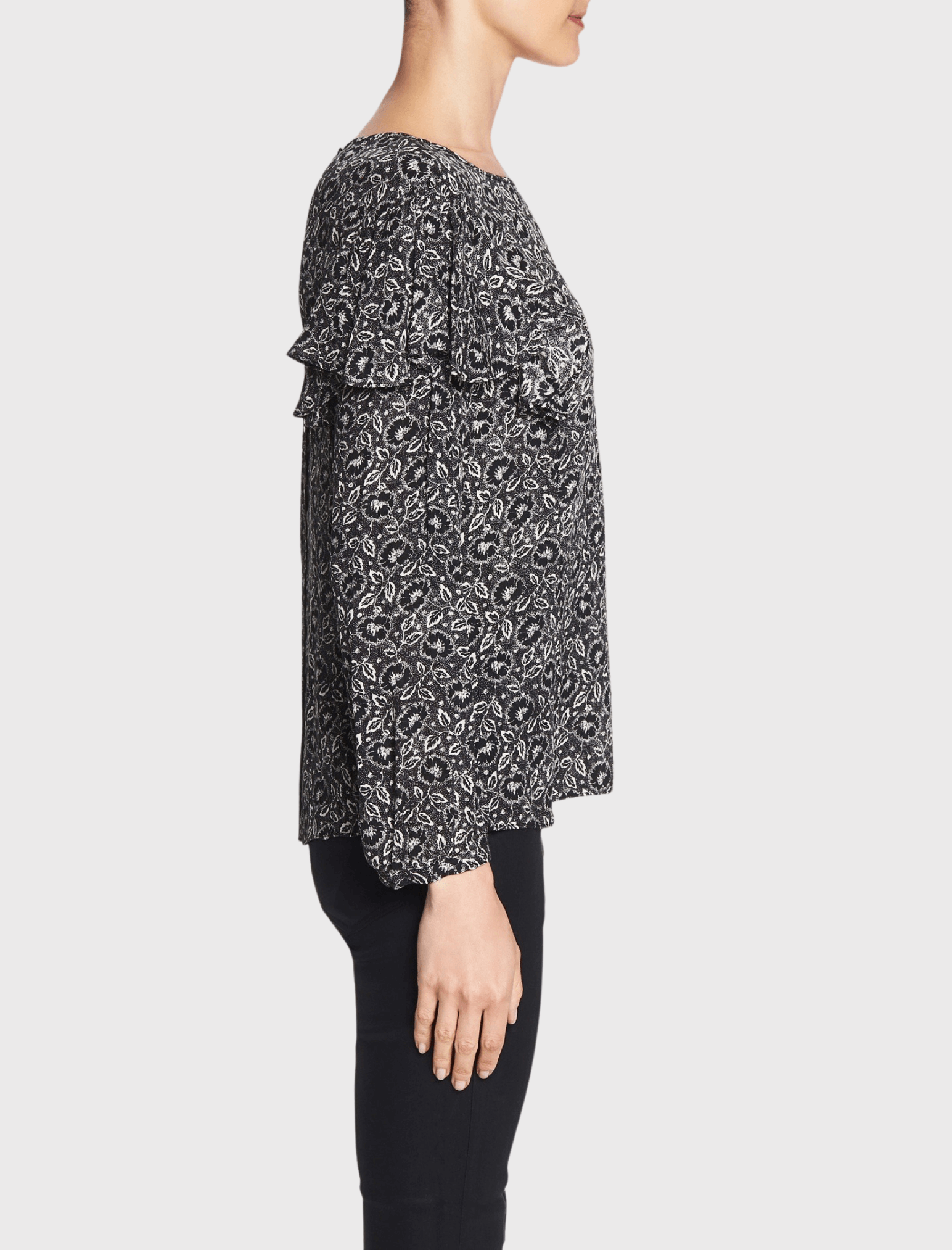 The Rebecca Taylor Long Sleeve Sweet Briar Top is the perfect blouse for spring. Constructed from a luxurious silk this piece comes in a monochrome floral print and features draped ruffles cascading from the sleeve head, a round neckline and is finished with a centre back button opening. Team yours with tailored pants for the perfect office attire or team with a little black skirt for a night out on the town.