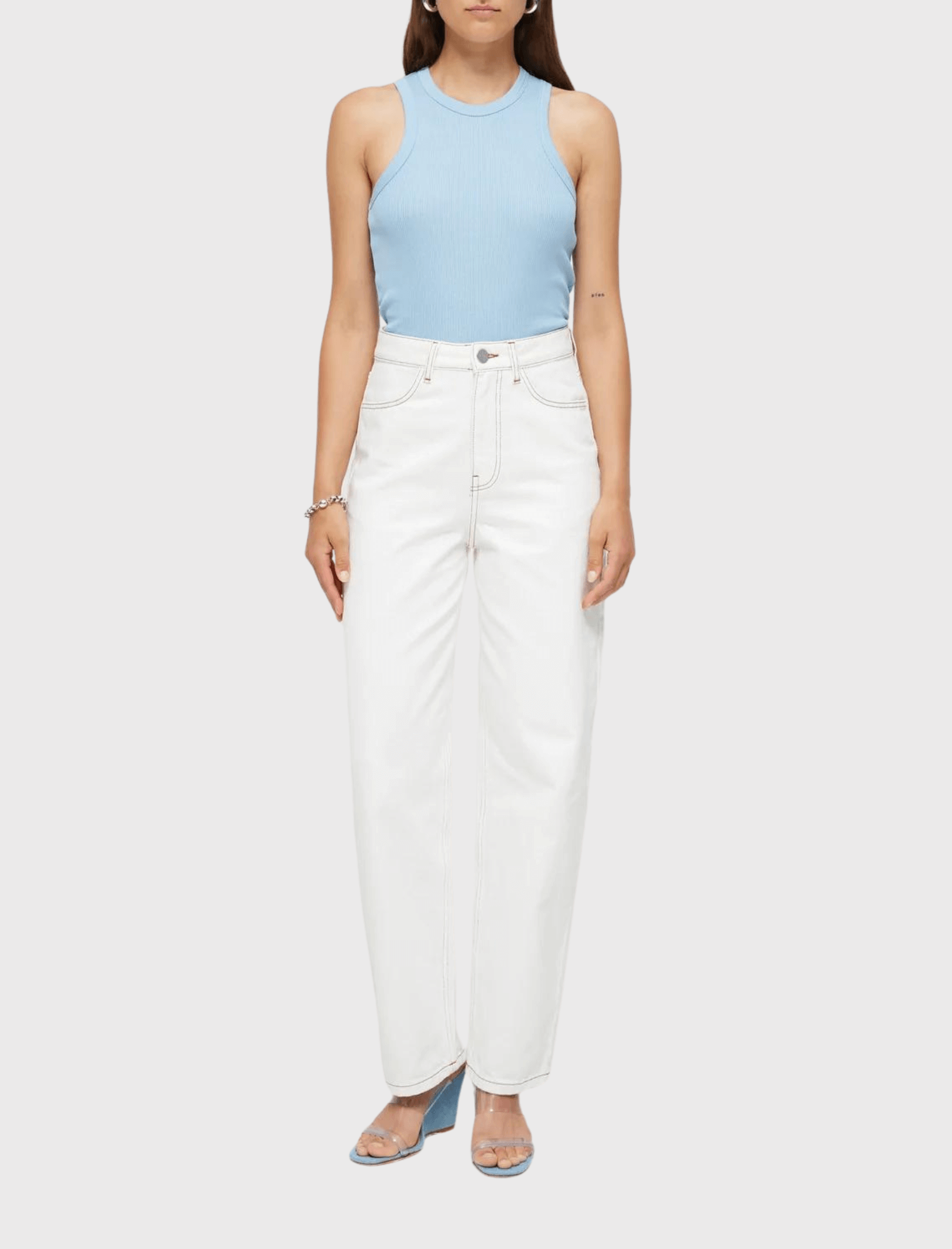 The Róhe Cotton Rib Tanktop in Sky is a ribbed racer-shaped tank top in fine mercerised cotton. Part of the Róhe signature style range, this versatile tanktop can be styled with most of your wardrobe, and is great for layering.