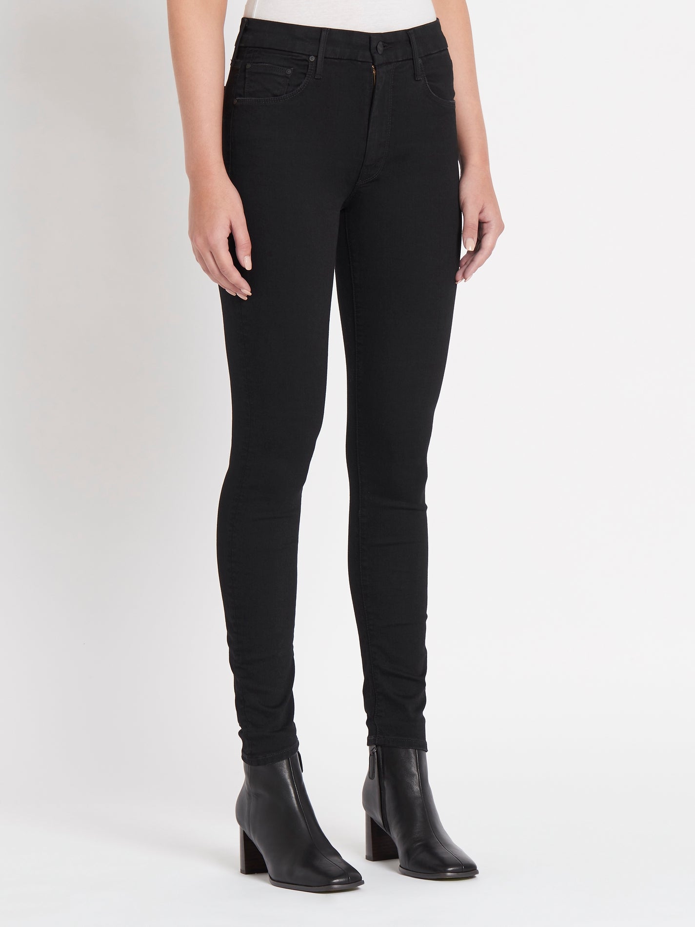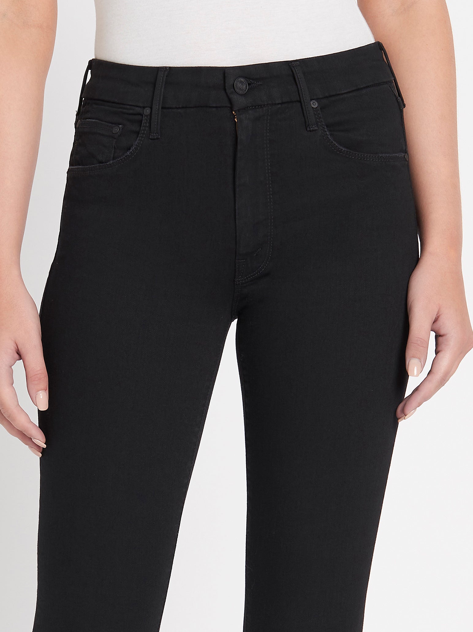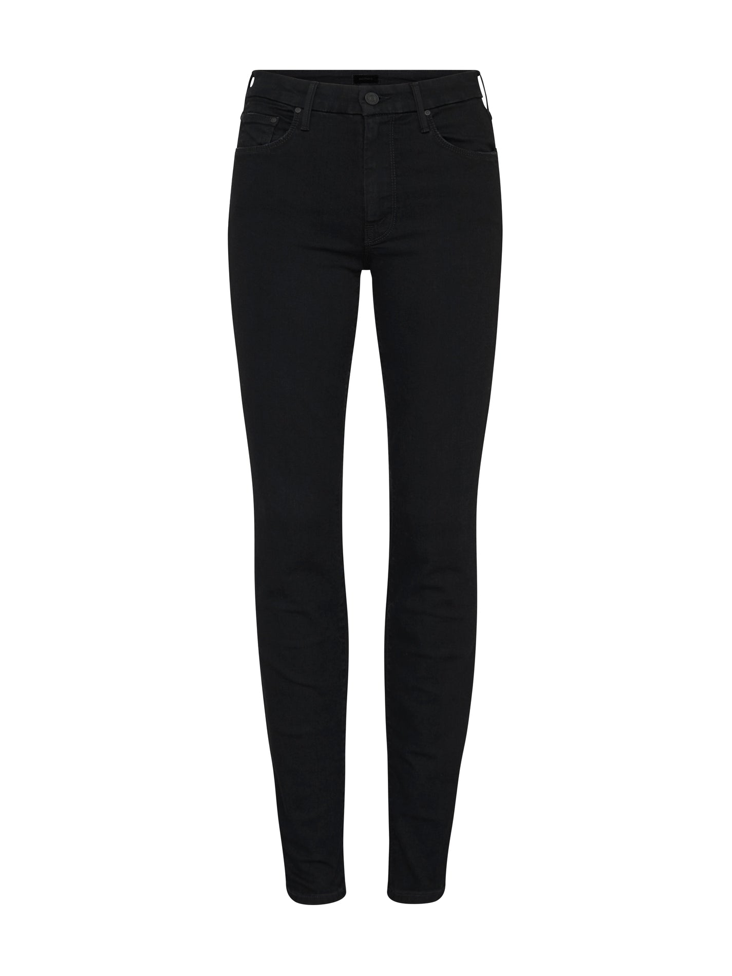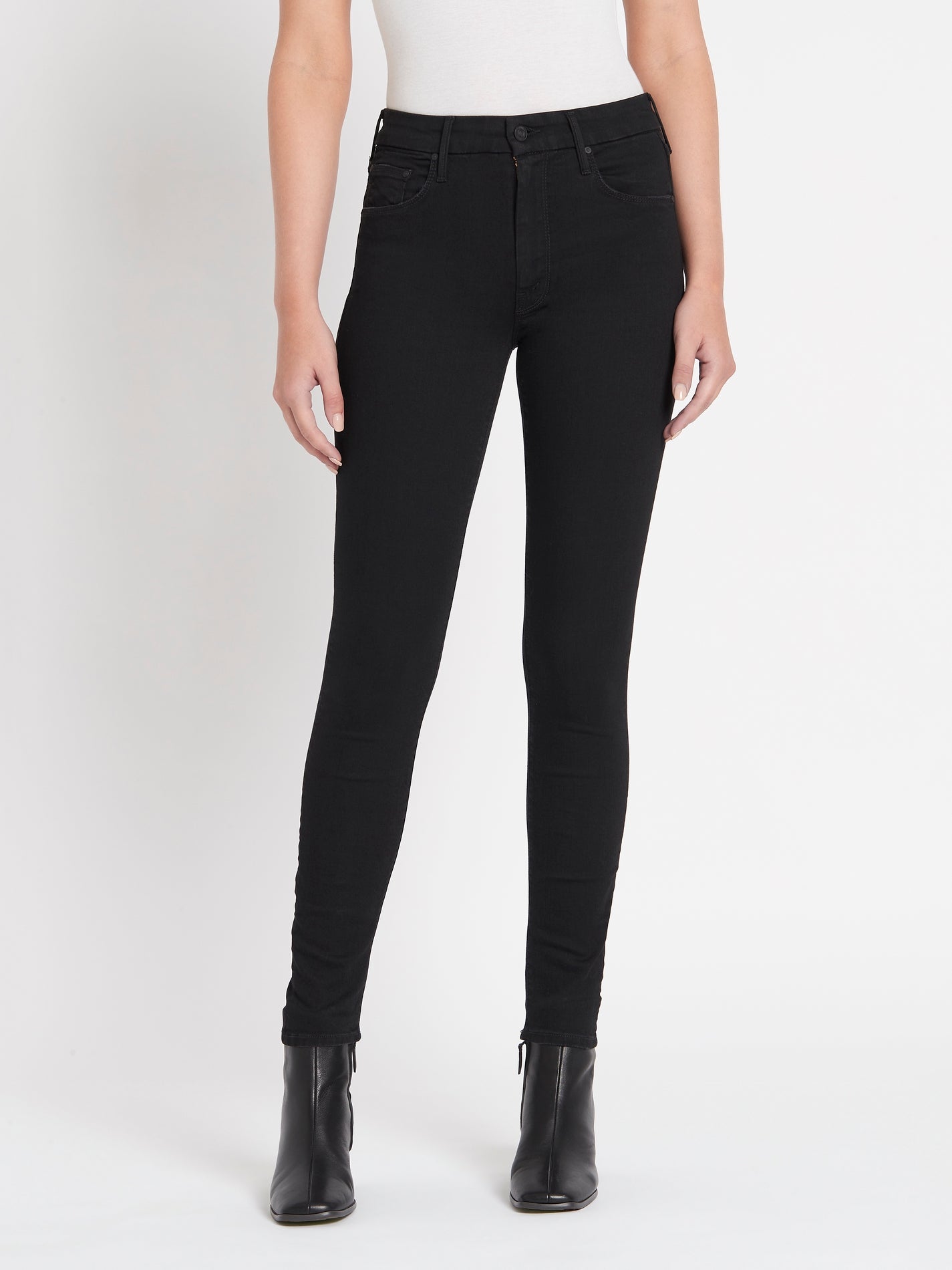 The Looker Jean by MOTHER are a skinny fitting style that is here Not Guilty a premium black denim. These super stretchy jeans have a mid rise of 8.5 inches and are detailed with matte black hardware.