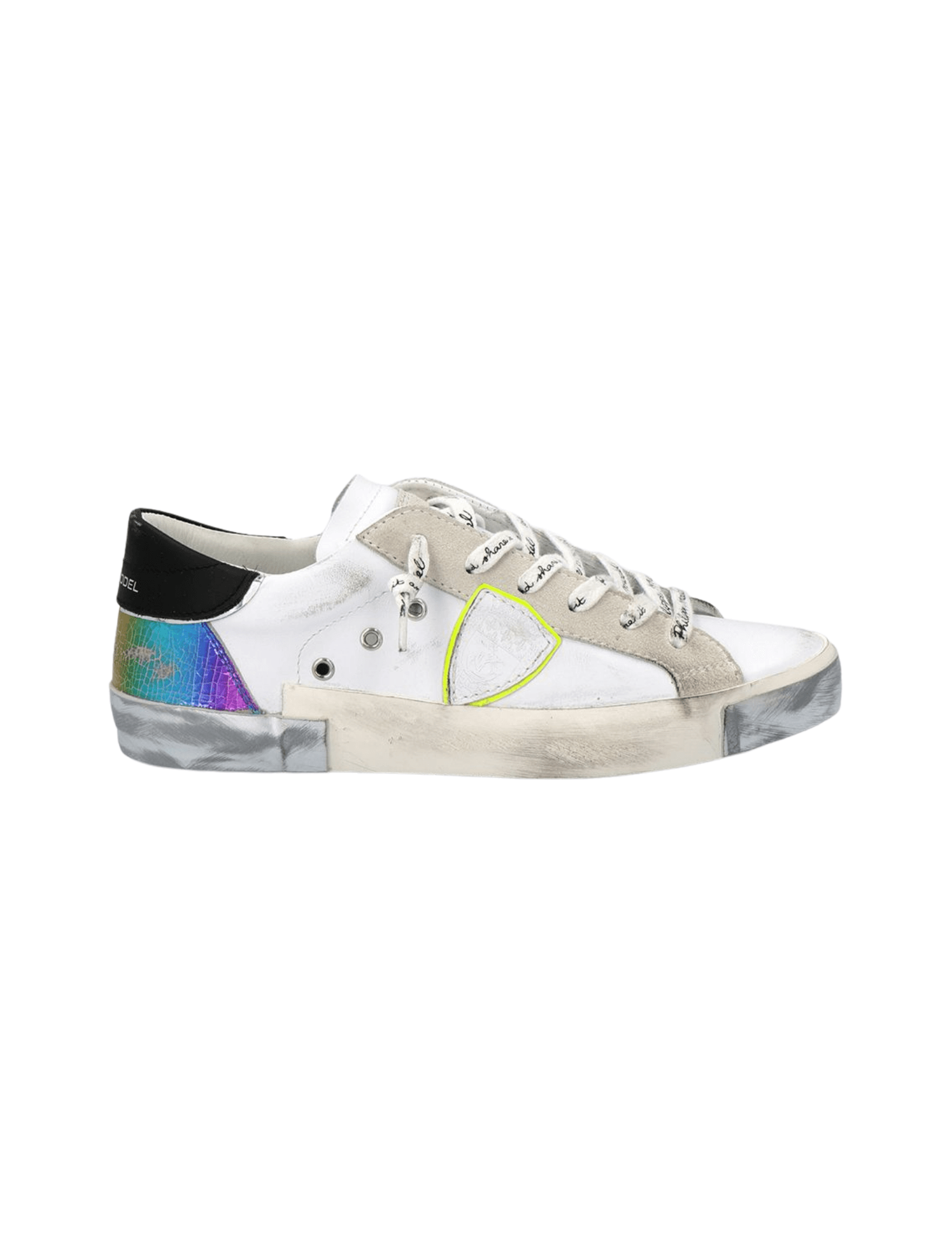 This is the best elevated basic sneaker from Philippe Model. The PRSX Low Sneaker in Metal Multicolour / Blanc Silver. With a Rainbow Croc Effect laminated leather heel and silver glitter sole details, this contemporary sneaker oozes day to day charm.