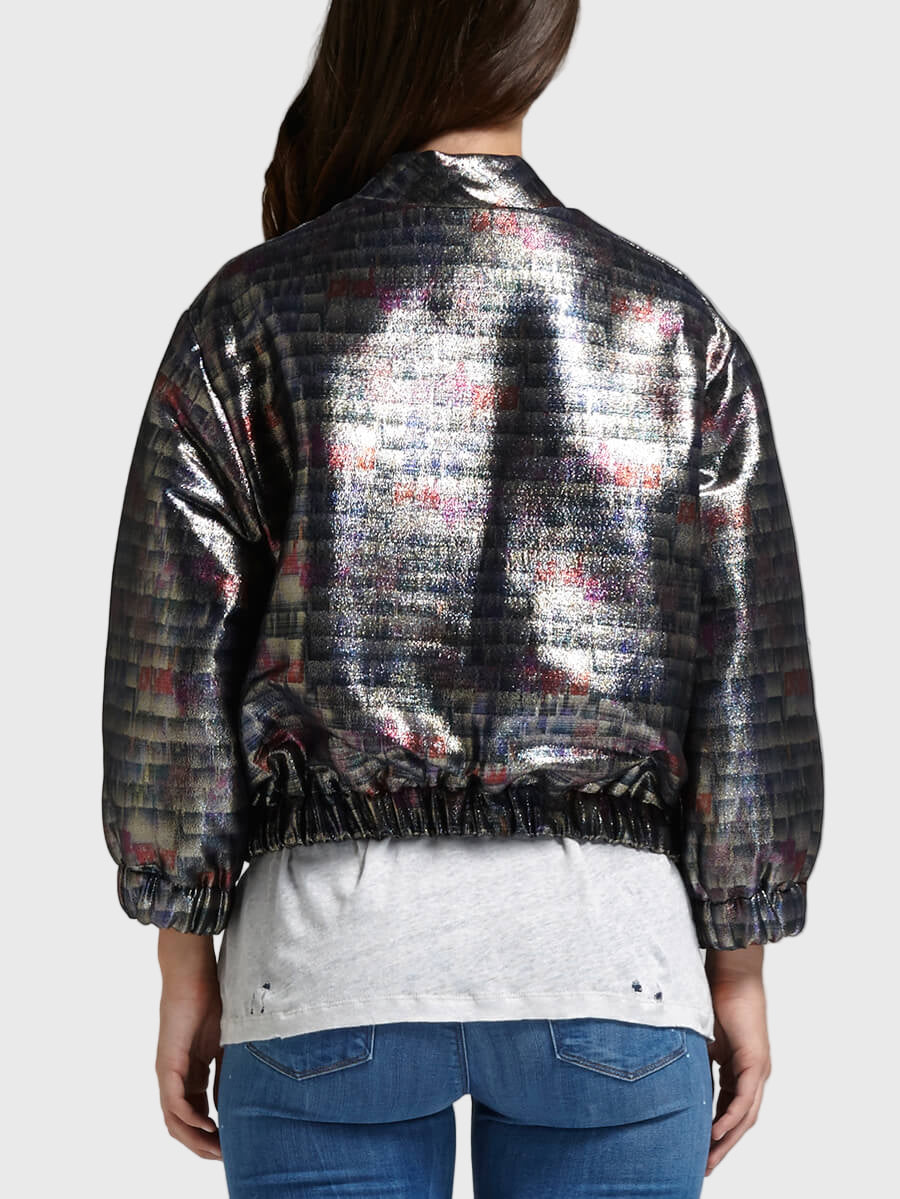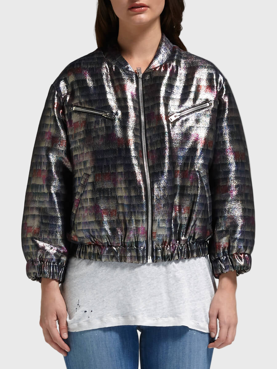 The Zina Bomber Jacket from IRO is the statement piece of the season. This multicolour cropped style bomber is made from a stunning metallic fabric, is fully lined and features chunky silver zip hardware on the centre front and front pockets.