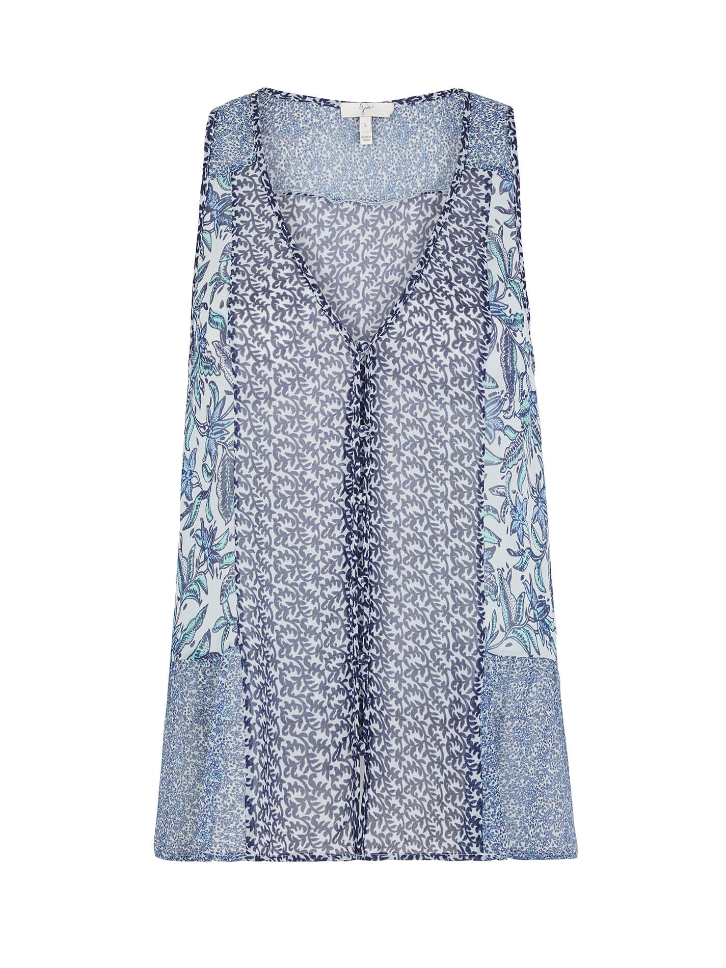 The Adalicia Tank from Joie features contrasting floral patterns in various shades of blue, and is slightly sheer. This flowy and feminine tank has a V neck, front button closure and a frill skirt along the hem.