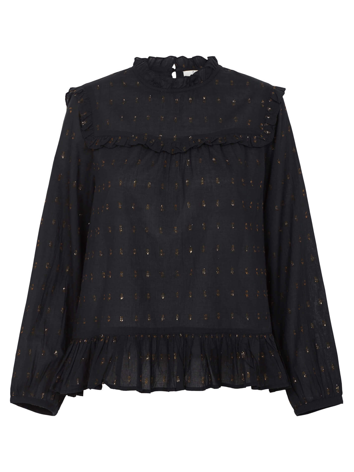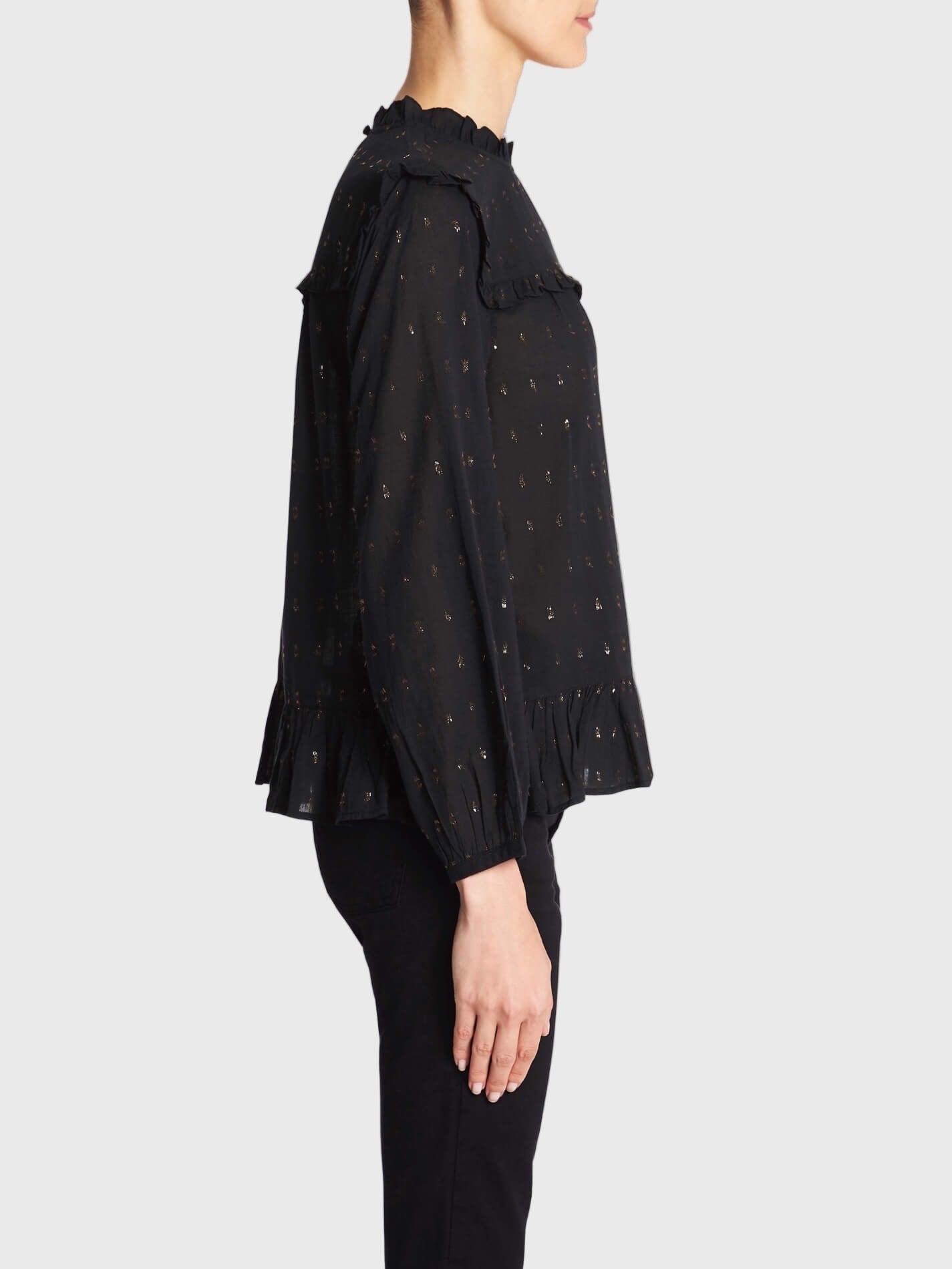 Add a touch of metallic glam to your look with the Joie Gianella Blouse in Caviar. Constructed from a cotton blend fabric this top features bracelet length sleeves, a ruffled hem and a high neckline that is finished with a ruffled trim and centre back closure. Dotted metallic detailing adds some spark to this piece, making it the perfect ultra comfortable piece that can go from day to night with ease.