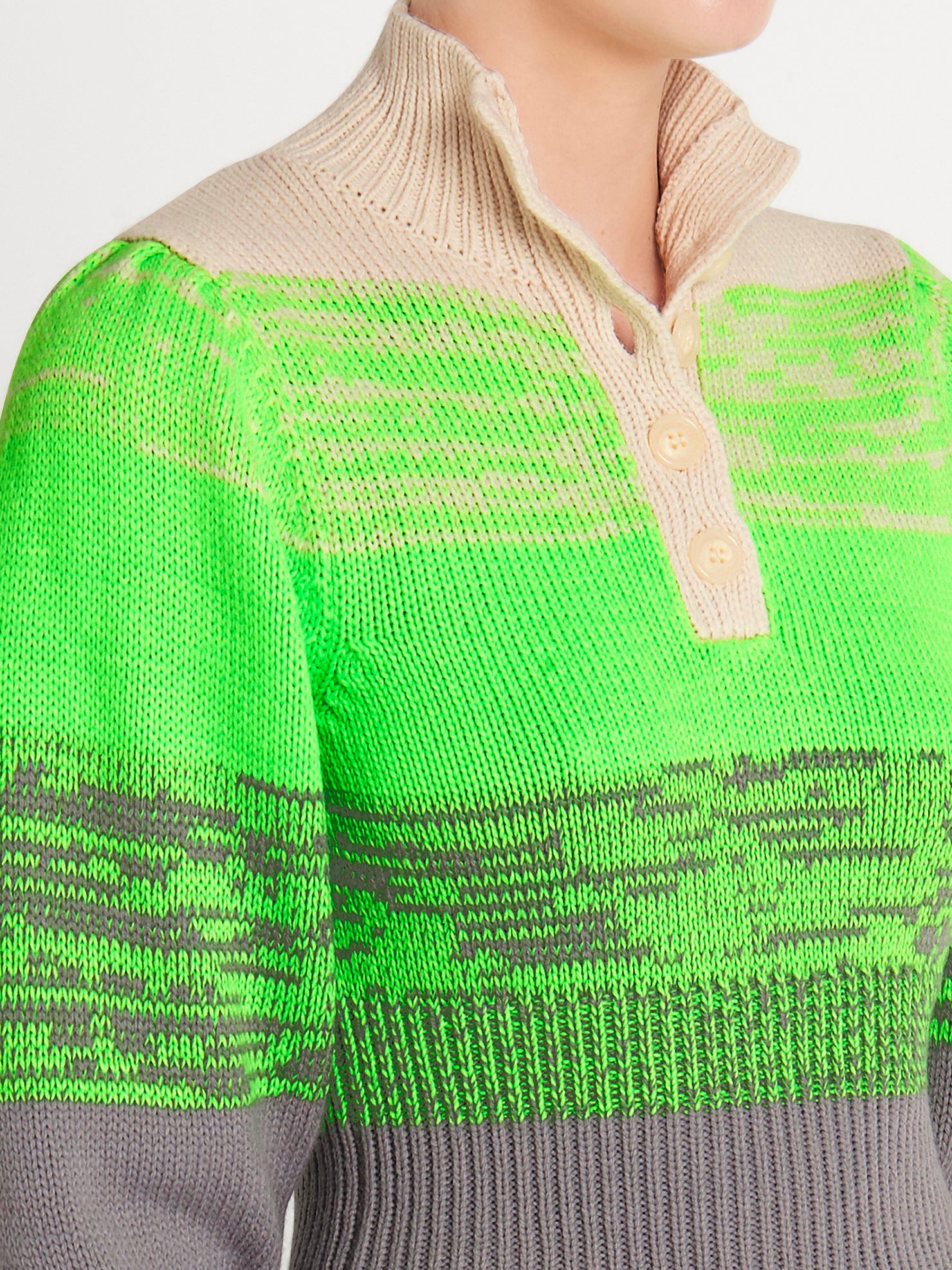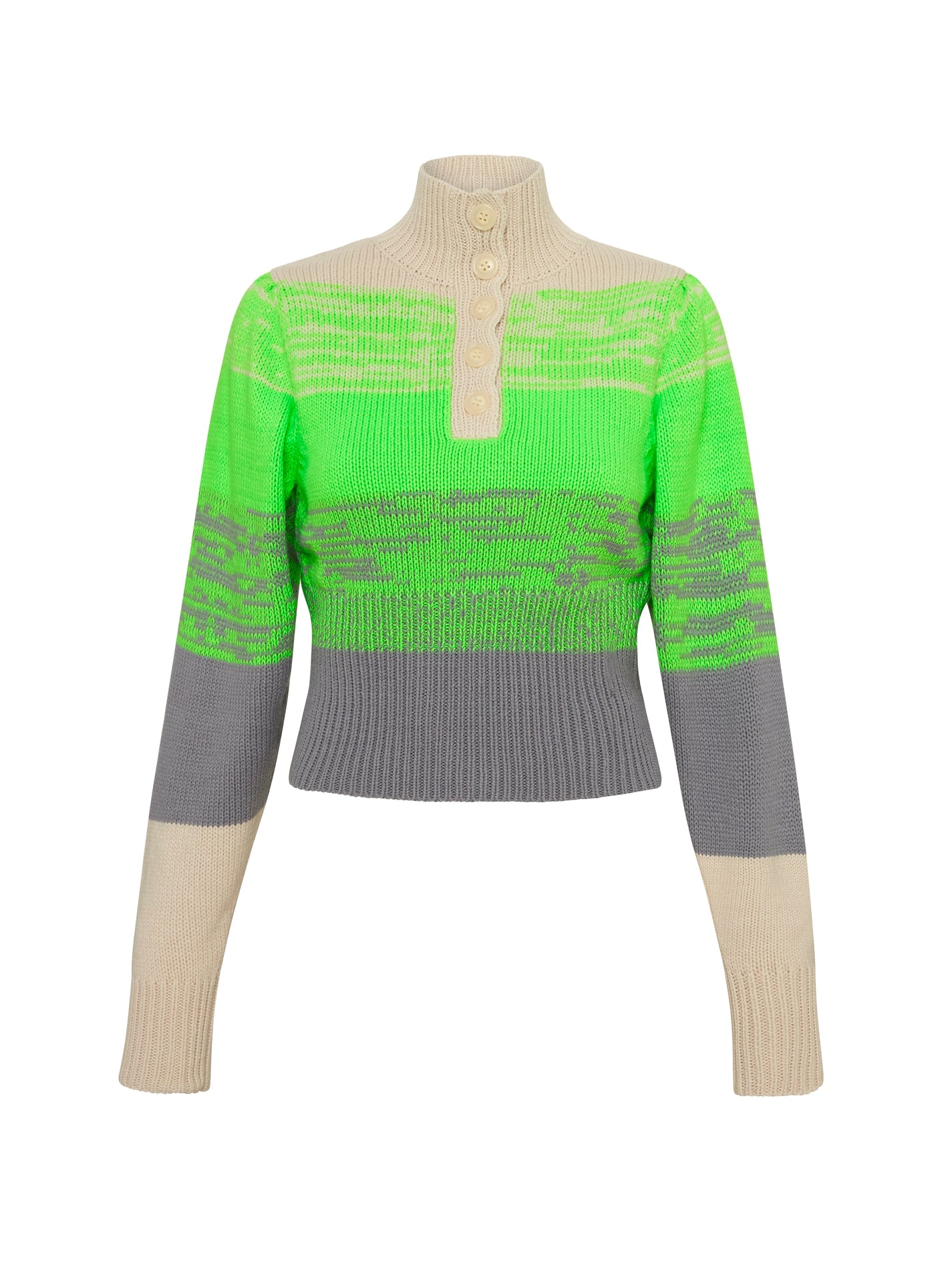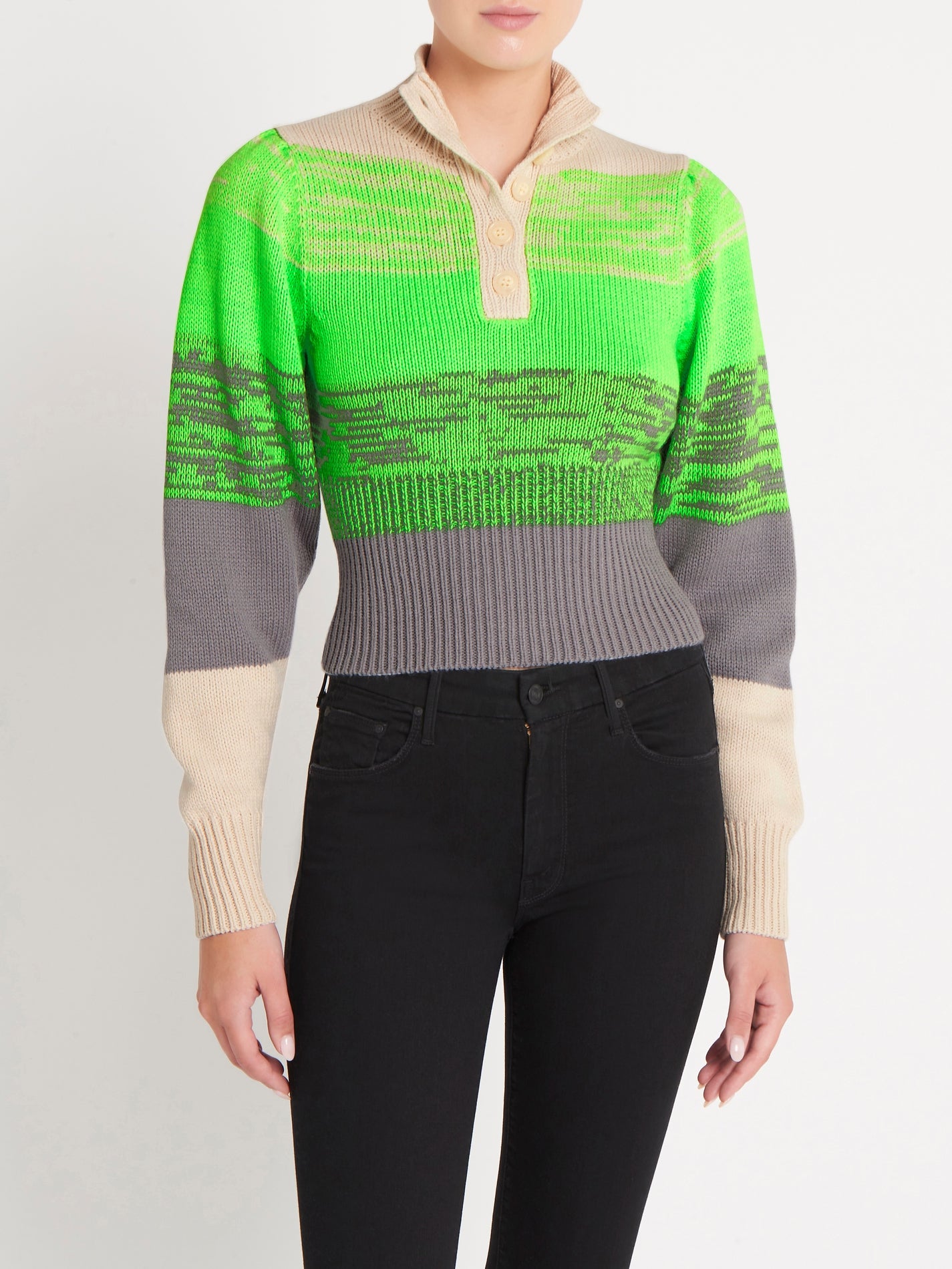 The Baum Und Pferdgarten Caroleen Sweater in Whitecap Grey is the eye-catching addition your wardrobe needs this spring. This jumper features a high neckline with button closures, banding at the bodice and wrists with a cropped silhouette to ensure a flattering fit and voluminous sleeves. The neck can be worn open or closed. Pair with white jeans or pant for a fun spring outfit.
