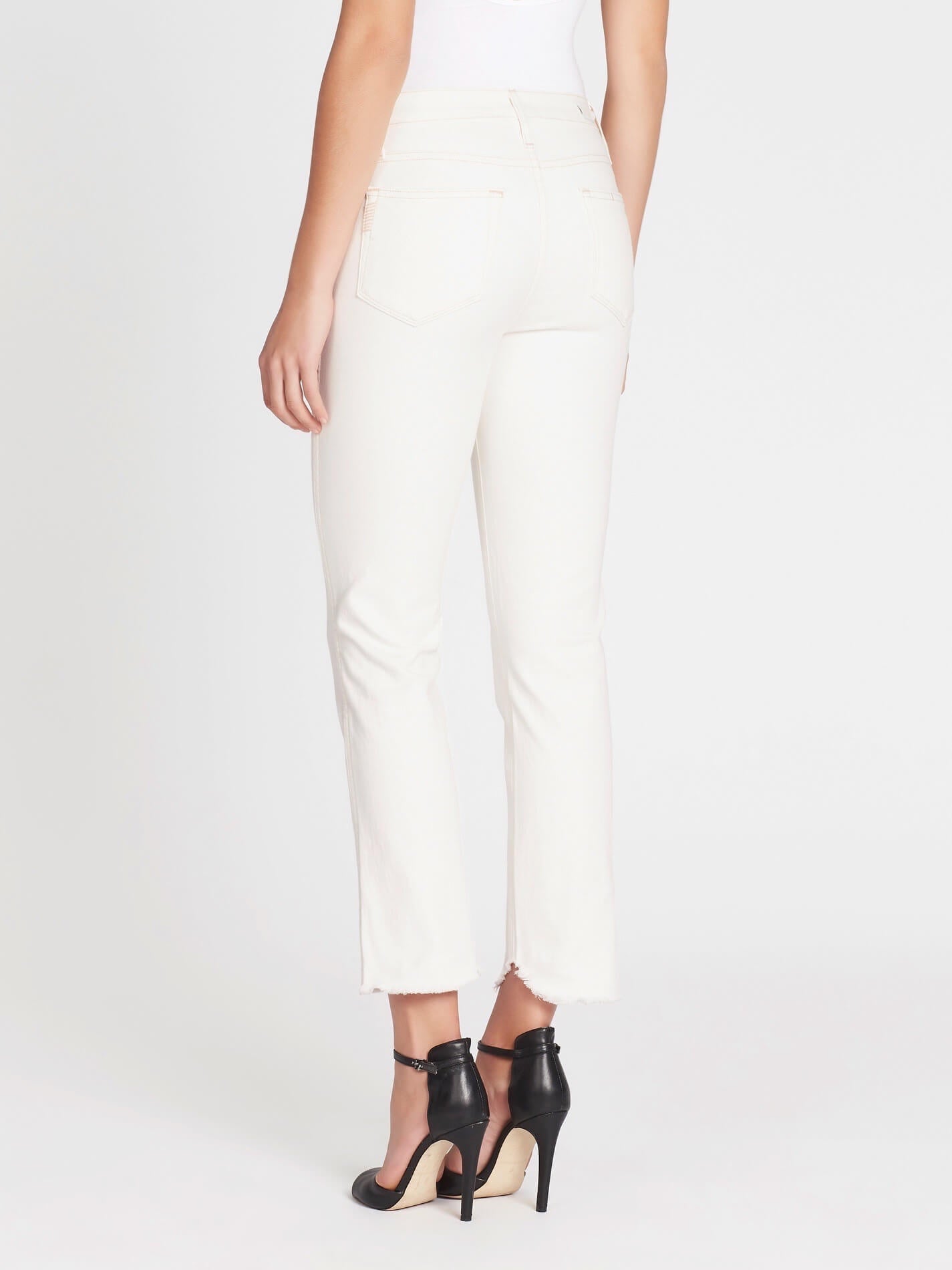 It's all about soft neutrals this season and the Paige Denim Hoxton Straight Ankle Jean in Cream/Pink is the perfect way to rock this trend. Constructed from a cream colour denim these high rise straight jeans feature a single button zip fly closure with silver hardware, front and back pockets, an ultra cool frayed hem and have been finished with contrast pink stitching.