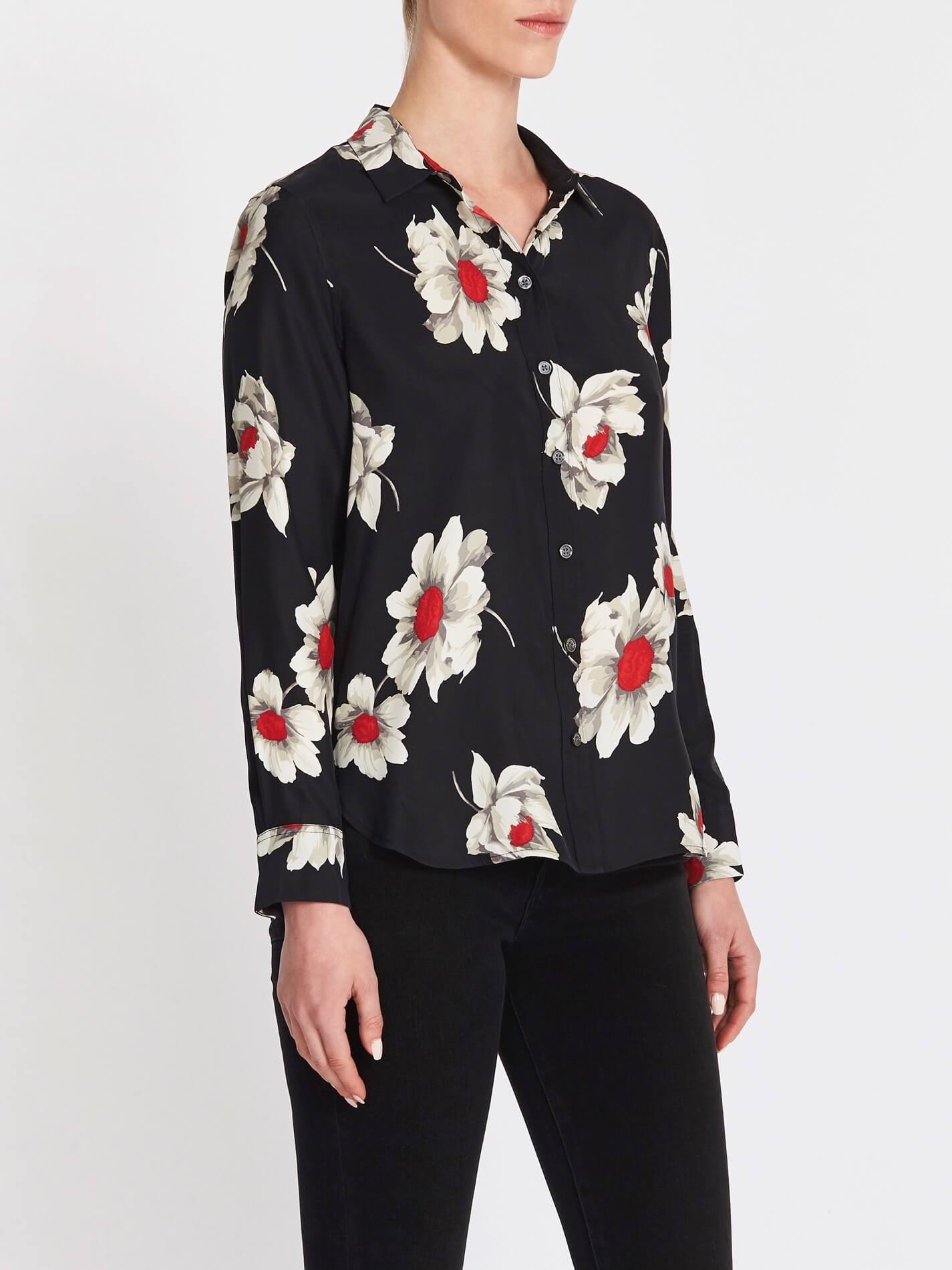 Add a touch of florals to your wardrobe this season with the Equipment Leema Long Sleeved Top in True Black Multi. Constructed from an ultra soft silk, this button up shirt features a regular collar, long sleeves with buttoned cuffs, horizontal back yolk and is finished with a curved hemline for easy layering.