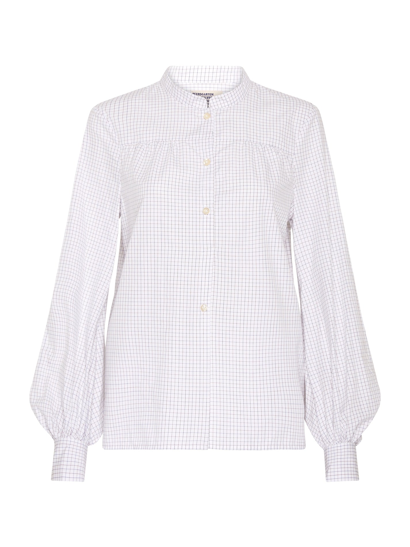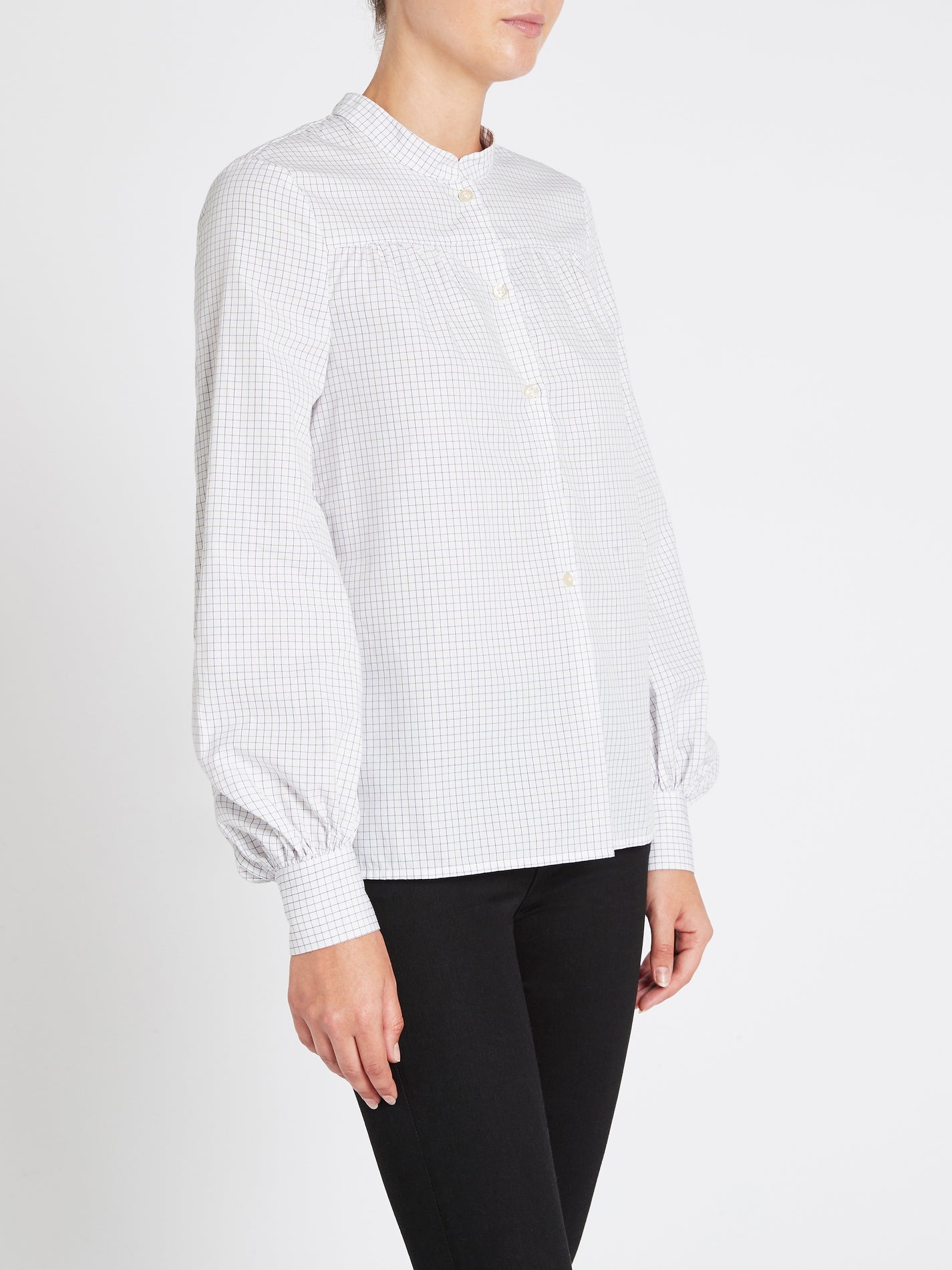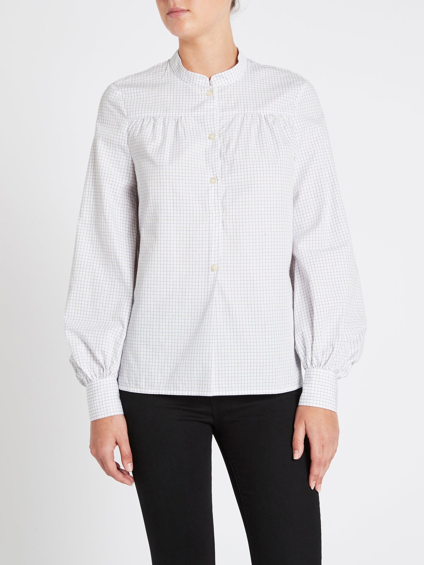 Baum Und Pferdgarten update a wardrobe classic with the Malin Shirt in White Brown Blue Grid. Constructed from ultra soft cotton, this long sleeve button down shirt features a mandarin collar, front and back yoke with a ballon finish to the sleeve. Team with a cropped tailored pant and block heels for a professional polished look or keep in casual with pairing back with denim.