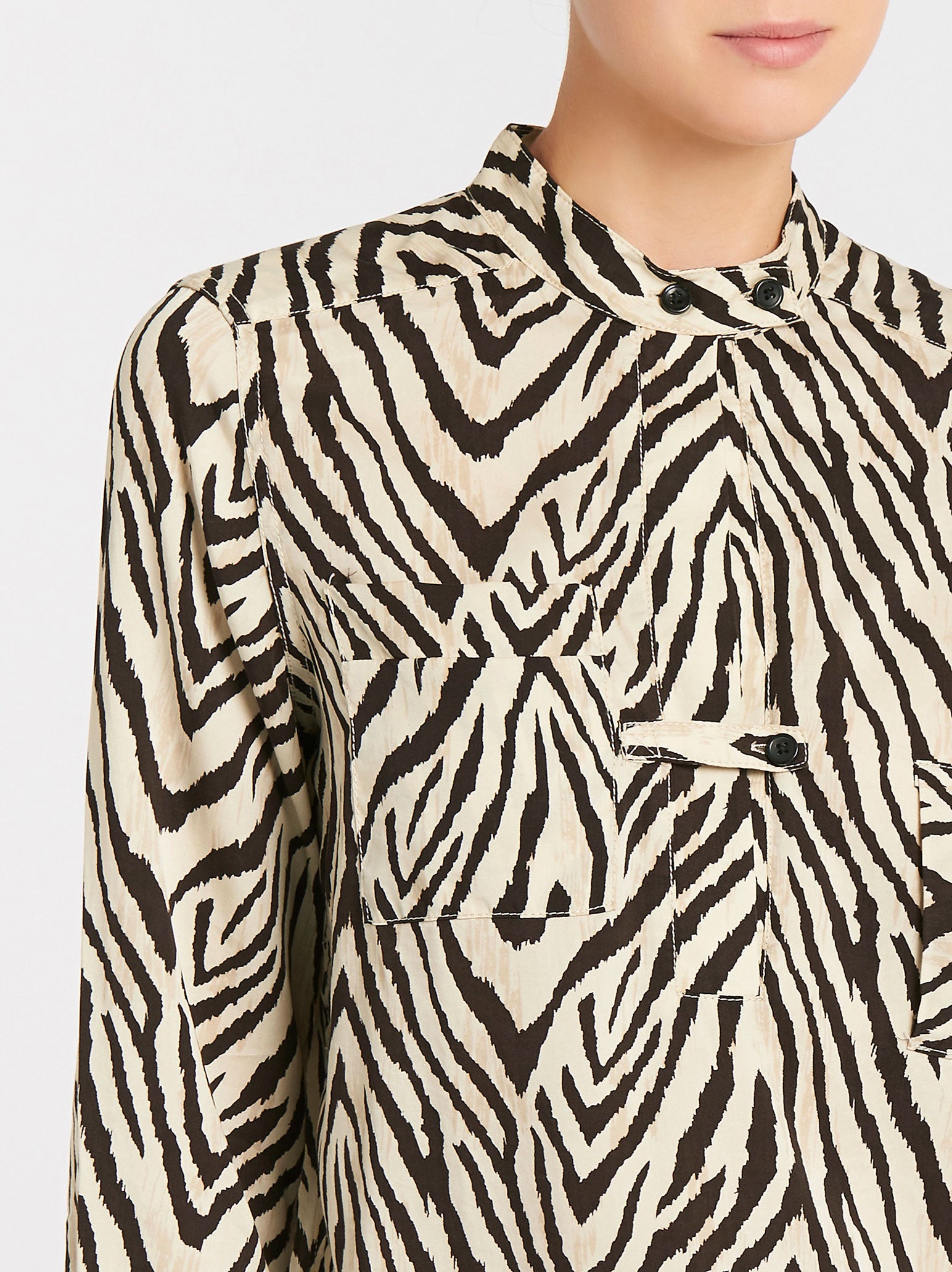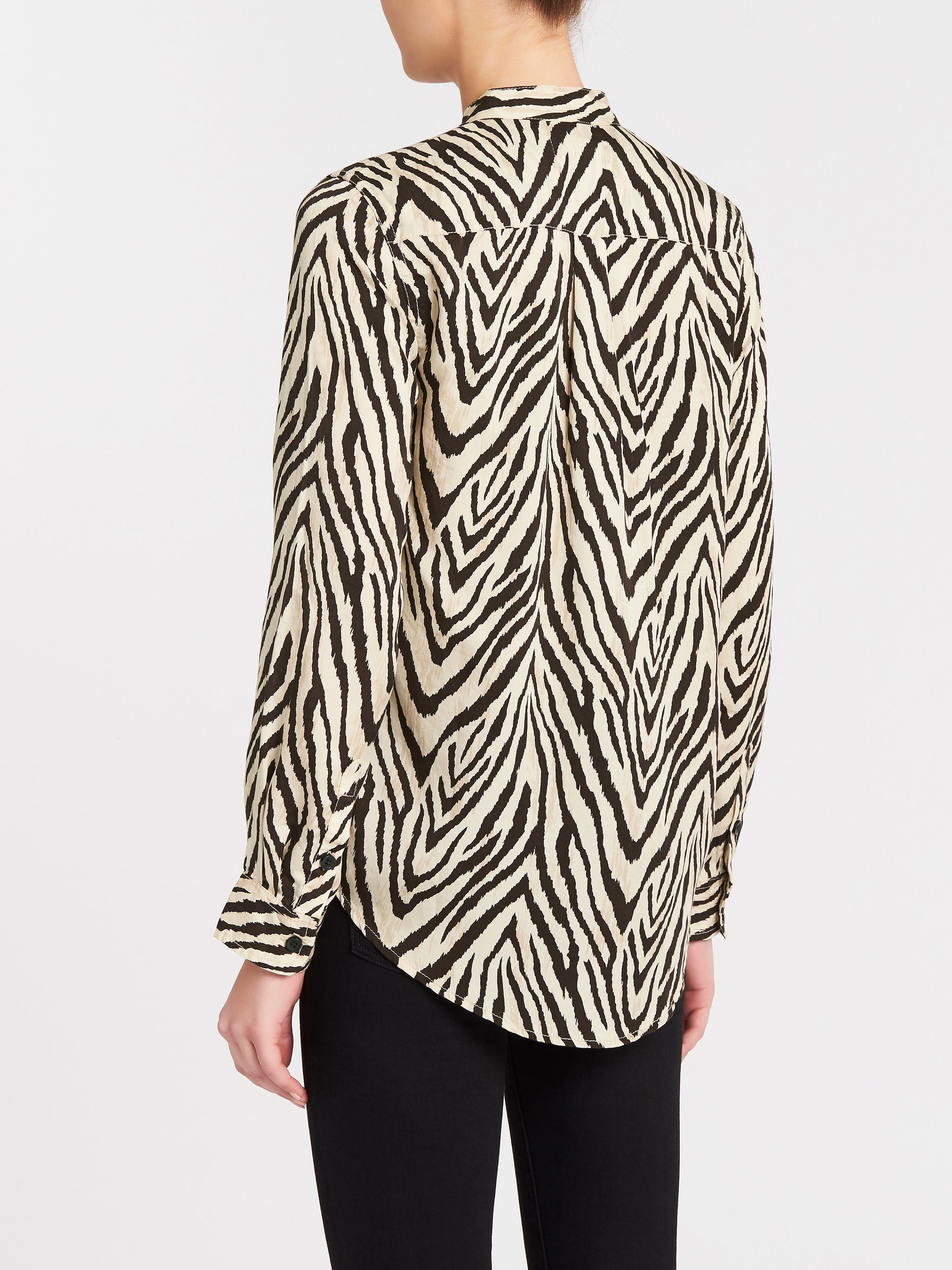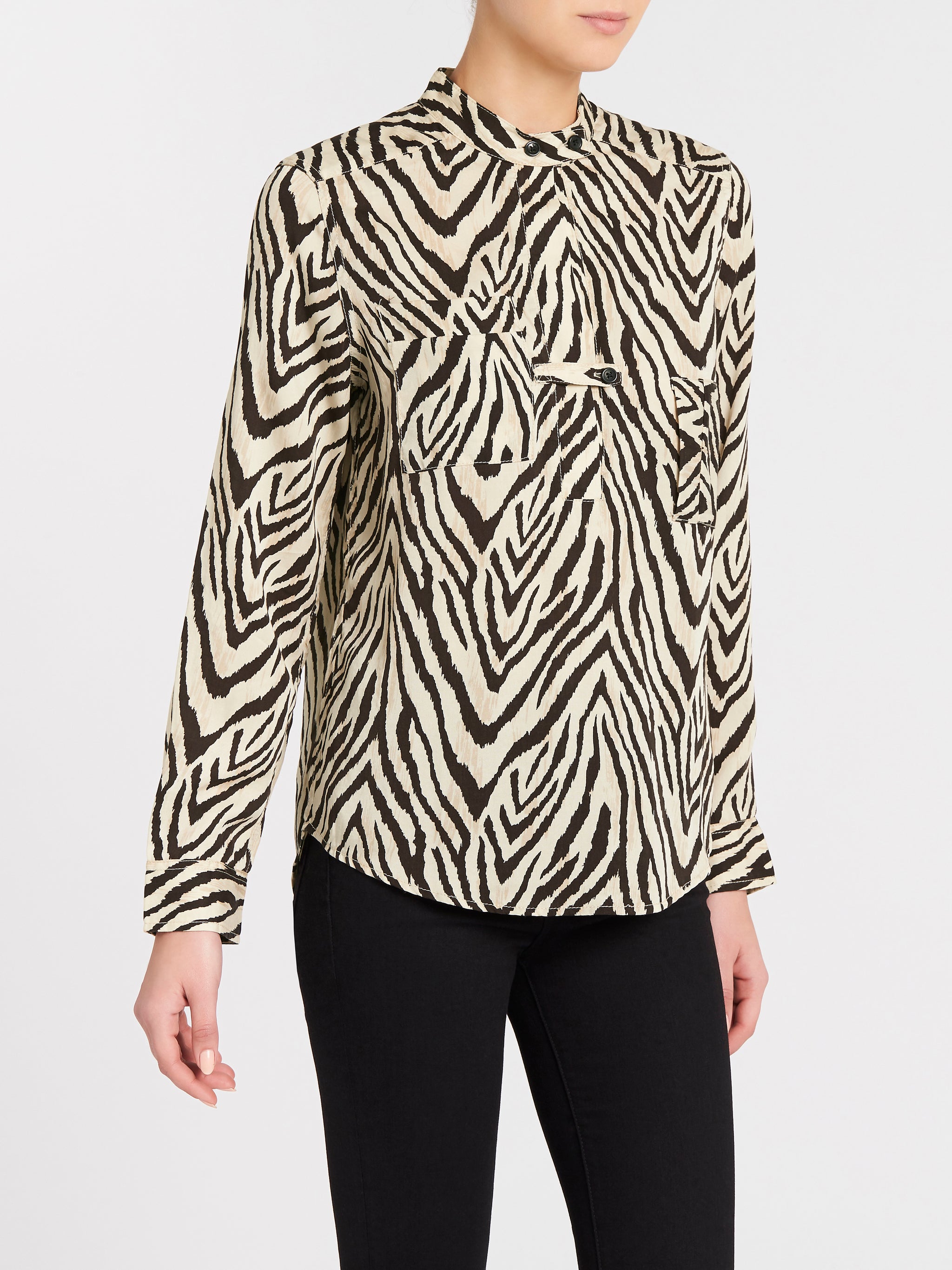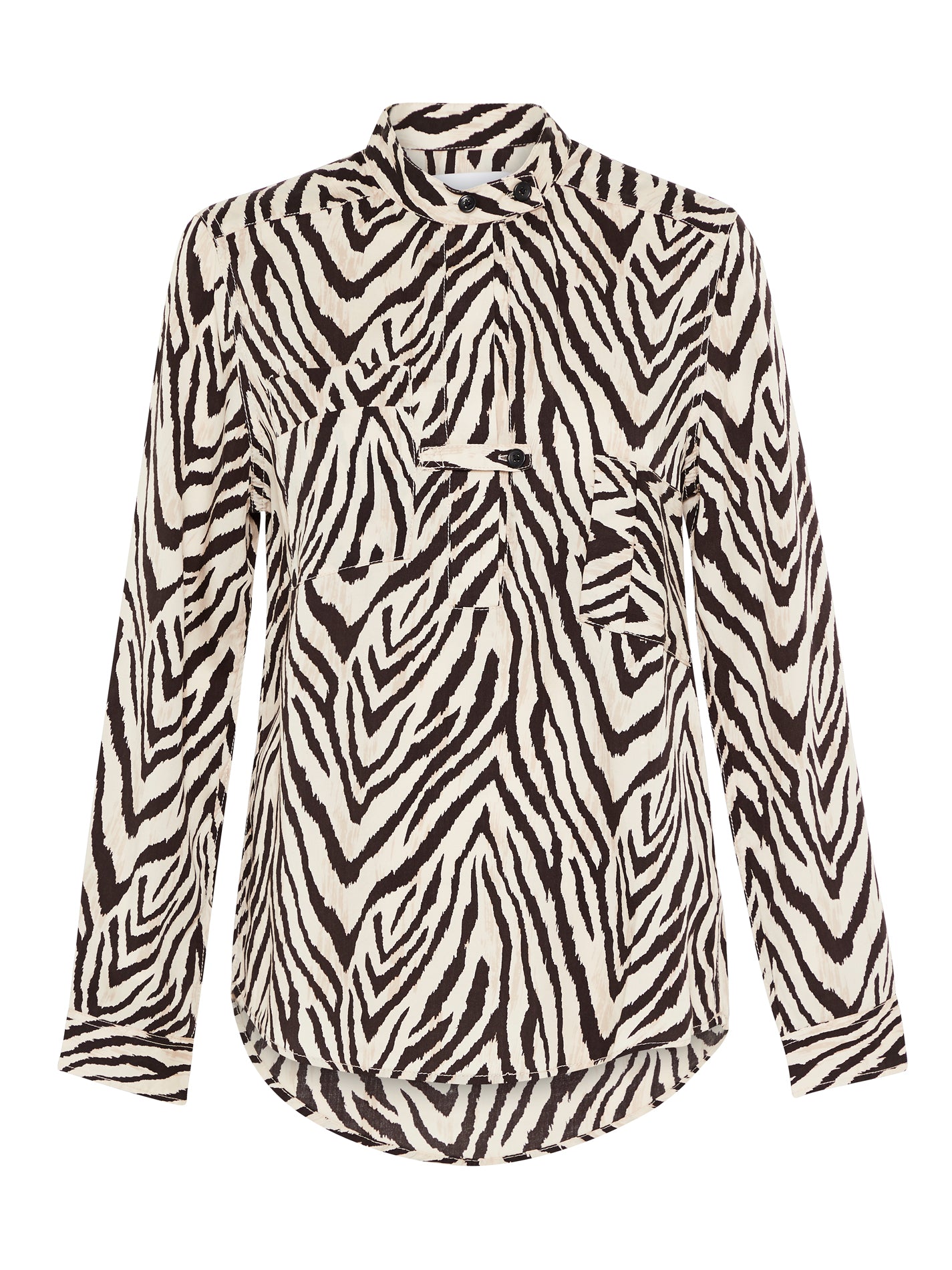 Capitalise on the timeless animal print trend with The B50 Top in Natural Zebra Print by Current Elliott. Crafted from ultra soft and delicate Lyocell this bold zebra print top features a single breast pocket, a unique keyhole neckline with a mandarin collar and is finished with a curved hemline making it a perfect piece to layer over. Pair back with a light wash denim and black ankle boots for a bold weekend look.