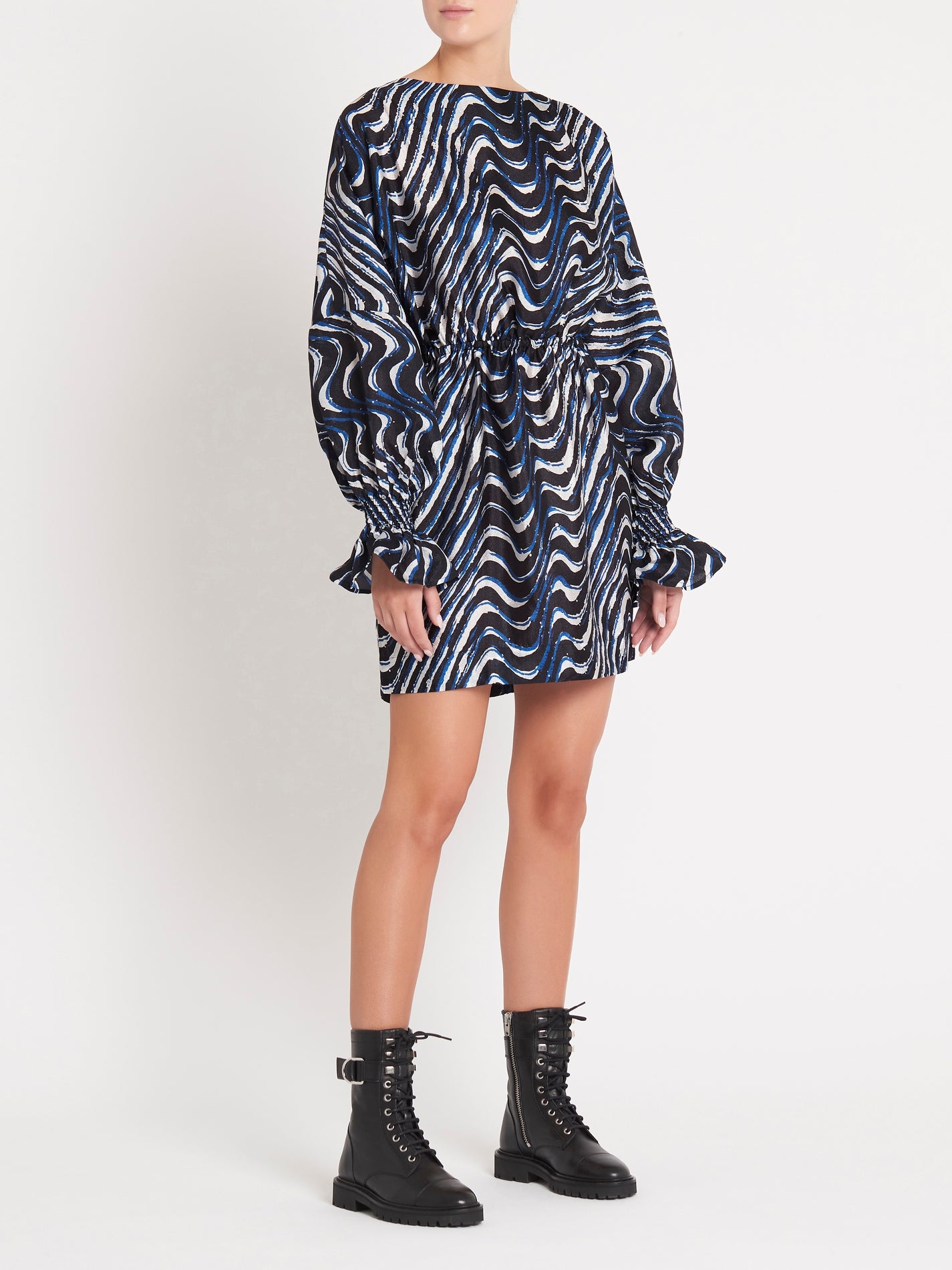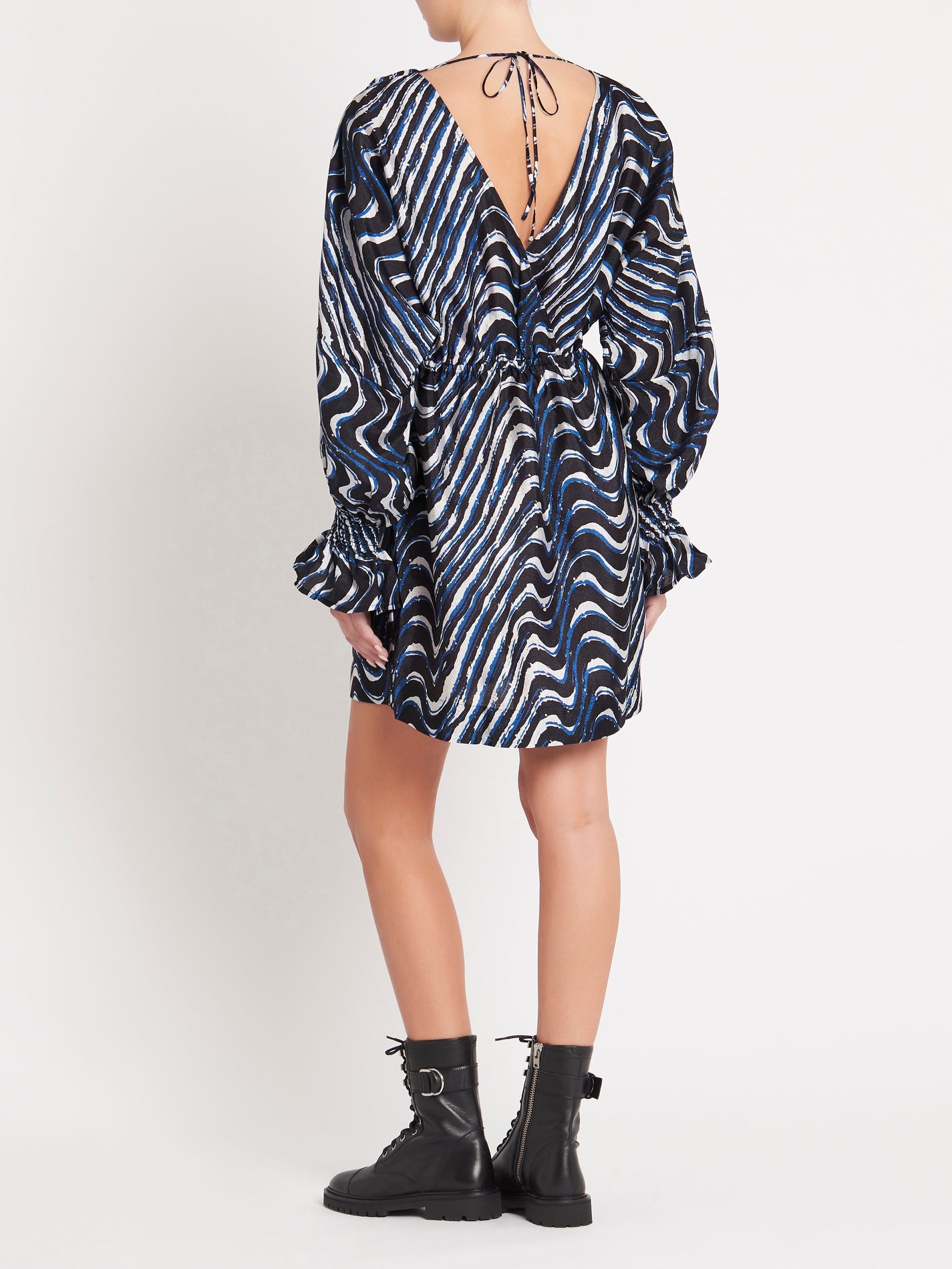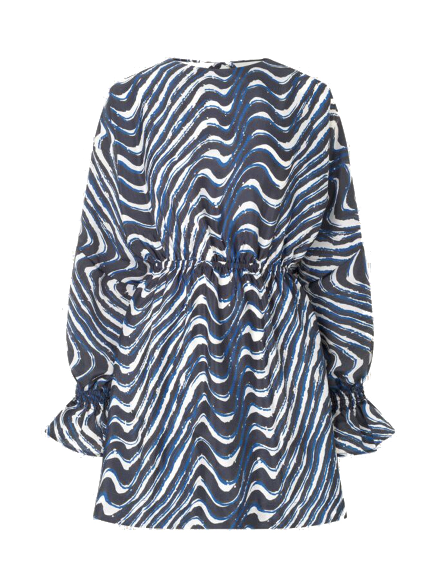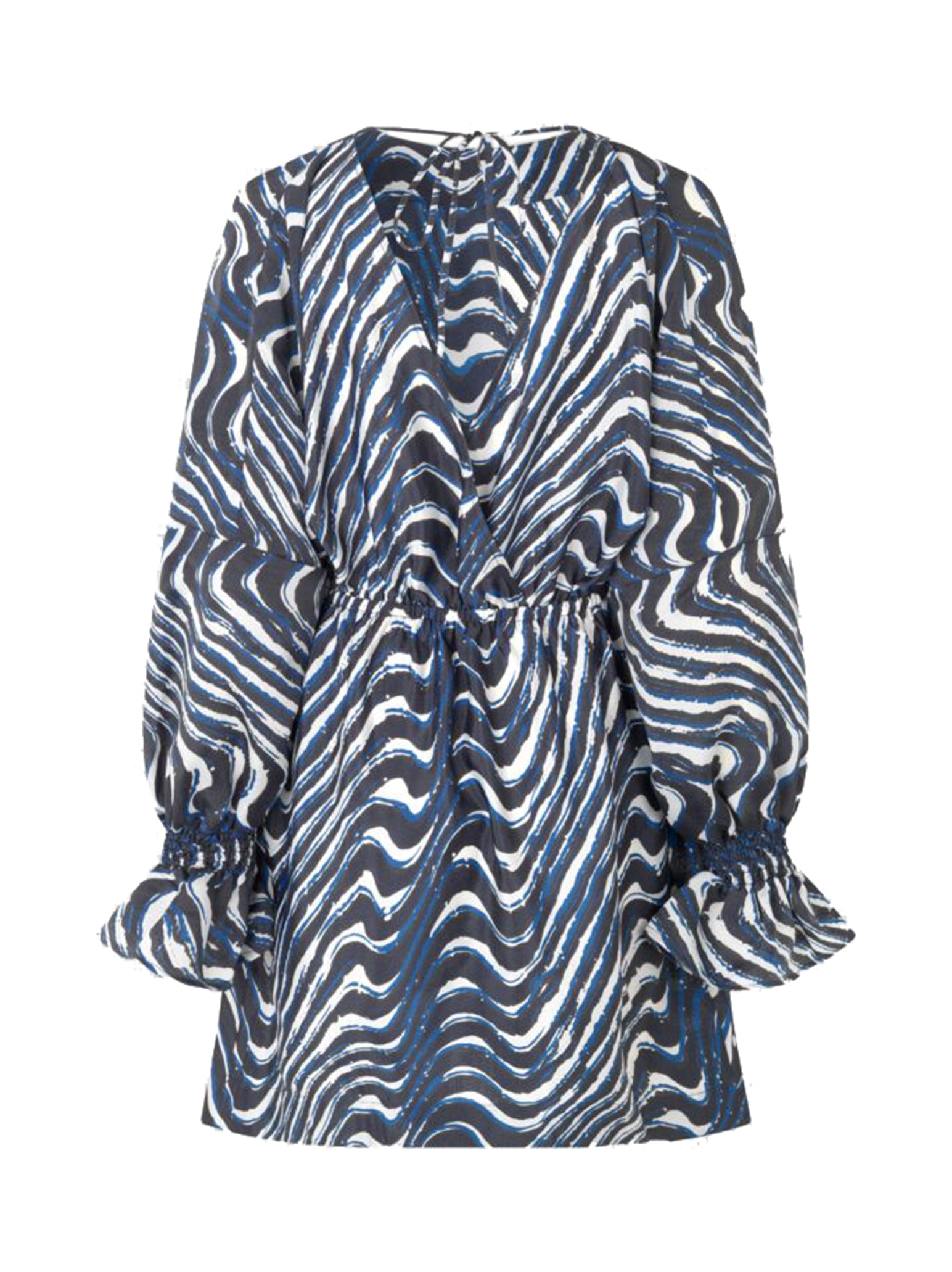 Made from recycled polyester, the Aemiley Dress in Blue Wave by Baum Und Pferdgarten is a light weight mini dress featuring batwing sleeves, elasticated waistline, and an open back with wrap-effect. Finished with a tie across the back, and a super flattering smocked waistline and ruffle cuffs.