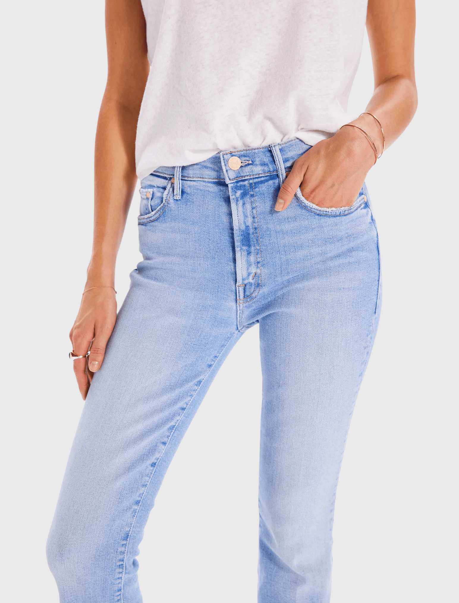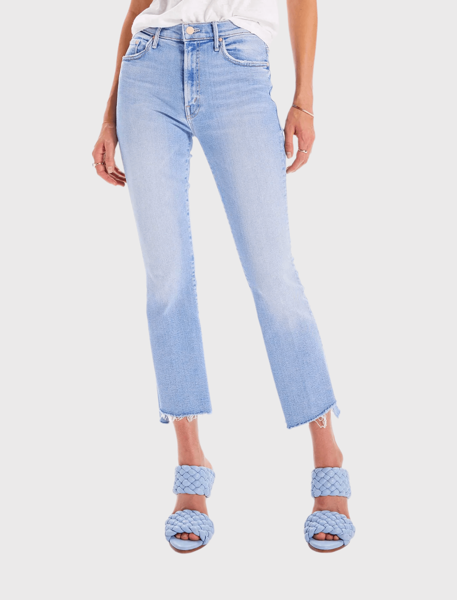 One of One, Number One, Only - UNIQUE. The Mother Denim Insider Crop Step Fray Jean in Limited Edition is a high-waisted bootcut with an ankle crop and a frayed step-hem. Cut from stretch denim, Limited Edition is a bright light blue wash with whiskering and fading throughout. Category? Bad Bitch.
