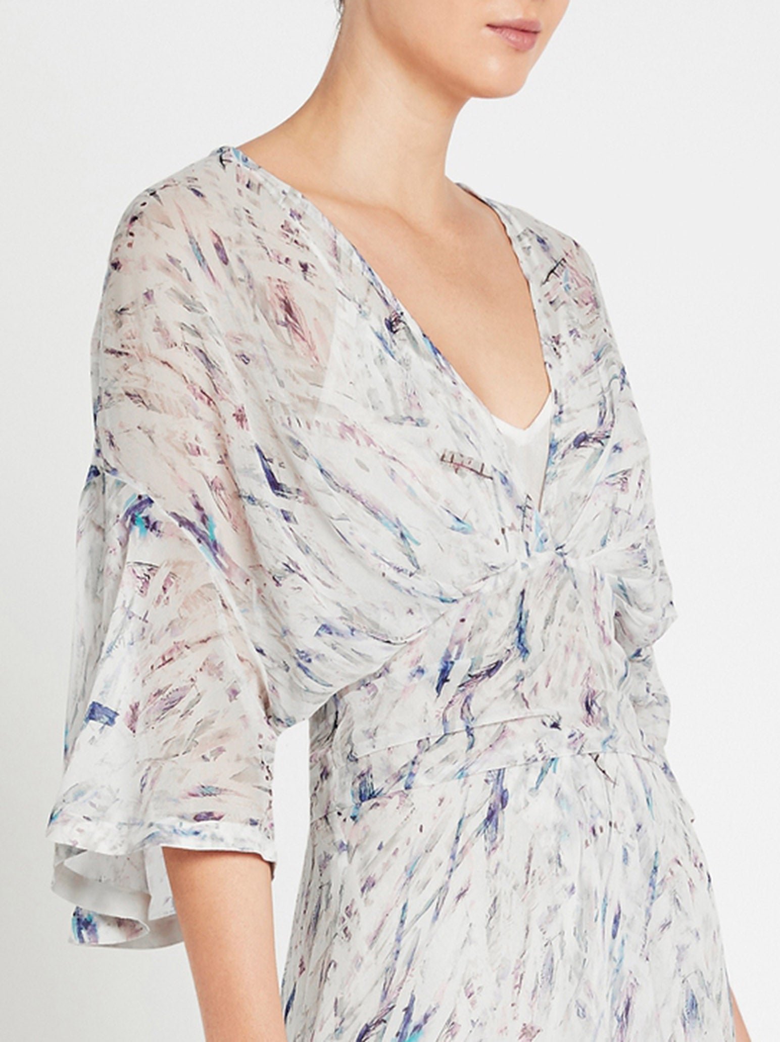 La Vie Boheme! Live your boho-chic reality in the IRO Pommie Dress in Blue. Bohemian inspired, this feather print dress features V neck with wide ruffle sleeves in light airy silk. Pair with sandals for a casual, romantic look.