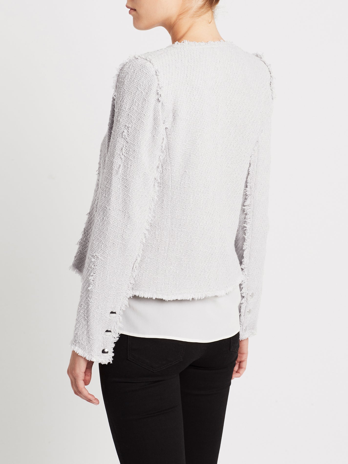 The sophisticated Iro Agnette button down jacket from IRO is back again, this time in the colour Light Grey. This coveted style has frayed edges and seams. Featuring a hidden zip and stud closure, shredded accents and shoulder padding, this collarless jacket is a must have wardrobe staple.