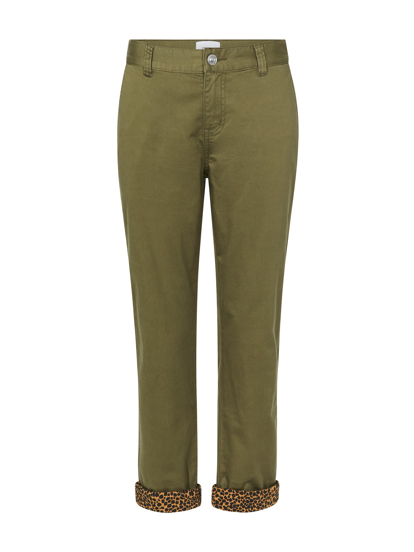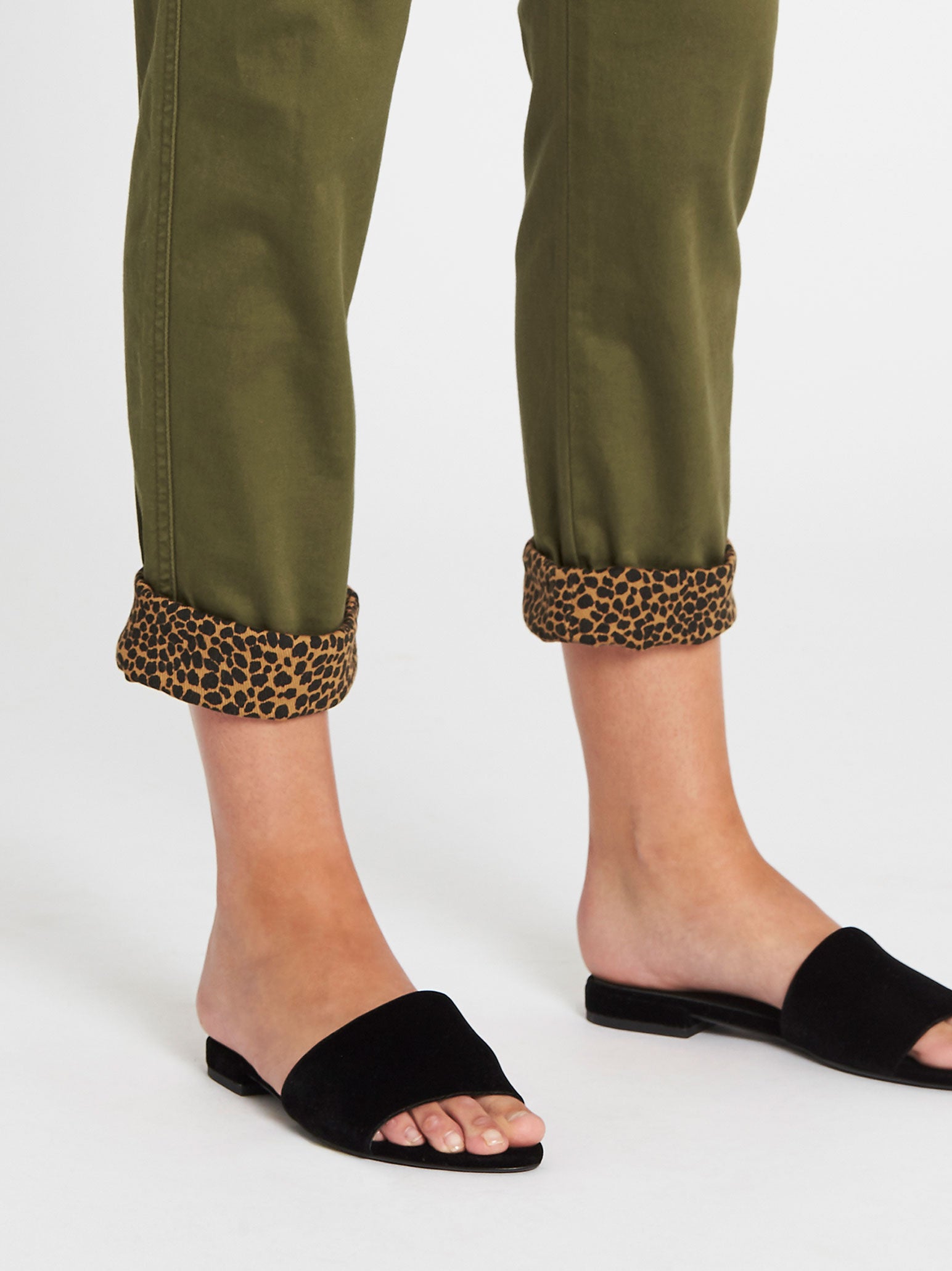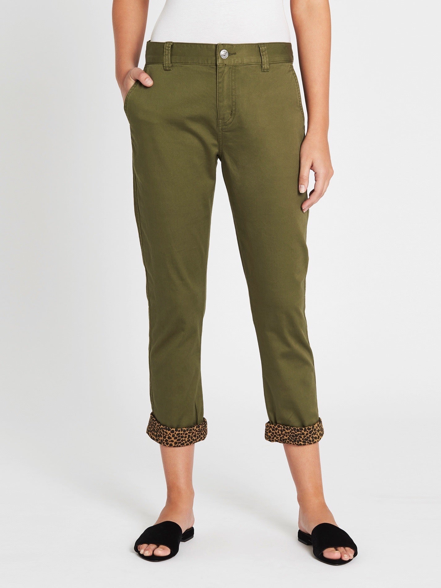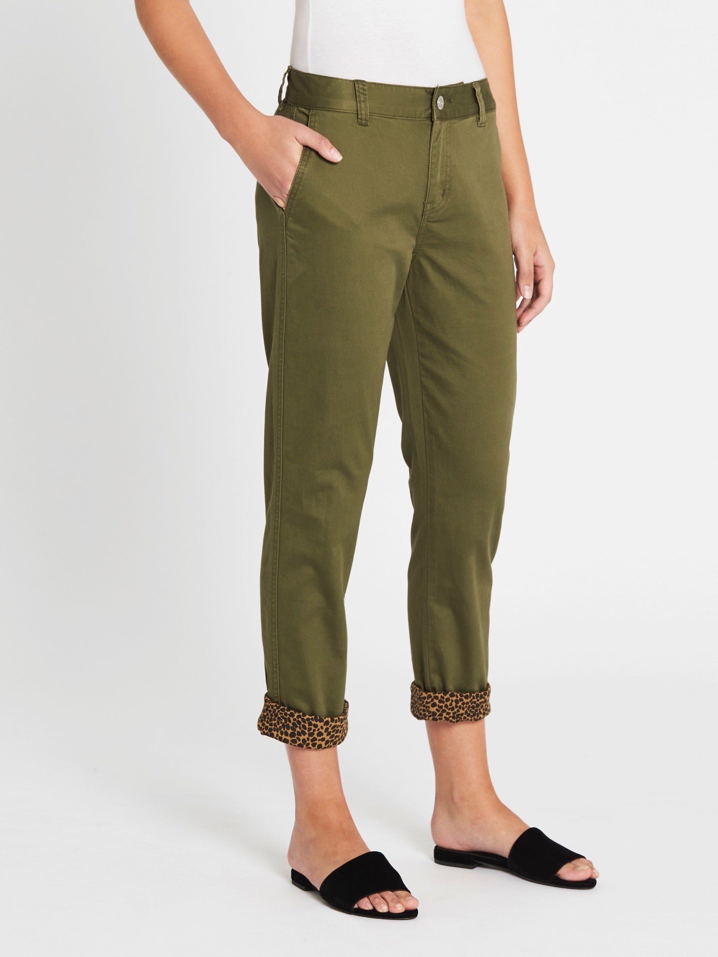 Stand tall in the Current Elliott Confidant Pant in Capulet Olive. Constructed from a utility-inspired chino these cropped tailored pants feature a centre front closure, side pockets and is finished with a leopard print lining shown off at the rolled ankles for a cool girl twist.