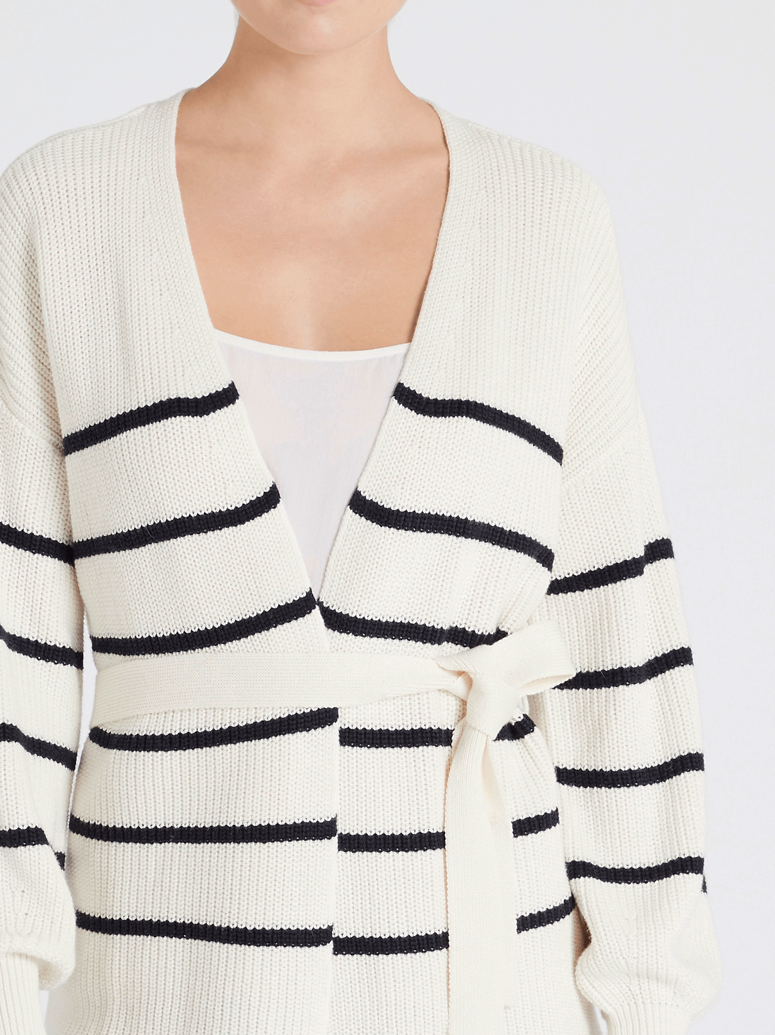 Get your hands on the perfect Chunky knit this cool season. The Chunky Wrap Cardigan in Off White Multi by Frame Denim has an open front with a self tie belt and is designed to wrap around the body for next level coziness. Featuring balloon sleeves, a curved hem and extended cuffs, the Frame Denim knit is a wear-with-everything style not to be missed.
