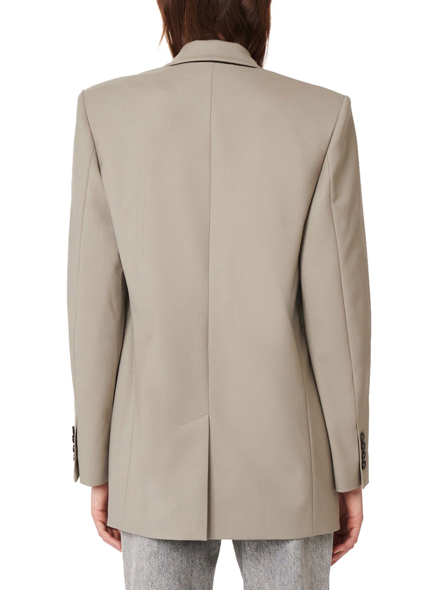The IRO Flemi Jacket in Taupe is a menswear inspired piece with structured shoulders and clean lines to add to the timeless elegance of this blazer. This is a wardrobe staple to be styled over everything from dresses to jeans.