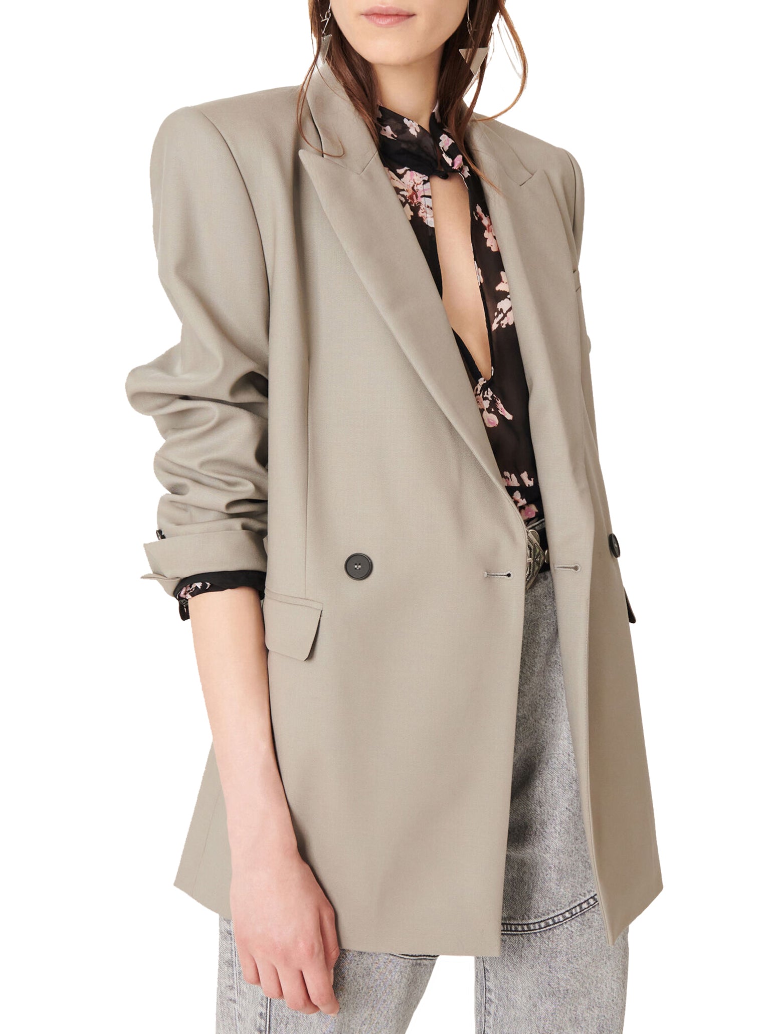The IRO Flemi Jacket in Taupe is a oversized style, size down for a firmer fit