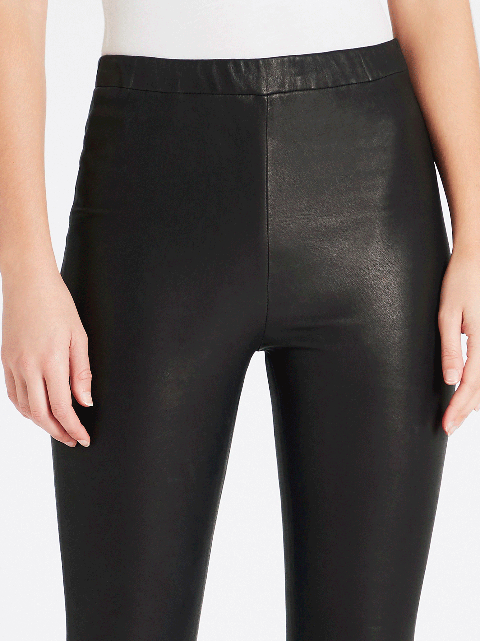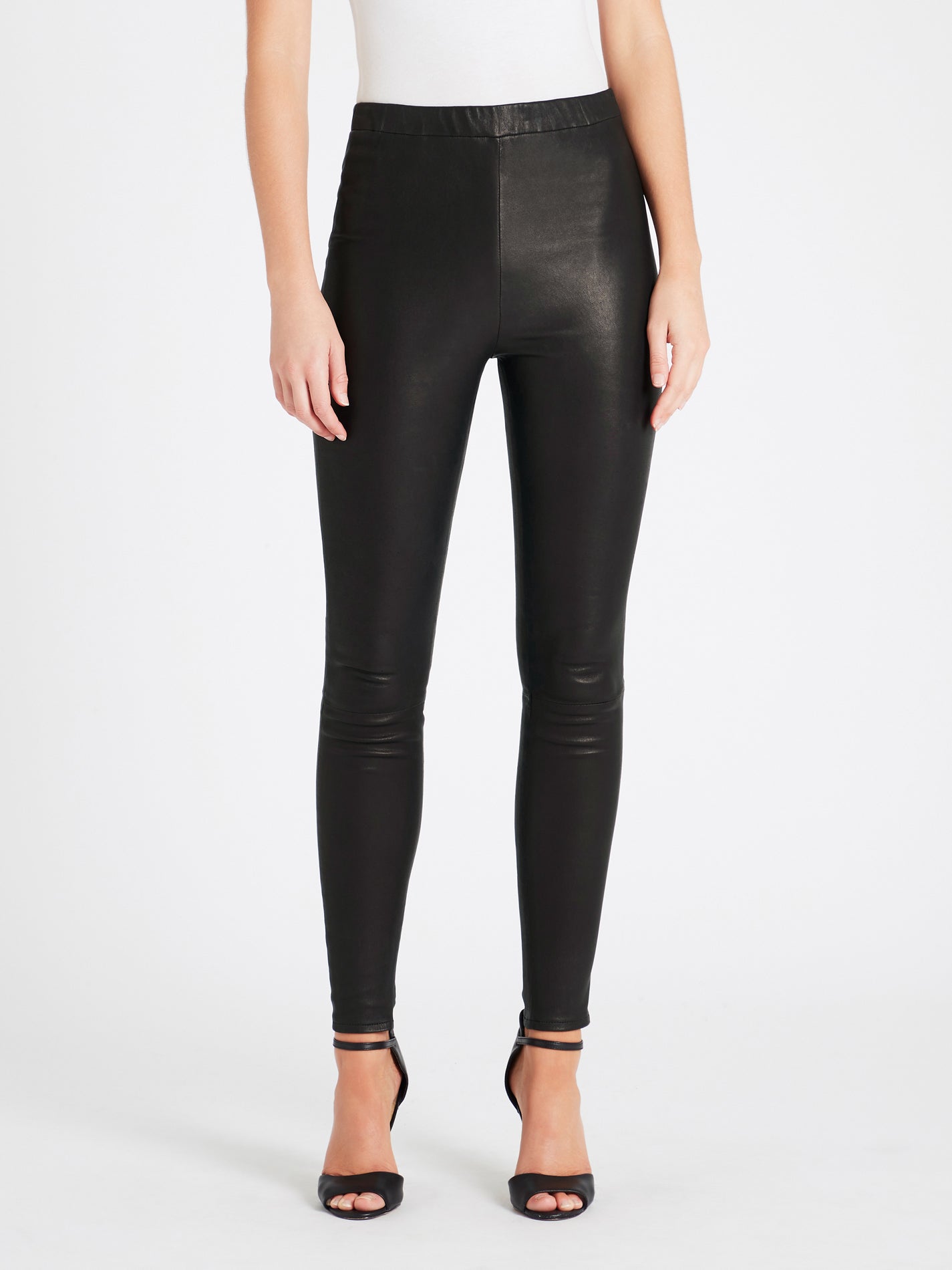 The Macey High Rise Pull On Leather Leggings in Black by J Brand are made from 100% Dyed Stretch Leather Lamb