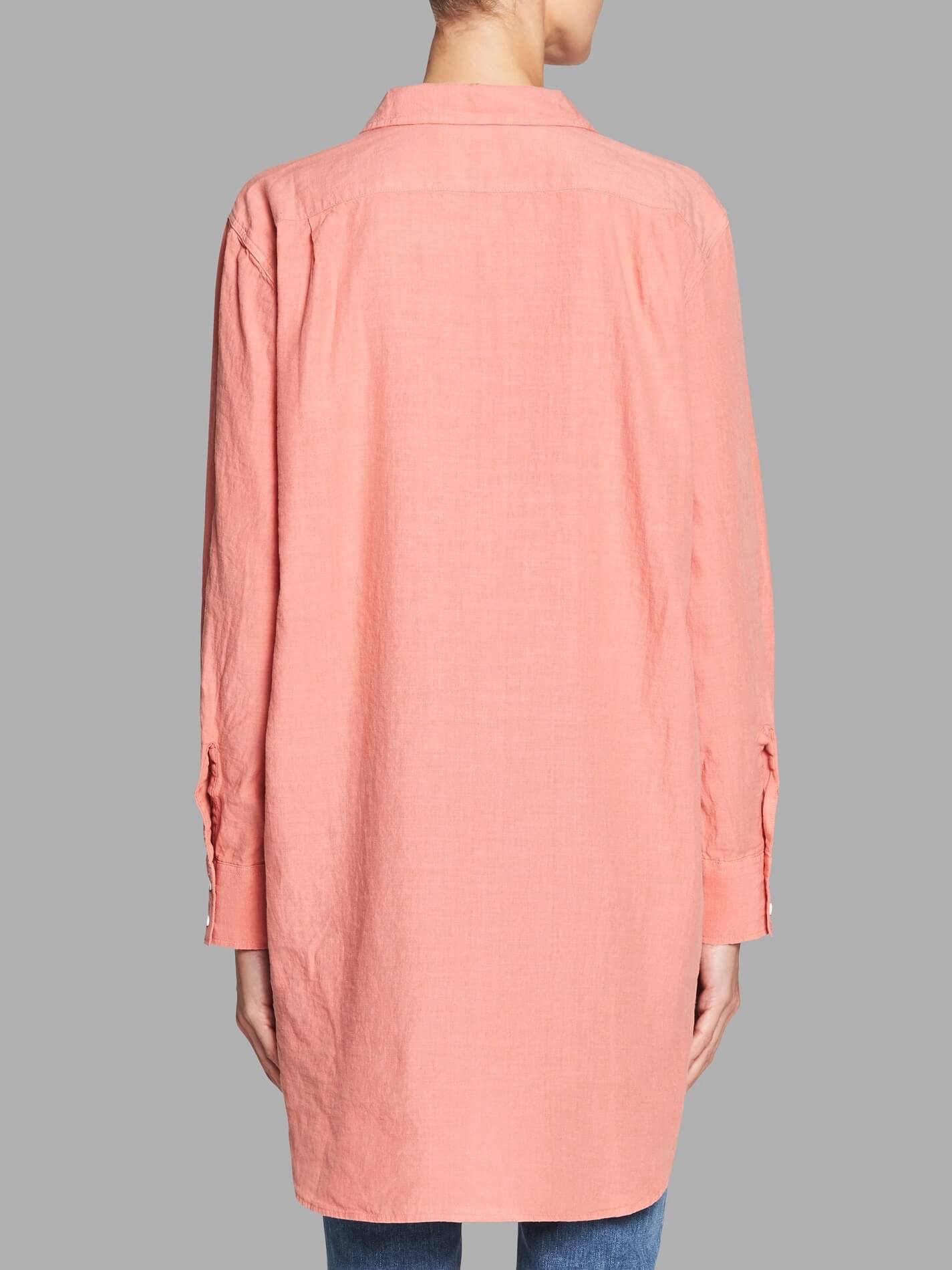 A linen and cotton blend, the M.i.h Jeans Oversize Shirt in Paper Pink is an oversize fit that features a folded collar, long sleeves, pleated darts at a back yoke, contrasting trims and a curved hem.