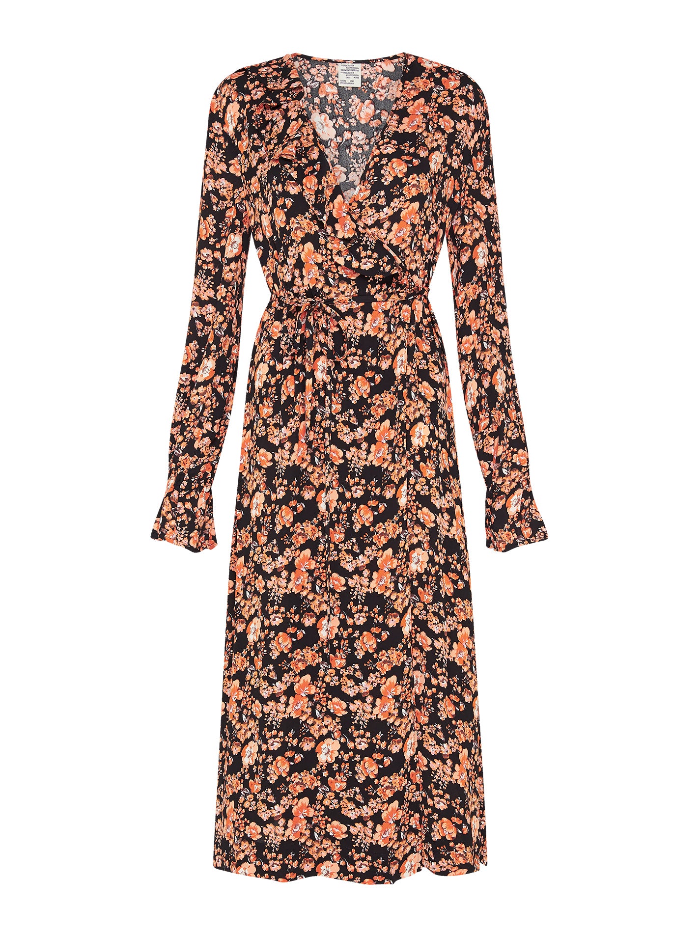Add a pop of colour to your summer wardrobe with the Baum Und Pferdgarten Annamay Dress in Peach Black Floral. This easy going wrap style midi dress features long sleeves, a v neckline with ruffle detailing and a head turning vibrant orange floral print. Team with black boots to complete the look.