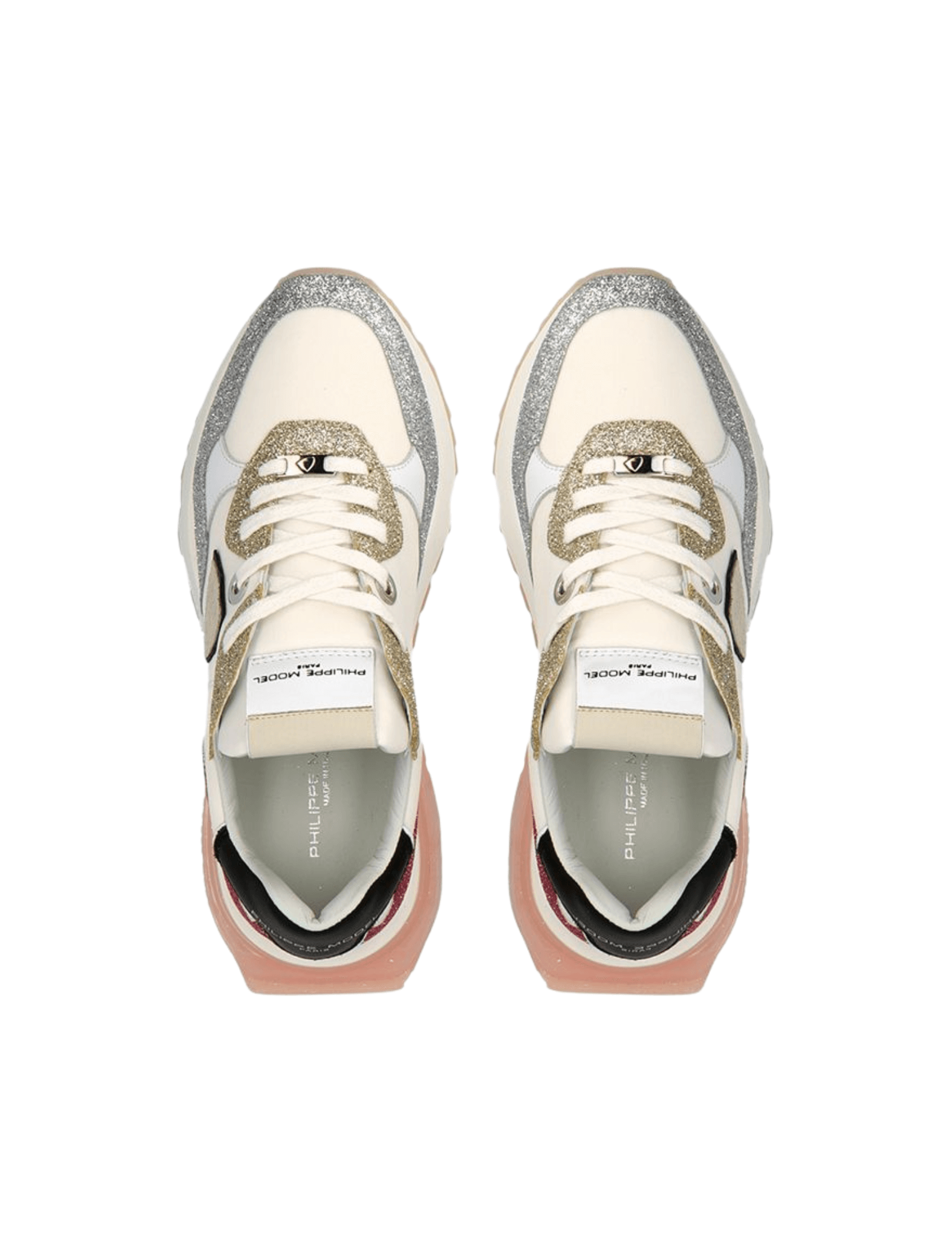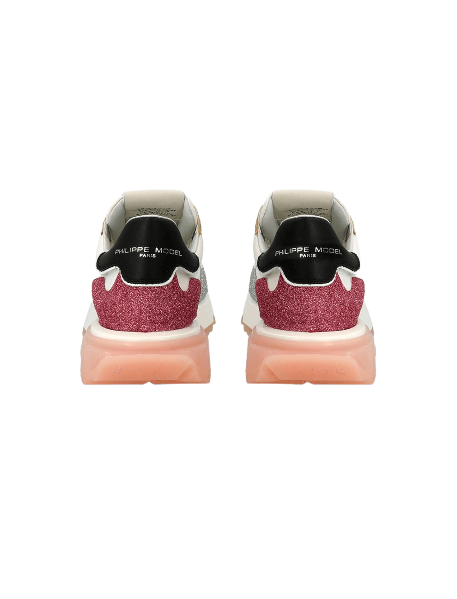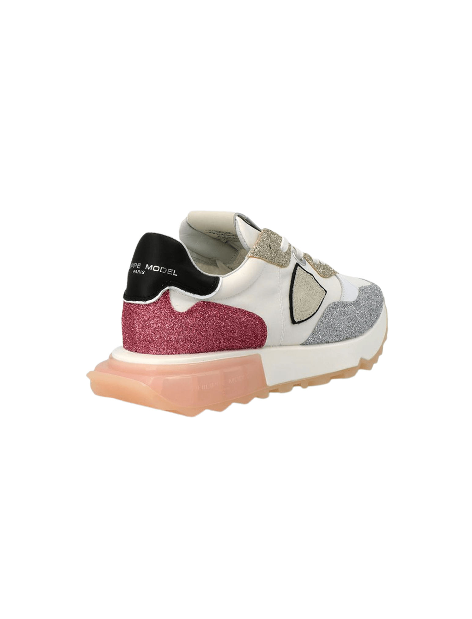 The Philippe Model La Rue Low Sneaker in Glitter Pop / Blanc Rose is made from 100% Nylon main, 100% Genuine Leather trim and inner with a Polyurethane foam with a TPU cushion sole