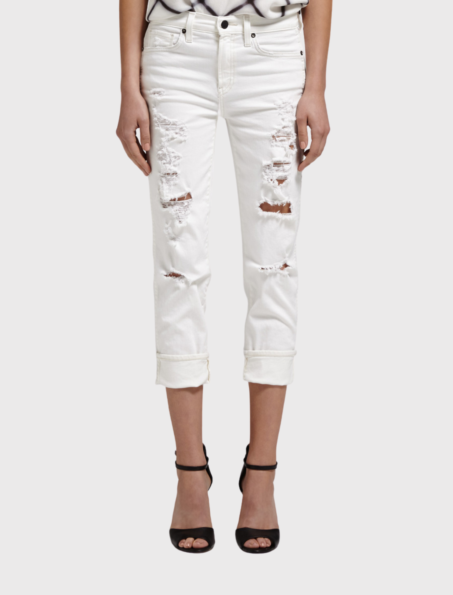 These Genetic Denim Birkin High Rise Straight Crop Jean are a straight leg cropped style jeans. They have a high rise of 9.5 inches and feature matte black hardware, destruction along the thigh and calf, and rip detail on the back right pocket.