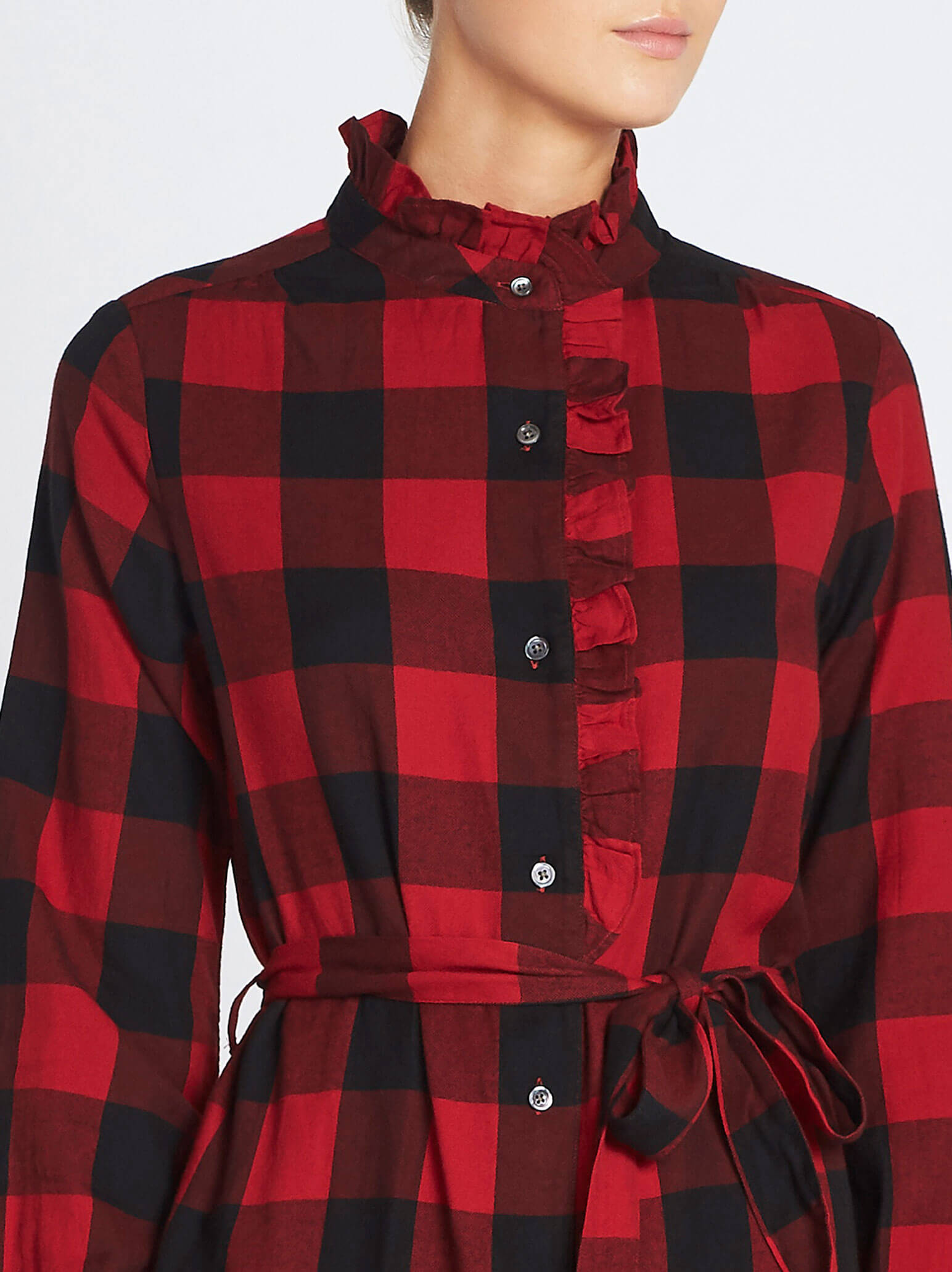 The Frame Denim Flannel Check Dress in Red Check is constructed from a red and black cotton flannel and features ruffle detailing around the collar and down the centre front button opening, long sleeves with ruffle edged cuffs and is finished with a self tie belt at the waist for cinching.