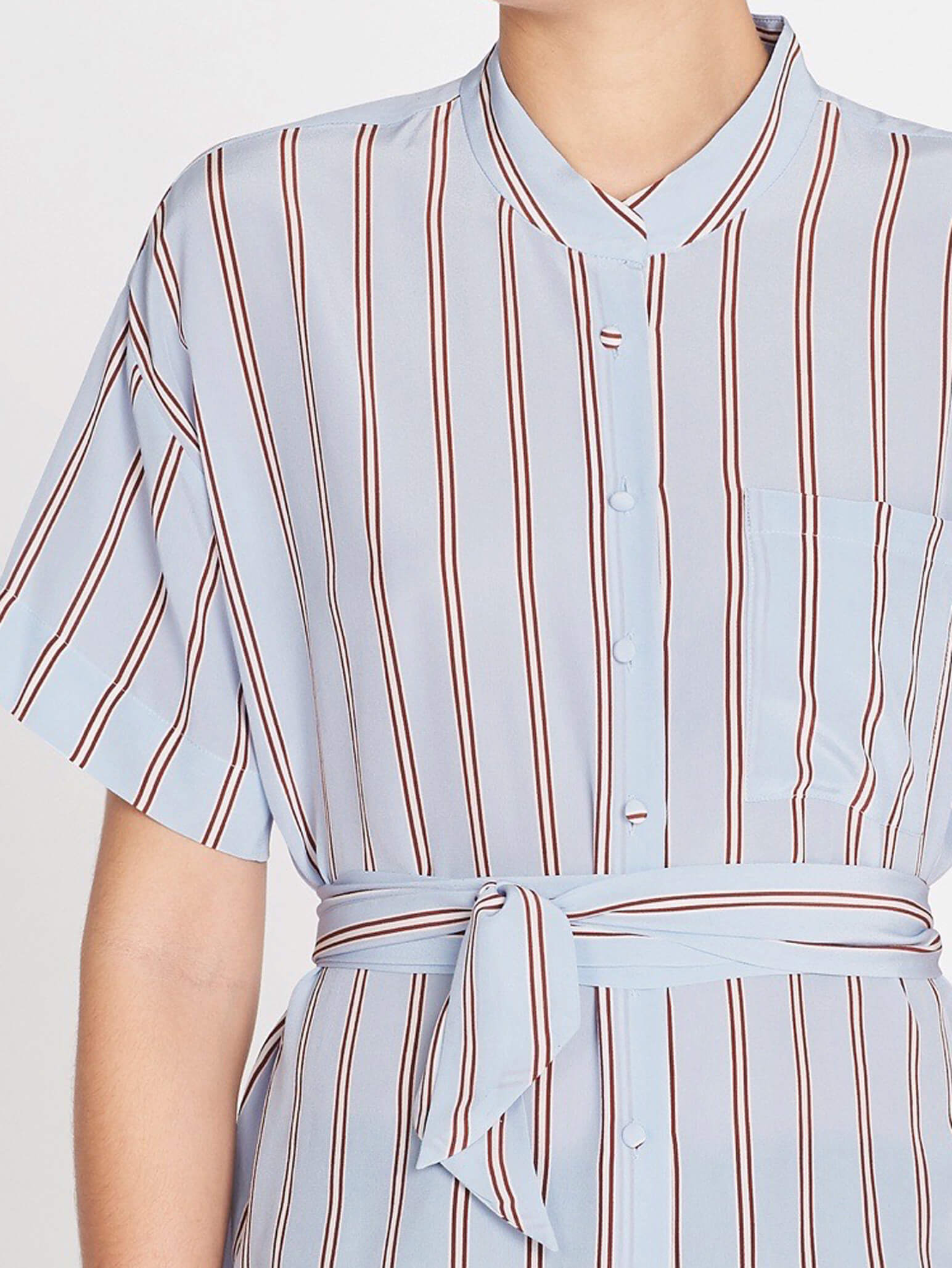 For a shirt that can go from work to play with ease look no further than the Frame Lounge Stripe Top. Constructed in 100% silk this shirt striped blue shirt features a collared neck, short sleeves, a patch breast pocket, centre front button opening and is finished with an ultra flattering wrap tie at the waist.