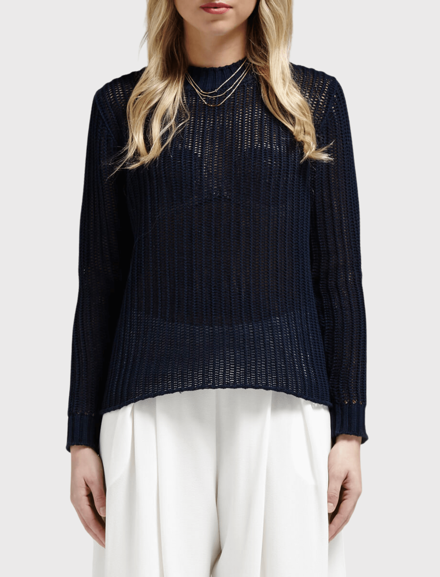 The Le Oversized Sweater in Navy is a loose style cable knit sweater from Frame Denim. This casual knit features a low mock turtle neck and fitted sleeves, match this piece back with a white jean or culottes for an effortless look.
