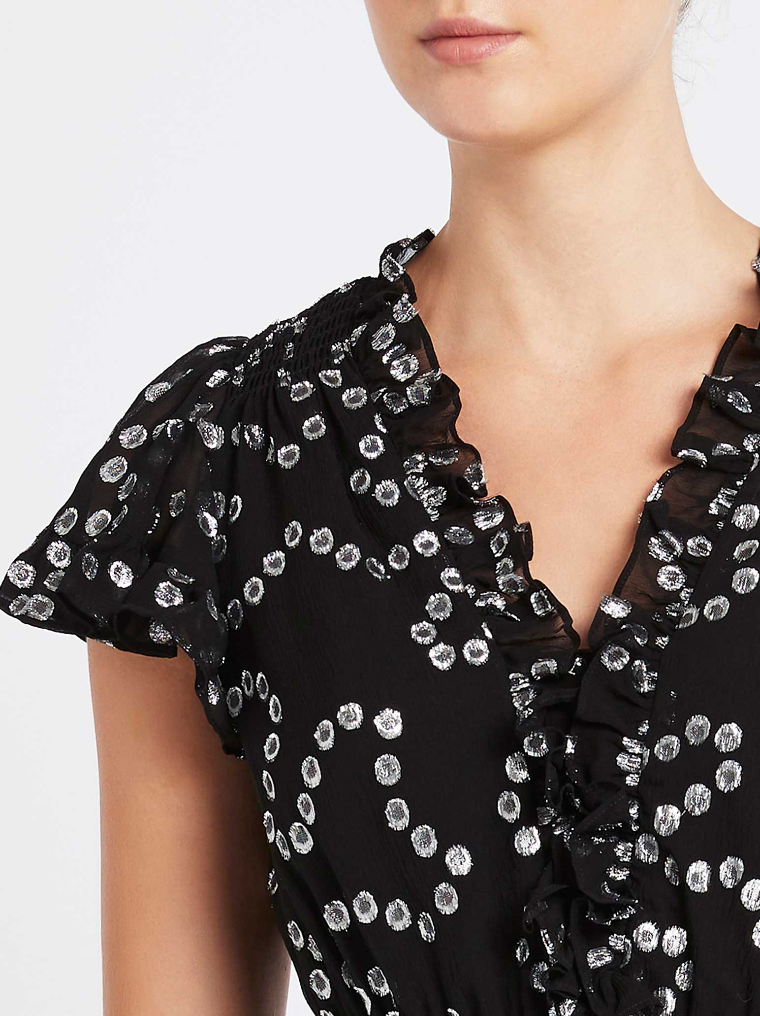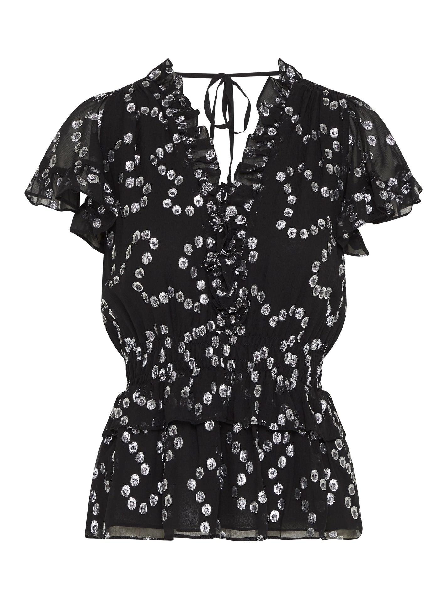 Add some glitter and shine to your wardrobe with the Nuage Metallic Chiffon Top in Black Gunmetal by Rebecca Taylor. Crafted from chiffon silk with a metallic blend, this peplum top features a v-neck and backline with ruffle detailing and a mesmerising silver lurux dot pattern and is finished with a ruffled elasticated waistline for a cinched in silhouette. This versatile top can be teamed with a tailored pant and blazer or add a bit of glam to your noir denim.