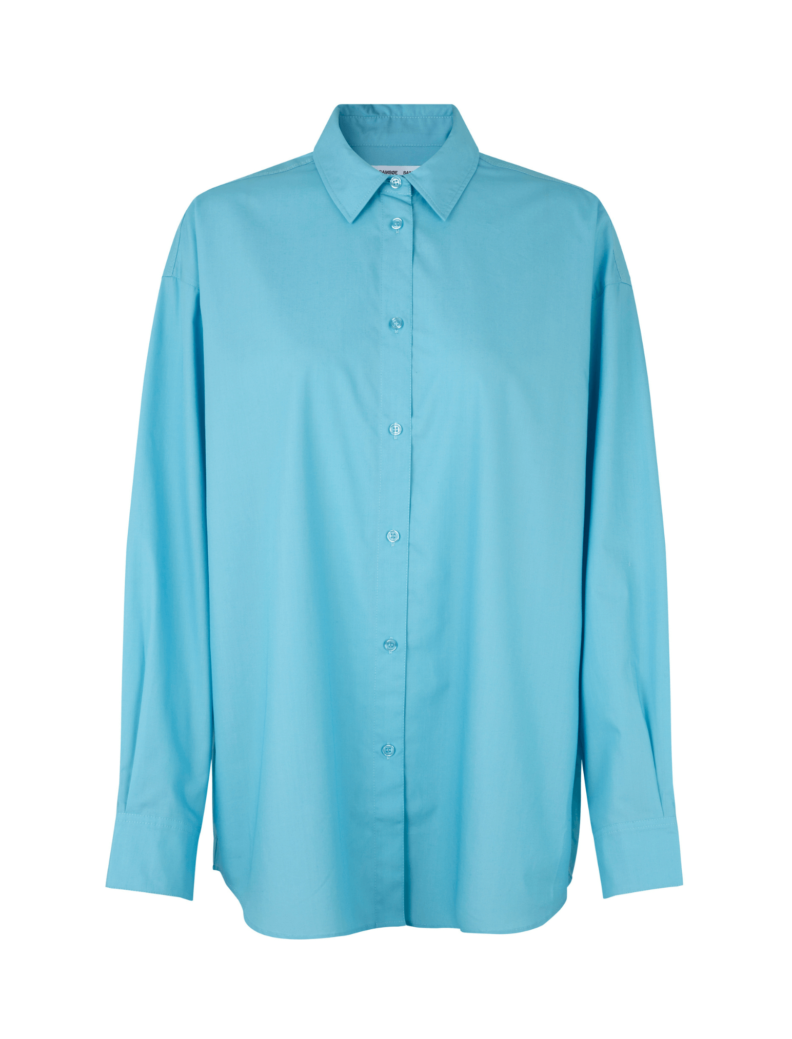 The Samsoe Samsoe Lua Oversized Button Down Shirt in Topaz Blue designed to be oversized, take 1 size down for a firmer fit