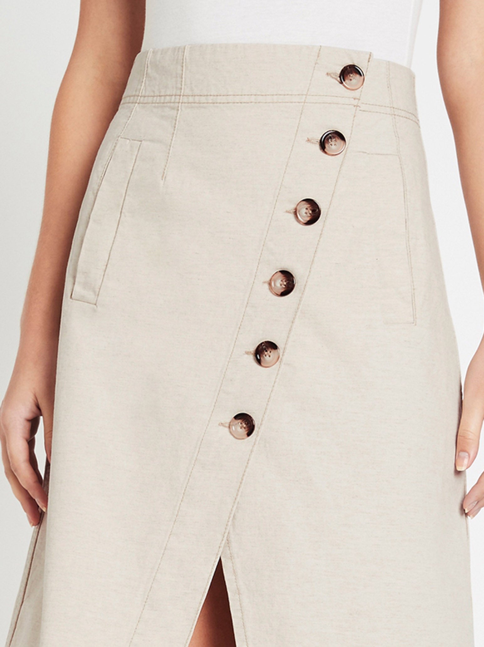 It's all in the details, the Baum Und Pferdgarten Savannah Skirt in Creamy Beige speaks comfort and style. Constructed from a cotton linen blend, this midi skirt features an asymmetric button front with duel side pockets and is finished a split front opening. Team back with a simple tee and sneakers for a timeless weekend ready look.